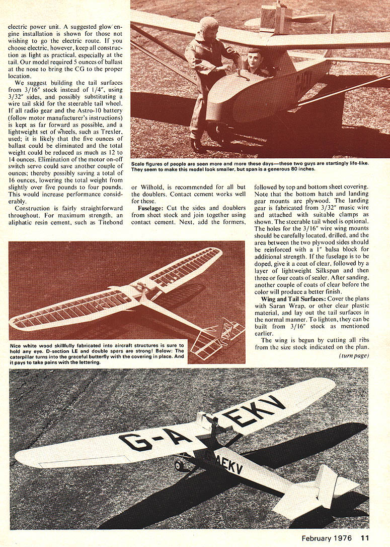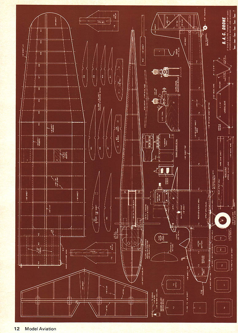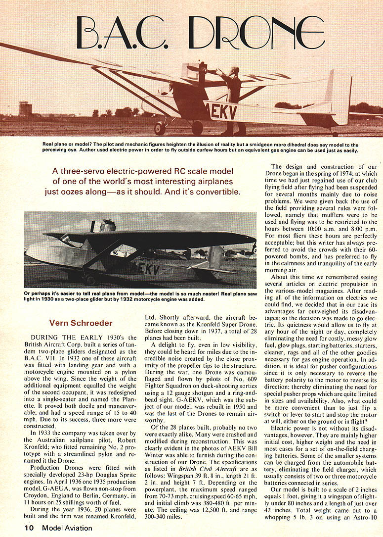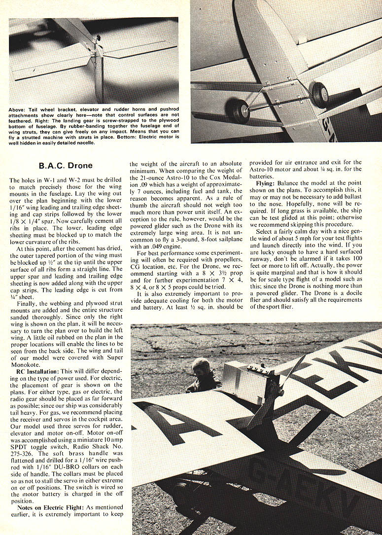 Real plane model pilot mechanic figures heighten illusion reality smidgeon dihedral does say model perceiving eye Author used electric power order fly outside curfew hours equivalent gas engine can used just easily three-servo electric-powered RC scale model worlds interesting airplanes just oozes alongas should its convertible Vein Schroeder DURING THE EARLY 1930s British Aircraft Corp built series tan dem two-place gliders designated BAC VII 1932 aircraft fitted landing gear motorcycle engine mounted pylon above wing Since weight additional equipment equalled weight second occupant redesigned single-seater named Plan ette proved both docile maneuver able speed range 15 40 mph Due its success three constructed 1933 company taken over Australian sailplane pilot Robert Kronfeld fitted remaining No 2 pro totype streamlined pylon re named Drone Production Drones fitted specially developed 23-hp Douglas Sprite engines April 1936 1935 production model G-AEUA flown non-stop Croydon England Berlin Germany 11 hours 25 shillings worth fuel During year 1936 20 planes built firm renamed Kronfeld Ltd Shortly afterward aircraft came known Kronfeld Super Drone Before closing down 1937 total 28 planes built delight fly low visibility could heard miles due credible noise created close prox imity propeller tips structure During war Drone camou flaged flown pilots No 609 Fighter Squadron duck-shooting sorties using 12 gauge shotgun ring-andbead sight G-AEKV sub ject model rebuilt 1950 last Drones remain air worthy 28 planes built probably no two exactly alike crashed modified during reconstruction clearly evident photos AEKV Bill Winter able furnish during con struction Drone specifications listed British Civil Aircraft follows Wingspan 39 ft 8 length 21 ft 2 height 7 ft Depending powerplant maximum speed ranged 70-73 mph cruising speed 60-65 mph initial climb 380-480 ft per min ute ceiling 12500 ft range 300-340 miles design construction Drone began spring 1974 time just regained use club flying field after flying suspended several months mainly due noise problems given back use field providing several rules fol lowed namely mufflers used flying restricted hours between 1000 am 800 pm fliers hours perfectly acceptable writer has always pre ferred avoid crowds 60powered bombs has preferred fly calmness tranquility early morning air About time remembered seeing several articles electric propulsion various model magazines After read ing information electrics could find decided case its advantages far outweighed its disadvan tages decision made go elec tric Its quietness would allow us fly hour night day completely eliminating need costly messy glow fuel glow plugs startingbatteries starters cleaner rags other goodies necessary gas engine operation ad dition ideal pusher configurations since necessary reverse battery polarity motor reverse its direction thereby eliminating need special pusher props quite limited sizes availability Also what could convenient just flip switch lever start stop motor will either ground flight Electric power its disad vantages however mainly higher initial cost higher weight need cases set on-the-field charg ing batteries Some smaller systems can charged automobile bat tery eliminating field charger usually consists two three motorcycle batteries connected series model built scale 2 inches equals 1 foot giving wingspan slight ly under 80 inches length ofjust over 42 inches Total weight came out whopping 5 lb 3 oz using Astro-lO 10 ModelAviation ur perhaps Its easier tell real plane trom modelthe model much neateri Heal plane saw light 1930 two-place glider 1932 motorcycle engine added electric power unit suggested glow en gine installation shown wishing go electric route choose electric however keep construc tion light practical especially tail model required 5 ounces ballast nose bring CG proper location suggest building tail surfaces 3/16 stock instead 1/4 using 3/32 sides possibly substituting wire tail skid steerable tail wheel radio gear Astro-lO battery follow motor manufacturers instructions kept far forward possible lightweight set wheels such Trexler used likely five ounces ballast could eliminated total weight could reduced much 12 14 ounces Elimination motor on-off switch servo could save another couple ounces thereby possibly saving total 16 ounces lowering total weight slightly over five pounds four pounds would increase performance consid erably Construction fairly straightforward throughout maximum strength aliphatic resin cement such Titebond Wilhold recommended doublers Contact cement works well Fuselage Cut sides doublers sheet stock join together using contact cement Next add formers followed top bottom sheet covering Note bottom hatch landing gear mounts plywood landing gear fabricated 3/32 music wire attached suitable clamps shown steerable tail wheel optional holes 3/16 wire wing mounts should carefully located drilled area between two plywood sides should reinforced balsa block additional strength fuselage doped give coat clear followed layer lightweight Silkspan three four coats sealer After sanding another couple coats clear before color will produce better finish Wing Tail Surfaces Cover plans Saran Wrap other clear plastic material lay out tail surfaces normal manner lighten can built 3/16 stock mentioned earlier wing begun cutting ribs th size stock indicated plan turn page February 1976 11 Scale figures people seen more daysthese two guys startingly life-like seem make model look smaller span generous 80 inches Nice white wood skillfully fabricated aircraft structures sure hold eye 0-section LE double spars strong Below caterpillar turns graceful butterfly covering place pays take pains lettering 12 Model Aviation BAC Drone holes W-l W-2 must drilled match precisely wing mounts fuselage Lay wing out over plan beginning lower / 16 wing leading trailing edge sheet ing cap strips followed lower 1/8 X 1/4 spar Now carefully cement ribs place lower leading