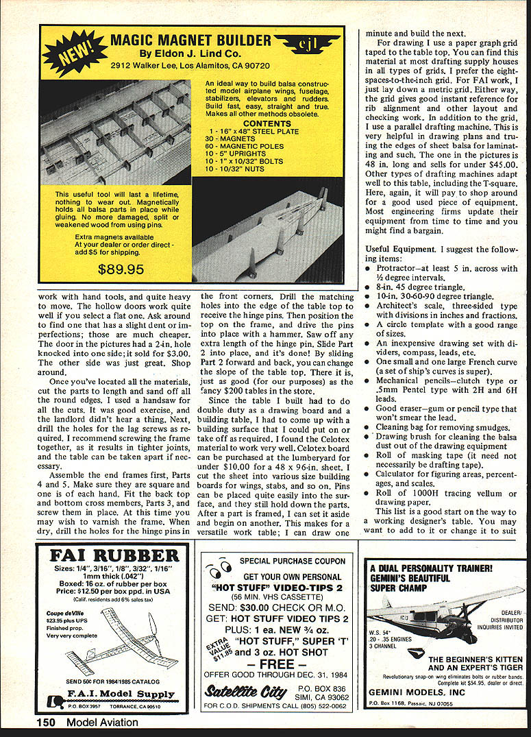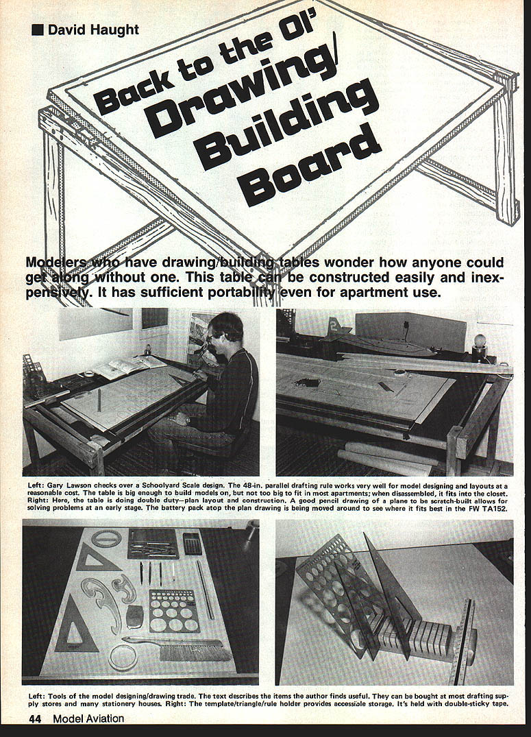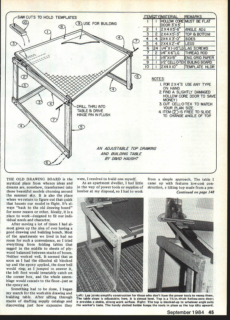 U David Haught r 4 Mave drawings wonder anyone could githout tae constructed easily inex pe has sufficient portabyen apartment use Left Gary Lawson checks over Schoolyard Scale design 48-in parallel drafting rule works very well model designing layouts reasonable cost table big enough build models too big fit apartments disassembled fits closet Right Here table doing double dutyplan layout construction good pencil drawing plane scratch-built allows solving problems early stage battery pack atop plan drawing being moved around see fits best FW TA152 Left Tools model designing/drawing trade text describes items author finds useful can bought drafting sup ply stores stationery houses Right template/triangle/rule holder provides accessiale storage Its held double-sticky tape 44 Model Aviation SAW CUTS TO HOLD TEMPLATESITFMIOTY MATFRIAIPFMAPI \\ 34 V / DRILL THRU INTO TABLE S DRIVE HINGE PIN IN FLUSH aL J. IHOLLOW GORE MUST BE FLAT DOOR 3X5 2ANGLE ADJ 32F~TOP SBO1TOM 442X4X3-OSIDES 542X4X2-4LEGS 624I VI2L LAG SCREWS 721/4 X 6LGTHREAD ROD 8I2~II~ NG GRID PAPER 7 LO-TI BULING BOARD 10I2X4X 10TEMPLATE HLDR NOTES I FOR 2X4S USEANY TYPE ON HAND a FIND SLIGHTLY DAMAGED HOLLOW CORE DOOR TO SAVE MONEY 3 CUT CELLO-TEX TO MATCH YOUR PLAN SIZE 4 ITEM IS FREE TO SLIDE TO CHANGE ANGLE OF TOP ADJUSTABLE TOP DRAWING AND BUlL DING TABLE BY DAVID HAUGJ/T THE OLD DRAWING BOARD mystical place whence ideas dreams somehow transformed beautiful models churning around summer sky also place return figure out quirk haunts model flight Its al ways back old drawing board some reason other Ideally place workdesigned fit indi vidual needs character After moving lot times al given up idea ever having good drawing building bench Most apartments lived no room such convenience tried everything folding tables sagged middle sheets ply wood balanced between stacks boxes Neither worked well seemed soon dihedral blocked up epoxy applied door bell would ring jumped answer left foot would invariably catch corner box whole assem blage would cascade floorjust epoxy set Something done began search workable drawing building table After sifting through stacks drafting supply catalogs discovering just expensive resolved build myself As apartment dweller little way power tools supplies lumber disposal work simple approach table came up features low-cost con struction tilting top made pre Continued page 148 September 1984 45 2 Left Lap joints simplify construction dont have power tools recess table slope adjustable almost level Top 1Y2-in-thick hollow-core door provides stable strong work surface Right top blocked-up whatever angle suits workers taste handy slotted holder keeps tools place top tilts upward shown times before Its out pro duction everyone should have some kind field strength meter Capture Ratio FM test peculiarity FM receiver stays tuned its control trans mitter signal until another similar trans mitter exactly same radio frequen cy presents stronger signal time control transfers interfering transmitter control transmitter set up 30 feet airplane receiver ground system turned ON interfer er must similar FM transmit ter sent further away turned ON test operator walks interferer until receiver captured relative distances between plane transmitters noted Monitoring Using John Lange con verter has described column several times check envi ronment see what flying usually sweep way across band before testing starts again after finished have some unex plained funnies Discussion jest results OK now have idea Kraft Synthesized SRF Switchable Radio Frequency sys tems tested want know results nutshell Kraft ready 1984 right now ready 1991 gets theyre also ready year between SRF systems passed tests No problems found used required AMA Phase-In Plan SRF 10-sanctionedRC-channel system because cant ac cess old frequencies 7208-7296 7564 MHz accesses new sanc tioned RC channels RCl2 RC38 RC42 RC44 RC46 RC48 RC5O RC52 RC54 RC56 technical reasons can use RC4O Ten channels adequate situations think have will become 22-sanctioned-RC-channel system December 20 1987 requiring anything make changes SRF modules date use old RC frequencies will cease AMA will activate RCl4 RCl6 RCl8 RC20 RC22 RC24 RC26 RC28 RC3O RC32 RC34 RC36 places aircraft December 20 1990 Kraft SRF will become 49-sanctioned-RC-channel system again requiring take action used SRF system channel adjacent existing old fre quency eg using 72250 MHz old Red/White 72240 MHz found SRF precise Kraft sets within 100 Hz marked frequen cy narrow-banded SRF system wont interfere suffer terference old system consider legal crystal toler ance old system can put 1800 Hz off its nominal frequency remember channel spacing talking about 10000 Hz result pretty clear ly shows SRF isnt threat some people took curiosity illustrating precision Kraft SRF system has noted several people Kraft SRF transmitter part FM system uses same KPR-8FD re ceiver reported last year often will fly crystal-controlled KPR-8FD receiver same channel RC52 case reason given specially-chosen matched pairs crystals Kraft used last year best available time werent precise enough match precisiontuning narrow-band SRF transmit ters What does tell about potential making interference synthesized transmitter Meanwhile should bear mind AMA Phase-In Plan considers other forms mutual interference well tested SRF systems did produce some ticipated interferences although very reduced level AMA-sanctioned MERICAN JUNIOR AJI Balsa Model Airplanes Whip-power U-Control Flrebaby II 020-049 Jr Fireball 049-090 OMING SOON -404 Interceptor Folding Wing Glider See favorite hobby dealer Write American Jr Heritage Models Inc PO Box 505 Donald Oregon 97020 channels chosen avoid prob lems AMA Phase-In Plan will followed through 1990 scheduled reason Conclusions tests tell us want Kraft SRF system planes Image-frequency problems RC band disappear can forget about traveling distant site find radio have plane cant used because local interference No stan