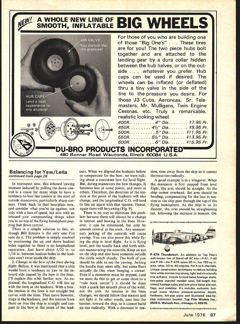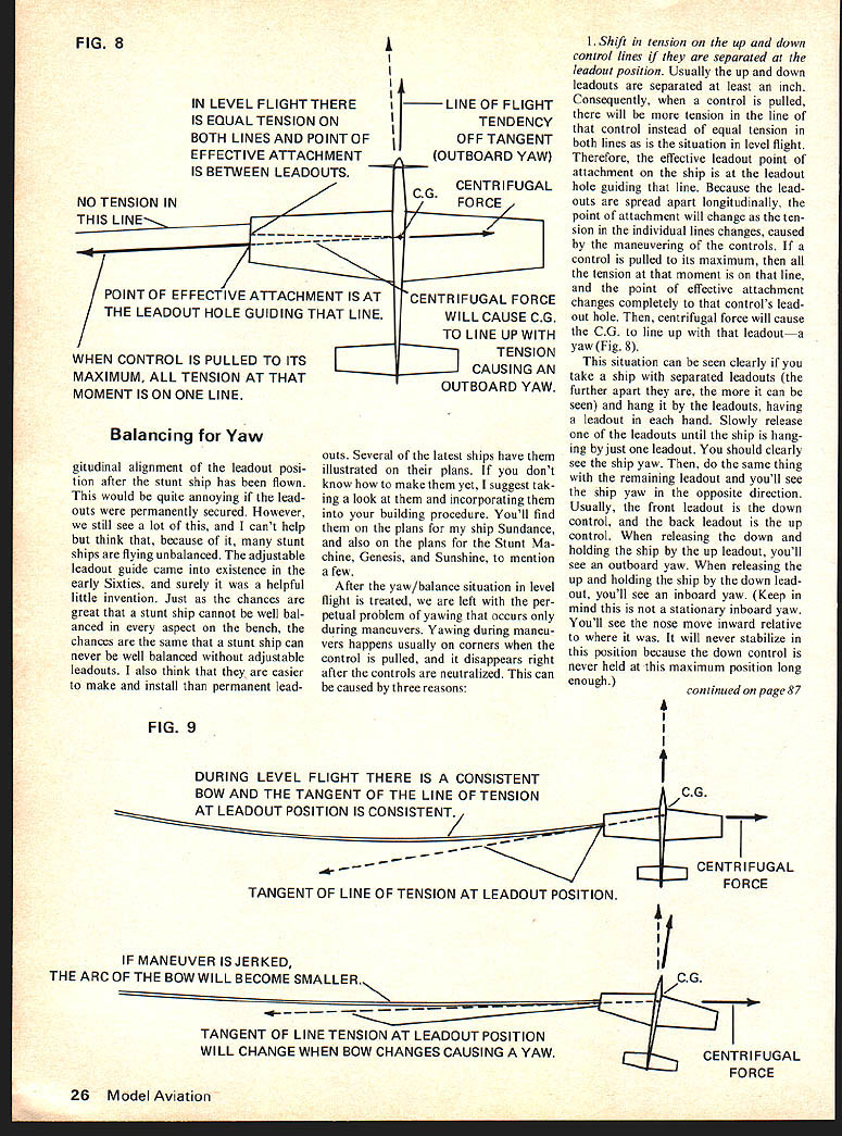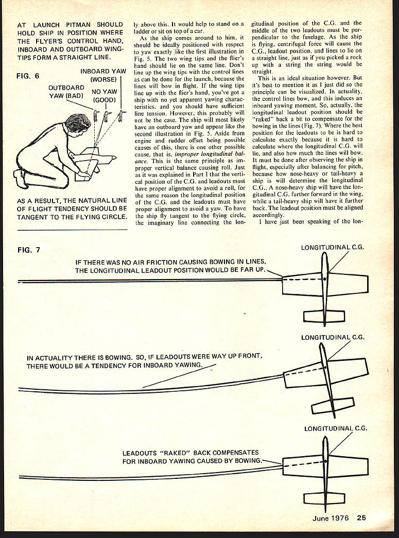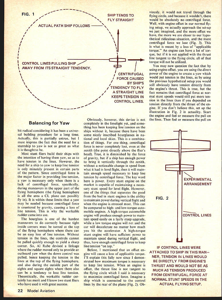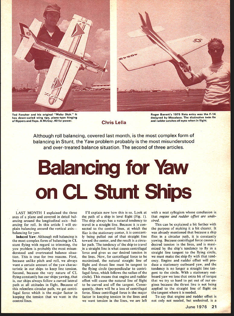 Chris Lella Although roll balancing covered last month complex form balancing Stunt Yaw problem probably misunderstood over-treated balance situation second three articles Balancing Yaw CL Stunt Ships LAST MONTH explained three axes plane covered detail bal ancing around longitudinal axis bal ancing roll article will ex plain balancing around vertical axis balancing yaw Induced Yaw Although roll balancing complex form balancing CL stunt flying regard trimming yaw problem probably misun derstood overtreated balance situa tion true two reasons First because unlike pitch roll always want certain amount yaw charac teristic ships keep line tension Second because very nature CL flying constantly has ships yawing ships always follow curved lateral path attitudes flight Because relentless circular path get centri fugal force major factor keeping tension want control lines Ill explain now Look path ship level flight Fig ship always has natural tendency travel straight line Because con nected control lines flier stationary center constant ly being pulled out straight line toward center result circu lar path tendency ship travel straight line what causes centrifugal force gives us desired tension lines Now centrifugal force maximized natural straight line flight thrust line must tangent flying circle perpendicular centri fugal force follows radius circle means engine rudder offset will cause natural line flight curved off tangent Conse quently will loss centrifugal force Since centrifugal force major factor keeping tension lines want tension lines left neat syllogism conclusion engine rudder offset unde sired can explained bit further purpose making bit clearer already mentioned because ship flies circular path constantly yawing Because centrifugal force causes desired tension lines maxi mized ships tendency fly straight line tangent flying circle must make ship fly tend ency Engine rudder offset will pro duce stationary outboard yaw tendency no longer straight line tan gent circle stationary out board yaw lose extra bit torque try hard get out en gines because thrust line being applied straight line flight tangent needed say engine rudder offset needed undesired June 1976 21 Ted Fancher original Moby Dick has downcurled wing tips pianotype hinging flippers flaps McCoy 40 power Roger Barretts 1975 Nats entry F-14 designed Macaluso distinctive twin fin rudder catches eyes flight FIG1 N N 4/ ACTUAL PATH SHIP FOLLOWS / CONTROL LINES PULLING SHIP AWAY FROM ITS STRAIGHT TENDENCY N N SHIP TENDS TO FLY STRAIGHT / / CENTRIFUGAL FORCE CAUSED / BYSHIPS / TENDENCY TO FLY ASTRAIGHT LINE KEEPS TENSION IN CONTROL LINES N ncing Yaw bit radical considering has univer sal building procedure long time Actually partially untrue must impress fact need stuntship yaw great what thought Most stunt fliers build ships intention having yaw have tension lines However need ship yaw keep line tension minutely present certain parts pattern Since centrifugal force major factor providing line tension yaw necessary lack centrifugal force specifically during maneuvers upper part flying hemisphere flying hemisphere area CL plane can possibly fly within limits yaw may needed because centrifugal force countered gravity causing loss line tension workable rudder came use hourglass hardest maneuvers correctly because tight inside corners must turned top flying hemisphere can easy loss line tension Without tension lines controls cannot pulled quickly enough yield sharp corner So Al Rabe devised linkage rudder moved provide outboard yaw down control pulled hence keeping tension lines top flying hemisphere also during outside part eights square eights also can tendency lose line tension Theoretically workable rudder cer tainly has merit know two stunt fliers have used great success Obviously however device completely limelight yet some thing has keeping line tension ships because have some nicely inscribed hourglasses na tional local skies combina tion things thing centrifugal force never completely lost zenith point directly above fliers head True diminished force gravity ship has enough power bring vertically through zenith noticeable change speed what level flight will main tain enough speed necessary keep line tension centrifugal force key word power stunt engine market capable maintaining neces sary stunt speed level flight However things separates good bad stunt engines ability maintain power during vertical flight engine stressed can compared high- low-torque auto mobile engines high-torque automobile engine will produce enough power main tain speed easily fairly steep upgrade low torque engine will car will deccelerate no matter much hit accelerator high-torque stunt engine will have sufficient power maintain speed during vertical flight thus have enough centrifugal force keep line tension top Before mentioned offset en gine will cause loss applicable torque Ill explain fully now since demon strated maximum torque necessary keep line tension engine offset thrust line tangent flying circle said necessary maximize centrifugal force Imagine ship connected control lines rear plane Fig 2 Ob viously would travel through flying circle because wouldnt would absolutely no centrifugal force Well engine offset normal fly ing setup actually approach set-up just imagined offset have closer hypo thetical ridiculous situation centrifugal force lose Fig 3 what meant loss applicable torque An engine can have lot tor que applied thrust line tangent flying circle torque will utilized may now question fact using engine offset using direct power engine create yaw would put tension lines using previous hypothetical setup would still obviously have tension directly engines thrust true fact remains centrifugal force nor mal stunt speeds would still put ten sion lines depended tension directly thrust en gine dont believe set up illustration Fig 2 actuality Start engine feel measure pull lines feel measure pull FIG 2 r EXPERIMENTAL AR RANGEMENT CONTROL LINES