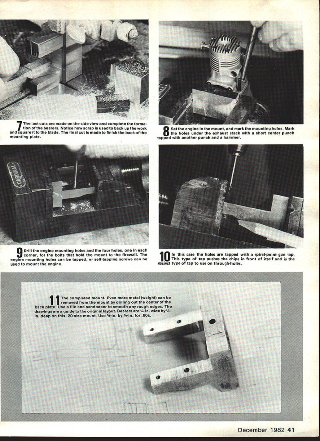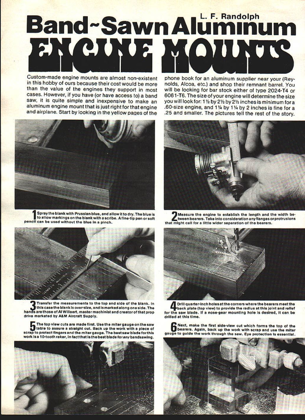 L F Randolph Band-Sawn Aluminum Custom-made engine mounts almost non-existent hobby because cost would value engines support cases However have have access band saw quite simple inexpensive make aluminum engine mount just right engine airplane Start looking yellow pages 5 The top view Cuts made first use miter gauge saw tabie assure straight cut Back up work piece scrap protect fingers miter gauge best saw blade forthis work 1 0-tooth raker factthat best biade forany bandsawing phone book aluminum supplier near Rey nolds Alcoa etc shop remnant barrel will looking bar stock either type 2024-T4 6061 -T6 size engine will determine size will lookfor 11/2 by2 by2 inches minimum fora 60-size engine 1 inches fine 25 smaller pictures tell rest story 6 Next make first side-view cut forms top bearers Again back up work scrap use miter gauge guide work through saw Eve Drotection essentiai Spray biank Prussian blue aiiow dry blue ailow markings biank ascribe fine-tip pen soft pencil can used biue pinch 2 Measure engine estabiish length width tween bearers Take consideration anyflanges protrusions might cali little wider separation bearers Iranster tne measurements top sloe ot blank casethe blank over-size marked along side ha Al Wiiiaert master machinist creator prop drive marketed A&M Aircraft Suppiy quarterinch holes atthe corners bearers meet plate top view provide radius joint relief saw blade nose-gear mounting hoie desired can drilled time 7 last cuts made side view complete forma tion bearers Notice scrap used backup work square blade final cut made finish back mounting plate 9 Drill engine mounting holes four holes corner bolts hold mount firewall engine mounting holes can tapped self-tapping screws can used mount engine 1O case holes tapped spiral-point gun tap type tap pushes chips front itself easiest type tap use through-holes December 1982 41 Set engine mount mark mounting holes Mark holes under exhaust stack short center punch another punch hammer
