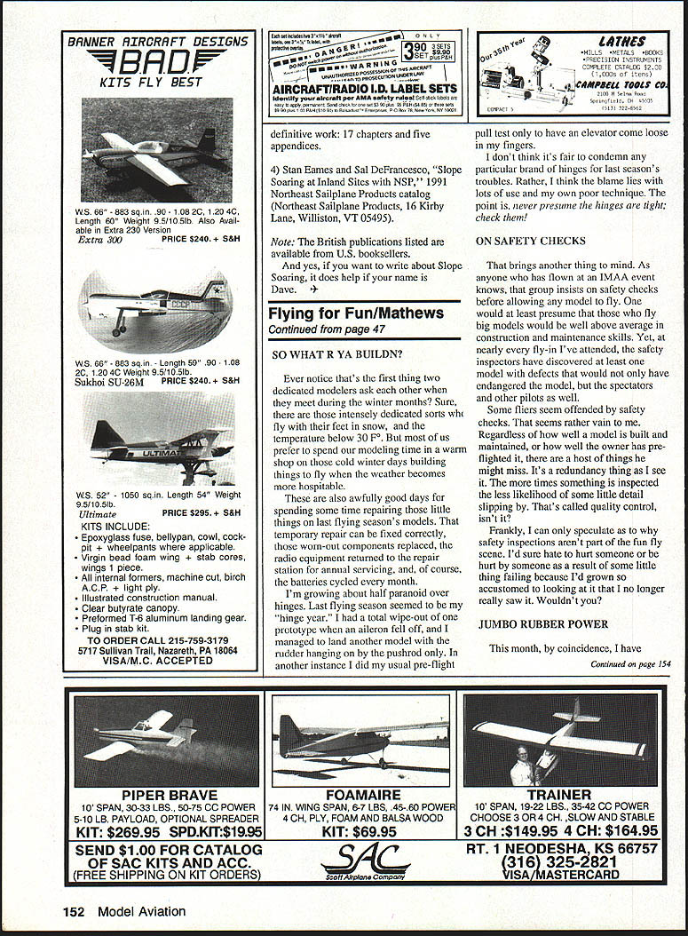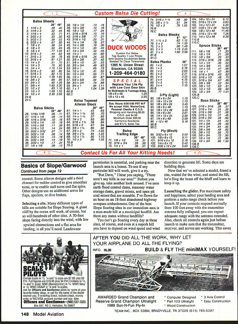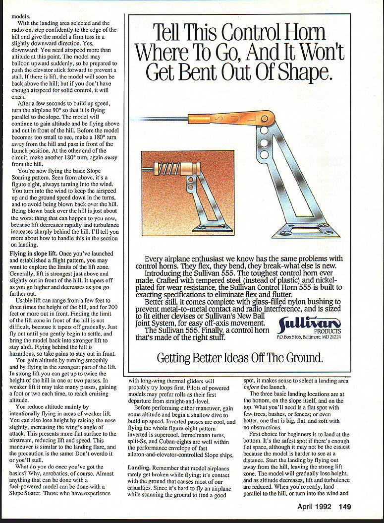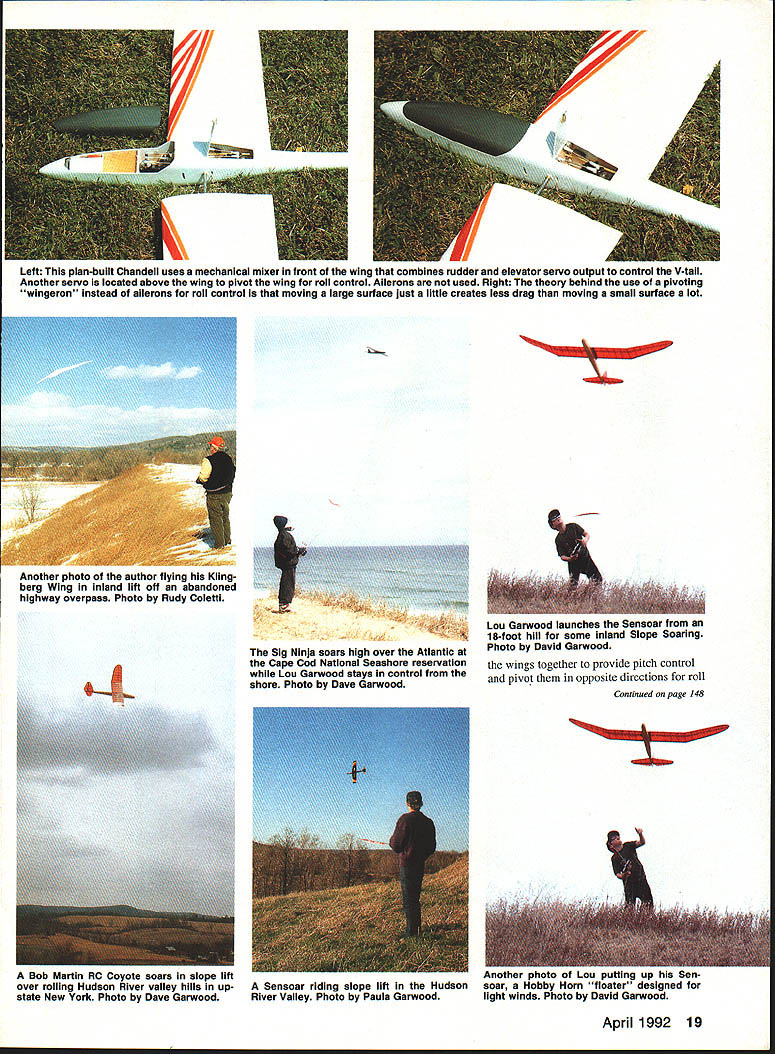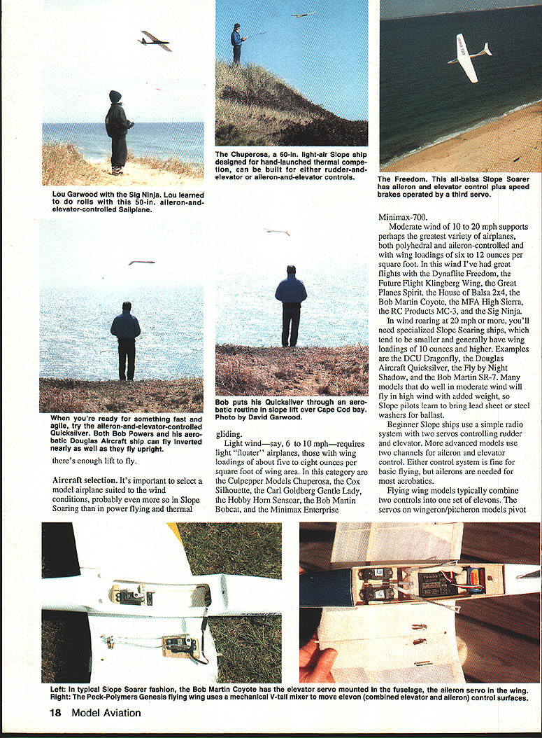 Jim Harrigan pilots Gentie Lady iight lift over picturesque New Engiand vaiiey SLOPE SOARING amazing seems like magic Sure scientific principles meteorology aerodynamics explain works throwing unpowered heavier-than-air model off hill running through aerobatic routine landing hour later does seem magical Slope Soaring offers lot RC fliers Its inexpensive buy no fuel generally fly simple airplanes simple radios Its exhilarating can fly howling wind other RC pilots grounded Its challenging have pay attention fly unpowered airplane 25mph wind once youve mastered basics can fly aerobatics try Combat pylon racing Some modelers hesitant throw model off rocky ledge dead-stick takeoff havent tried interested article explains survive slope lift works glider always descending relative its surrounding air mass can rise relative ground Left author flying Future Flight Kilngberg Wing moderate lift over abandoned highway overpass summer leaves trees upwind slope create enough turbulence make site unsuitable flying Right Bob Powers tests lift two-meter aileron-and-elevator-controlled Sailplane JIm Harrigan waits House Balsa two-channel glider 2x4 16 Model Aviation Lou Garwood about launch Sensoar teat lift amount available lilt gIven site varies wIth changing wind speed wind direction air mass rising faster glider falling condition exists thermals slope lift wind blows against slope airflow forced upward uphill flow creates source rising air supports birds sailplanes Gulls use slope lift fly miles along seacoast dunes single wingbeat Slope Soarers can same Wind enemy thermal glider pilot its friend Slope glider pilot starters youll need 8-mph faster wind blowing straight almost straight hillside Adequate lift depends wind speed slope shape also wind direction directly wind blows slope greater lift can fly slight crosswind maybe up 200 either way lift reduced skill required After initial right turn fiy parallel siope Lou makes 1800 left turn end circuit strongest lift found just above out front slope lighter model less lift needed sustain flight Its rare day theres too much wind because wind increases can fly smaller heavier faster models can stand up Bob Powers iaunches Coyote aileron-andelevator-controlled ship municipal land fill market 15 years Coyote quick smooth filer given sufficient lift can fly best way determine theres enough lift fly watch other Sailplanes second best way watch gulls hawks soaring over slope no other fliers human bird working slope test lift firmly holding model out lift front slope plane wants rise out hand April 1992 17 After final radio check Lou launches Sensoar straight-out lou air plane gains altitude immediately As glider continues climb Lou presses elevator stick forward down elevator prevent stall Spirit rudder-and-alieron-controlled two-meter Thermal contest Sailplane works weil slopes because its semisym metrical airfoil penetrates wind High Sierra two-meter rudder-andelevator-controlled ship clear canopy fiberglass fuselage Weighing models built-up wings pen etrates wind effectively jim Harrigan grabs isat flight day Gentle Lady very competent rudder-and-elevator-controlled ship quite suitabie first gilder N theres enough lift fly Aircraft selection Its important select model airplane suited wind conditions probably Slope Soaring power flying thermal gliding Light windsay 6 10 mphrequires light floater airplanes wing loadings about five eight ounces per square foot wing area category Culpepper Models Chuperosa Cox Silhouette Carl Goldberg Gentle Lady Hobby Horn Sensoar Bob Martin Bobcat Minimax Enterprise Minimax-700 Moderate wind 10 20 mph supports perhaps greatest variety airplanes both polyhedral alleron-controlled wing loadings six 12 ounces per square foot wind Ive great flights Dynaflite Freedom Future Flight Klingberg Wing Great Planes Spirit House Balsa 2x4 Bob Martin Coyote MFA High Sierra RC Products MC-3 Sig Ninja wind roaring 20 mph youll need specialized Slope Soaring ships tend smaller generally have wing loadings 10 ounces higher Examples DCU Dragonfly Douglas Aircraft Quicksilver Fly Night Shadow Bob Martin SR-7 models well moderate wind will fly high wind added weight Slope pilots learn bring lead sheet steel washers ballast Beginner Slope ships use simple radio system two servos controlling rudder elevator advanced models use two channels aileron elevator control Either control system fine basic flying ailerons needed aerobatics Flying wing models typically combine two controls set elevons servos wingeronlpitcheron models pivot 18 Model Aviation Lou Garwood Sig Ninja Lou learned rolls 50-in aileron-andelevator-controlled Sailplane Chuperosa 60-in light-air Slope ship designed hand-launched thermal compe tion can built either rudder-andelevator aileron-and-elevator controls Freedom all-balsa Slope Soarer has aileron elevator control plus speed brakes operated third servo yuu u ruuuy ior someining tarn ana aiieron-and-elevator-controlied Quicksilver Both Bob Powers acro batic Douglas Aircraft ship can fly inverted nearly well fly upright Bob puts Quicksilver through acro batic routine slope lift over Cape Cod bay Photo David Garwood Left typical Slope Soarer fashion Bob Martin Coyow iou elevator servo mounted fuselage aileron servo tne wing Right Peck-Polymers Genesis flying wing uses mechanical V-tail mixer move devon combined elevator aileron control surfaces Left plan-built Chandeil uses mechanical mixer front wing combines rudder elevator servo output control V-tail Another servo located above wing pivot wing roil control Ailerons used Right theory behind use pivoting wingeron instead ailerons roil control moving large surface just little creates less drag moving small surface lot Bob Martin RC Coyote soars slope lift over roiling Hudson River valley hills up state New York Photo Dave Garwood 7 Sig Ninja soars high over Atlantic Cape Cod National Seashore reservation Lou Garwood stays control shore Photo Dave Garwood Sensoar riding slope lift H