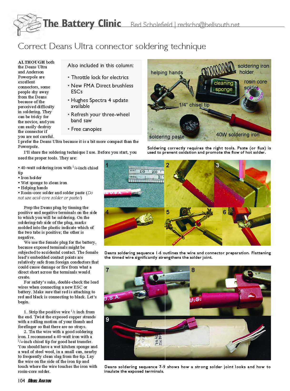 Deans soldering sequence 1-6 outlines the wire and connector preparation. Flattening