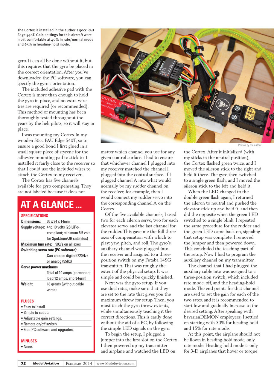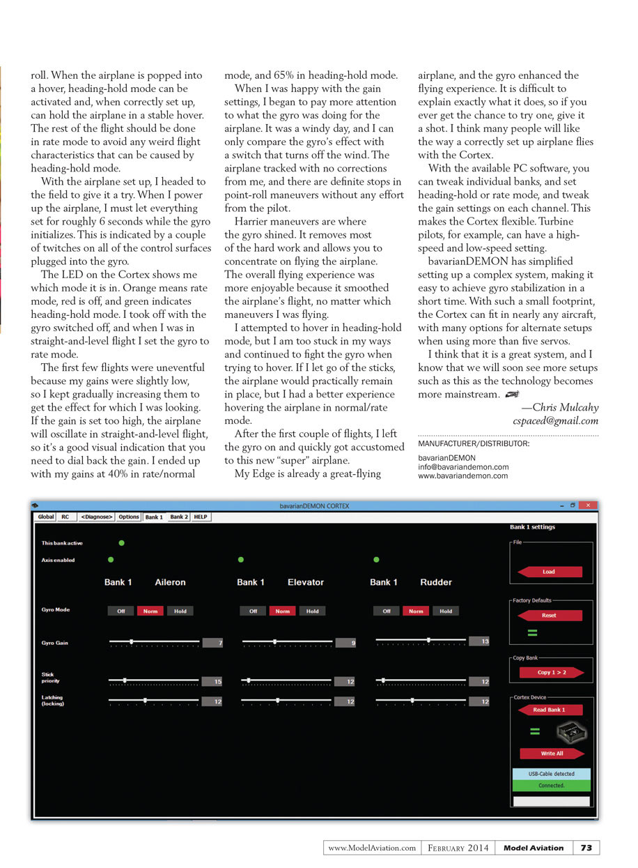 No bigger than a typical receiver, the Cortex is a single compact unit that sets in-line between your receiver and your servos. It is a rate gyro and heading-hold gyro, and can be remotely switched on and off. Bavarian Demon also provides free PC software via a download from its website, allowing you to customize all of these settings and update the Cortex with the latest firmware release.