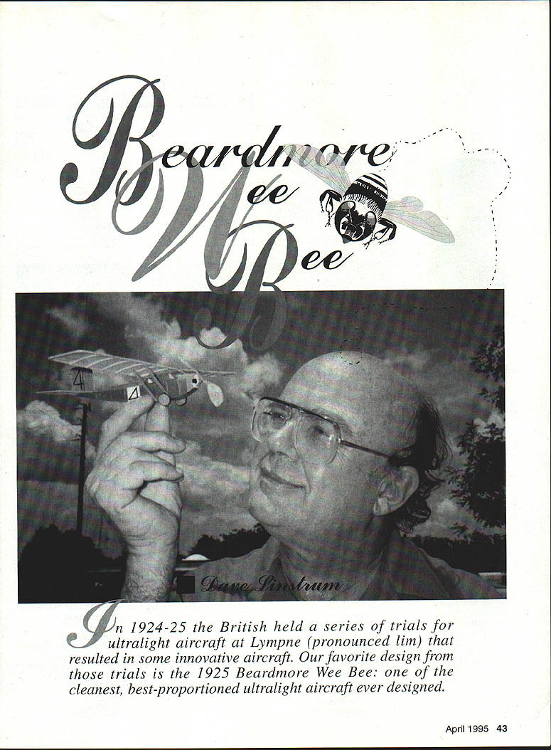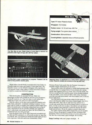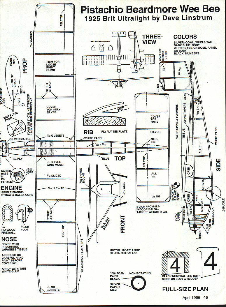 j ee n 1924-2 5 British held series trials ultralight aircraft Lympne pronounced urn resulted some innovative aircraft favorite design trials 1925 Beardmore Wee Bee cleanest best-proportioned ultralight aircraft ever designed April 1995 43 J p Type FE Indoor Pistachio Scale Wingspan 102 inches Rubber motor 10-12-inch ioop 025 TanFlying weight Two grams less rubber - Construction Stick-and-tissue Covering/finish Japanese tissue w/Pactra acrylics Miami Indoor Aircraft Model Association fliers have built Pistachio eight-inch span Peanut 13-inch span sizes Pistachio version won MIAMA Intergnats top time 578 seconds Under high ceiling will minute bad model will fit cigar box CONSTRUCTION Note plans presented full size Make two photocopies plans build use patterns tracing ID numerals etc Tape copy soft surface like ceiling tile foam core cover waxed paper Read callouts plans assemble requisite tools balsa tissue paints minimal workshop inventory X-Acto knife #11 blade broken non-stainless double-edged razor blade dressmaker pins self-healing cutting board use scrap artists mat board economy minded glue applicator artists sable brush needle-nose pliers sure build uncluttered work area good light Since photos show major framework assembled plans fully annotated will tell glue Part Part B should attempt model until have some experience stick-and-tissue construction PeckPolymers Peanut Scale model like Pietenpol Aircamper Nesmith Cougar should teach tricks Pactra acrylic colors airbrush careful hand painting make acceptable hues opaque finish airbrush pre shrunk white Japanese tissue frame cover model full-size aircraft silver blue paint ultralight tradition mid-i 920s wood fabric shiny aluminum cowl stick-and-tissue model silver marker cowl thus honest replication will need strip special thin rubber model obtain 025 Pistachio rubber Indoor Model Supply Box 5311 Salem OR 97304 Start eight-inch loop trim smooth right spiral climb sure balance point shown plans use clay nose adjust Downthrust right thrust may required Once good trim achieved increase motor length add turns fly outdoors except dead calm little vicarious flying thrill imagine test pilot Maurice Piercey flying laps Lympne front designer Bill Shackleton halcyon days aviation pioneering Wee Bee would make great ultralight flivver today Happy Landings Lympne ultralight odel Aviation Bee rest Flight times minute possible under high ceilings 025 Tan rubber Wee Bees major components progress Tweezers can used help position smaller parts Japanese tissue preshrunk frame before applying model Pistachio models covered top side z 0 4 0 NH] 4Z 0I0 9 04 -C C UJ1fl -z I-0 cmow 4o LlJa ZZ 0C 1 ER MARKER PAINT & BASS PIN EXHAUS ENGINE SIMPLE ENGINE STRAW & BALSA CORE 1/641/ieSH PLYWOODPLUG FIREWALL NOSE COVER WITH PRESHRUNK JAPANESE TISSUE AIRBRUSH OR CAREFUL HAND PAINT BEFORE COVERING APPLY WITH THIN WHITE GLUE F w UTRIM FOR t E CLIMB RIGHTL I-C 04 COVER TOP ONLY SILVER ~l/33 GUSSETS II / 11325H VEE WING MOUNT 1/32 SLICED ~~1132 LE I-C 04 a. WI 1/33 SH GUSSETS U Pistachio Beardmore Wee Bee 1925 Brit Ultralight Dave Linstrum 1111111III IIIIIII I I11 RIB 1/32 PLY TEMPLATE WHITE PANEL 1/3 X II BLUE TOP Ii K w -J x 4 0 0 // V 0 F I 0 m 0 0 4 K THREEVIEW uJ 0O Ci COVER TOP ONLY SILVER GLUE /FIN / ALL 1/33 BUILD FROM 6LB INDOOR BALSATARGET WEIGHT 2 GR z 0 UMOTOR 1O-12 LOOP OF 025-030 FAI TAN COLORS SILVER COWL WING & TAIL DARK BLUE BODY WHITE NAME ON NOSE PANEL ON BODY BLACK NUMBERS m 4 I- 0 0 Lu 4 wa0 -J LuLu z 04 0a F I -J -J 4 w 0 0 0 0 I0 z LuI a O o0 wl$0 -I m 64I _Lu F_ 640 0C4Z 4 2 0 0 30 -1 0 w 0 U Lu 2 0 0 C zI Oz Ow 20 04 ma 1/16 FOAM NON-ROTATING PAINT_BLACK NUMERALS ON BOTH BLACK~SIDESONBODY&RUDDER SILVERI PAPER DISC FULL-SIZE PLAN April 1995 45
