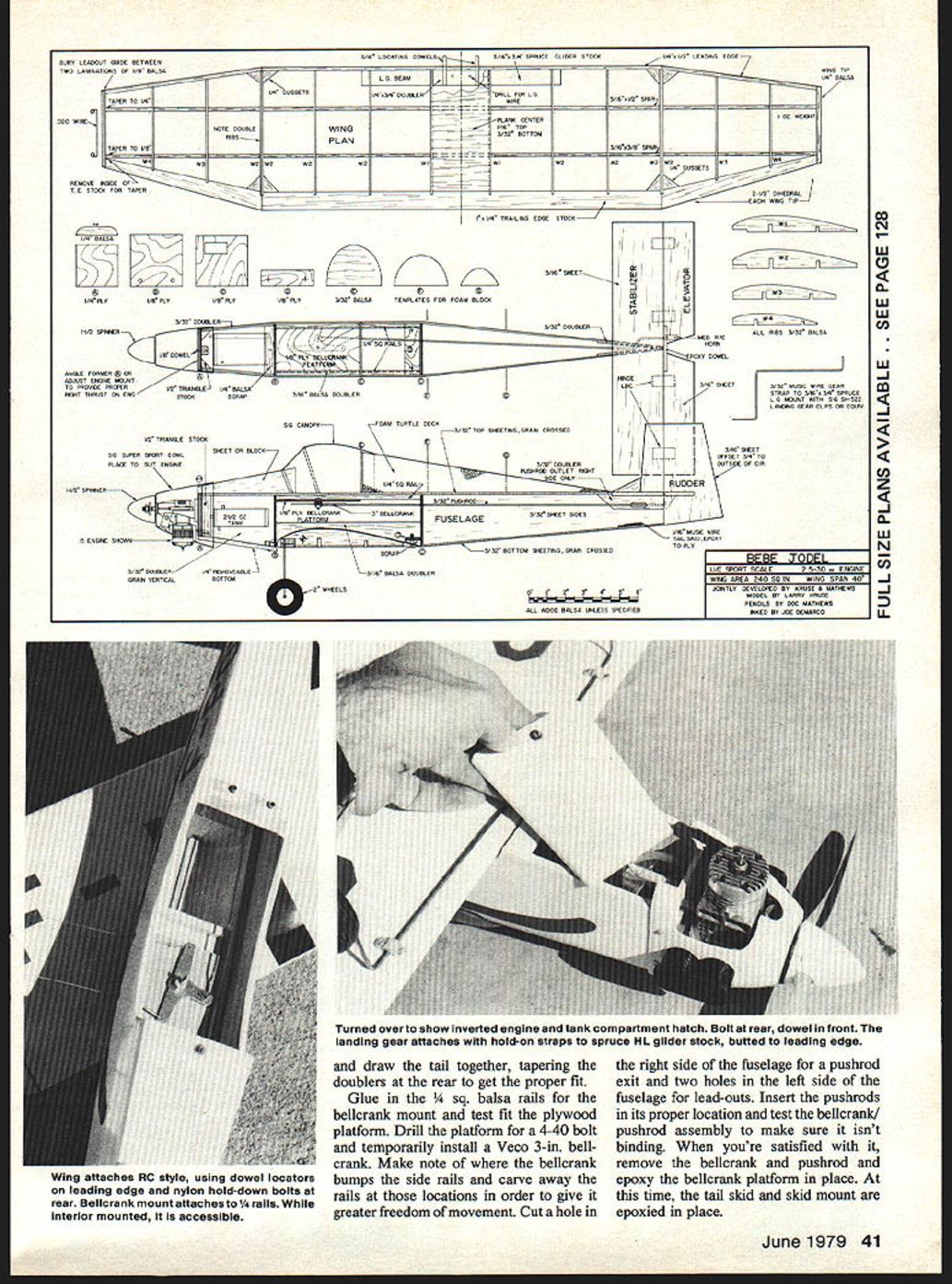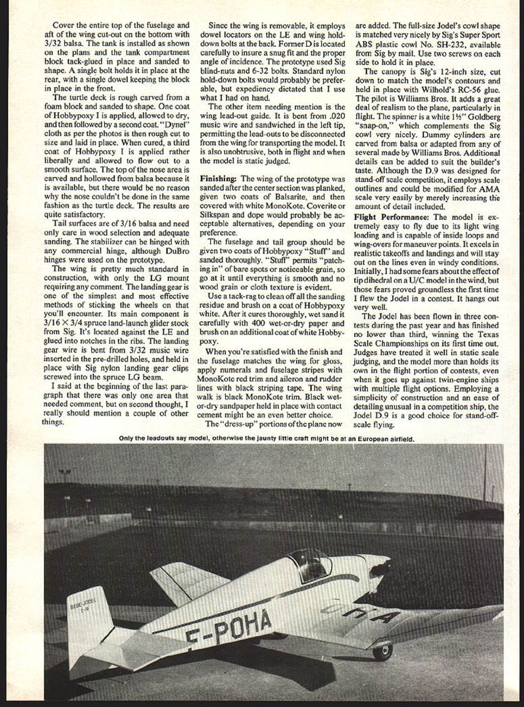 undergone continuous relmement mod ification since time plane has certificated numerous engines ranging D9 its 25hp Poinsard through D92 version modified Volkswagen engine up twoseater D 119 90hp Continental versions low wing featuring one-piece lifting section constant chord center portion tapered wing tips set dihedral angle 14 degrees fuselage tail units wood construction fabric plywood oovering designers advertise plane can built little 500 man-hours claim must fairly accurate wing simple Stand Off-Scale construction 25-30 engined CL job will spice up life flying circles Dee Mathews Larry Kruse according Bob Peck just returned Europe Jodels type another over France coming going practically airport testament Construction Cut out two fuselage sides front rear doublers 3/32 balsa Use Titebond similar glue lay up doublers sides certain make both right left side Note right side shorter due rightthrust used mounting engine glue drying cut formers B C D ood firewall Drill install 4-40 blind nuts firewall engine mount have selected Pin fuselage sides upside down over plan epoxy formers place Check alignment small carpenters square similar instrument . After rough carving rrom ruani uiocr Inelurrie uecK isgiven iwucoatsof Hobbypocy seetextforprocedure Dynel cloth rignt laid place given third coatsame procedure can used balsa top nose area feel inclined Looks great 40 Model Aviation AURA LEADOLT GUIDE BETWEEN TWO LAMINATIONS OF I/B BALSA RAPES TA AG ADD WIRE TAVEA TO AB WWSWA TOW LOCATING OOMELSA/{91~fl S/IN S/B SPRUCE SLIDES STOCA TA GUSSETS 5 U PETB PLAI/M PEAI/B PET WING PLAN I/OAO DOUBLER__ A/MILL FAG LU 4 I/IA TOP S/SB BOTTOM TN I/A TRAILING EDGE flD SNSA0 S/IBNS/B SPAR A/SD BALSA SPINNER['"LilZZZZZZZZIIItJi$~I/A SB RAILS TO FRAU OF PROPER1 TA ANGLE/0 0/ANT ENS NE MOUNTBALSA 0 THU ST ON ENSrOERSCRAP I/UT /0 LEADING EUGE I/A BALSA AZ AEIOODH WAASMA I/O GUSSETS D 02 UIBEAGAL S/IN SHEET AxACORN —T S/U STEED B BA SD DOUBLERLC GG CANOPTFOAM TURTLE DECA I I S/IS SHEET S/SD DOUBLERIOUTSIDE OF CIA S/SD MDTAOM TDEETISAGRAM CROSSED ALL RIMS S/SD OALSA STRAP TO S/IRN OW SPAUCO LU MOUNT MITT GIG ST-SAD co N N w C 0 w w C, A/AD DOUBLERVA REASUEGAL GRAIN UESTICAL OM A/IA BALSA DOUBLER SAC SPORT SCALE2530 ENGRE WOO AREA 24030 INW NO SPAN 40 9I999 draw tail together tapering doublers rear get proper fit Glue alsa rails bellcrank mount test fit plywood platform Drill platform 4-40 bolt temporarily install Veco 3-in bellcrank Make note bellcrank bumps side rails carve away rails locations order give greater freedom movement Cut hole JOINALT DEVELOPED MT RAUSE B MATHEWS MADEL AT LARAT BROUR PENCILS BA OSC BATMEWS w -J -J Co z -J w N Co -J -J Uthe right side fuselage pushrod exit two holes left side fuselage lead-outs Insert pushrods its proper location test bellcrank/ pushrod assembly make sure isnt binding youre satisfied remove bellcrank pushrod epoxy bellcrank platform place time tail skid skid mount epoxied place June1979 41 Turned over show Inverted engine tank compartment hatch Bolt rear dowel front landing gear attaches hold-on straps spruce HL glider stock butted leading edge wing attaches RC style using dowel locators leading edge nylon hold-down bolts rear Bellcrank mount attachesto1/4 rails interior mounted accessible Cover entire top fuselage aft wing cut-out bottom 3/32 balsa tank installed shown plans tank compartment block tack-glued place sanded shape single bolt holds place rear single dowel keeping block place front turtle deck rough carved foam block sanded shape coat Hobbypoxy applied allowed dry followed second coat Dynel cloth per photos rough cut size laid place cured third coat Hobbypoxy applied rather liberally allowed flow out smooth surface top nose area carved hollowed balsa because available would no reason nose couldnt done same fashion turtle deck results quite satisfactory Tail surfaces 3/16 balsa need care wood selection adequate sanding stabilizer can hinged commercial hinge although DuBro hinges used prototype wing pretty much standard construction LG mount requiring comment landing gear simplest effective methods sticking wheels youll encounter Its main component 3/16 X 3/4 spruce land-launch glider stock Sig Its located against LE glued notches ribs landing gear wire bent 3/32 music wire inserted pre-drilled holes held place Sig nylon landing gear clips screwed spruce LG beam said beginning last para graph area needed comment second thought really should mention couple other things Since wing removable employs dowel locators LE wing holddown bolts back Former D located carefully insure snug fit proper angle incidence prototype used Sig blind-nuts 6-32 bolts Standard nylon hold-down bolts would probably prefer able expediency dictated use what hand other item needing mention wing lead-out guide bent 020 music wire sandwiched left tip permitting lead-outs disconnected wing transporting model also unobtrusive both flight model static judged Finishing The wing prototype sanded after center section planked given two coats Balsarite covered white MonoKote Coverite Silkspan dope would probably ac ceptable alternatives depending preference fuselage tail group should given two coats Hobbypoxy Stuff sanded thoroughly Stuff permits patch ing bare spots noticeable grain go until everything smooth no wood grain cloth texture evident Use tack-rag clean off sanding residue brush coat Hobbypoxy white After cures thoroughly wet sand carefully 400 wet-or-dry paper brush additional coat white Hobby poxy youre satisfied finish fuselage matches wing gloss apply numerals fuselage stripes MonoKote red trim aileron rudder lines black striping tape wing walk black MonoKote trim Black wetor-dry sandpaper held place contact cement might better choice dress-up portions plane now added full-size Jodels cowl shape matched very nicely Sigs Super Sport ABS plastic cowl No SH-232 available Sig mail Use two screws side hold place canopy Sigs 12-inch size cut down match models contours held place Wilhol