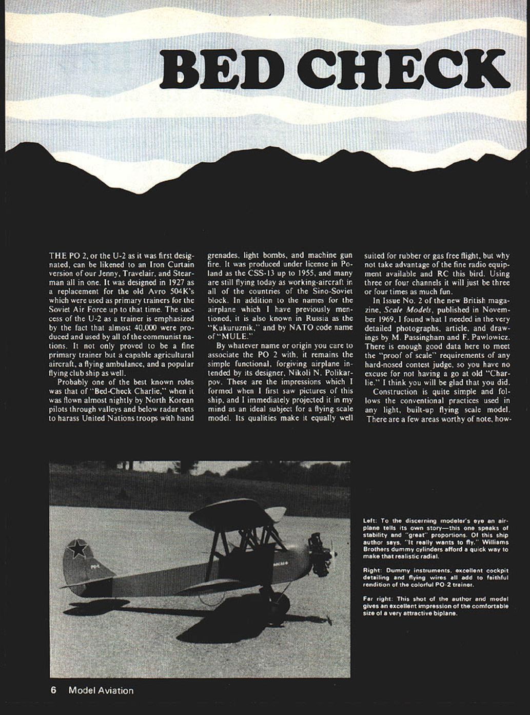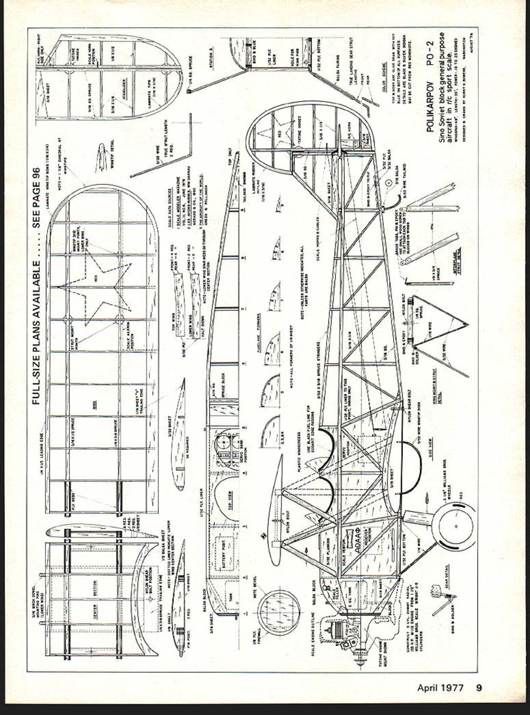 NO OCR TEXT CHARLIE H G Bowers 09 1 5 power RC Scale model Iron Curtain trainer guarantees hours relaxed pleasant flying ence sources plans par ticular interest cover painting total coverage aircraft found Scale Modeler Magazine Volume II Number 6 June 1976 source alone will provide proof scale material required AMA sanctioned competition model flew right off board couple control horn clevis adjust ments trim exceedingly light abundant wing area amaz ingly maneuverable 15 engine pro vides ample power takeoffs about grass model flying field good 09 10 adequate sport flying training dont really consider model over 049 power school yard scale however 09/10 engine P02 will easily operate school yard playing field other such limited area us highly urban communities have access havent built scale model vintage size category means try will delighted hours relaxed pleasant flying store Top Ground level view makes obvious P0-2 will also fly vary well gas free flight Designed 1927 P0-2s still flyingover 40000 built Right pic ture worth thousand words 0C -A K H WINGSPAN -3 4 HEIGHTIC ENGINE NCVL MID TNT P POLIKARPOV Po-2 CA 06 84MW GaGE 61 8 Model Aviation MOUNTING PINS LOWER SING CENTERSE I2 AU 012 LEGIGNO EURO REU -- GROG K NYLON SIEGE 1-SULT PONITIUN r AGOTABSPSOOE TRALINO AU SAUNA GREET LAS SNEETNOTE SOYTES LSEN ECOCATE LOWS ~INTEBNE0TWM FULL-SIZE PLANS AVAILABLE SEE PAGE 96 LUMINATE WINO TIP SOWN AIR U AU PLY WERSSAWS lAG WIROCSSi BOGEY H l POETSWEGil LOWER SEG I7 ONLY WEGSOS I/ AS OOASSPSONOx [v32][b-1-10-1-10]] SCALE AILERON I NOTE THB GIREOBAL AT ETSIL AlE SHEET Y TRAILEN EUGE SAGE GREET PIN POGITS BEGYIN GREET BALSA MUGS ____________________________________________________________[v32][b138594811200]] MN GREET--I~ -11B r II-IUI4IIH2I9I --IIMATTERYPUGIT IIIIiI TONEITOP TIEW -11jmi fl7 IAN PLYNOYE SCOEL BALSA BLOCS d TOP WINSBONYU REQSCALE GATA SUORCES -- SCOLE MUSCLES SANGUINE SASH PITVOL II NOR JUNE BYe LONEFSONY U SEGH LES nYlONS ASSES WIN HANNAG ___-GGEBAROSCO. EBO 5 THE AIRCHOFT OF TNO WUBLO HALF AS MOYELSEER WINGSPORWEBSSOYSROOI GREEN R POLLISGER OAR SO CENTER SUCTION /11TOP ONLY SAW SO SPRUCE LAMINATE TIPS lAIR U SAlE N HO NH SPRUCE SYATIRM S SERVOPOSITIONAA TRULSUCO GSAMINOE5 LAMINATE RIDGESBIMO S BLUE FUSELAGE ERSOGYLISEA IIHIROSAINI II AHOG PLY LINER PLASTIC u~ LSCII FUEL LINENGTEUNLEGG GISIESISE INGICATUG ALL REG C NOTEALL FONMERS OF IASGGEETSHLE FOR ATONE GINGERWINO PING EPIT EGNE POGOIMS HASH PLY BOTTOM O 00 TONT F1 BEBYOASS PLY LINEB TO TRIGI SALSA iIAOA Ad-\I~[SUE OURSTRIE LAGGING lEGS STRUT HUN EPOSY TO PLYSAWFRONT \OAOG SIR SING S EPIDYINYLON BOUTTO ATTACH EACH TON SOSAUG WEE TAILNOU SING N OSUNORlAG 5G GIGE OrESlAIN WIRE WING SOEJYRISTRUT NOTUIL SASH WIlE ium 1 , NE ENNIFESHIM SlEET N ____ TBOCT S CYL GUMMY SAGIAL lBS RE S-lb ENNISE PRUM IAU WILLIAMS BROS BUGLE WRIMST YB CYLISOERSlAB WISE IAB WILLIAMS SING N SULGERIZ7 5 NYLUB SHEAR BOLl OHIO WIRE WINSTIP SKEG TOP N RICES ARE ULITE GRAS SITS SET BLUE ONSOTTONOFALL SUBFACES GETUILS GRE BUGUR N SILUER ISGIGNA SAY BE CUT FROM BEG MOSHEOTE POLIKARPOV P0-2 Sino Soviet block general purpose aircraft nc sport scale RINGSPM-05 LENGTH00 POWEB- 10 TO US EGENES GEHISSEG N GRASS BY RUBSY S BOWUSH WASHINGTON RUSUST TN 0 CD -J CD