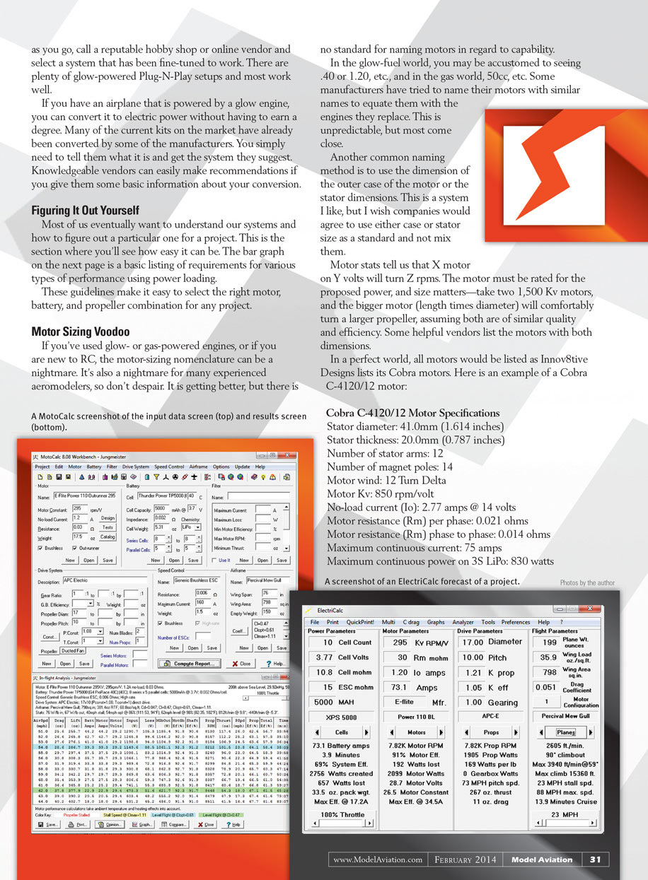 I primarily use two computer programs when I’m working up a new system that hasn’t been done before. ElectriCalc and MotoCalc will allow you to get as deep into the planning phase as you wish. These programs do all of the math and have huge databases of motors, batteries, propellers, etc. to use. The help files alone are worth the purchase price and are constantly updated. Many vendors and manufacturers also have online drive calculators.
