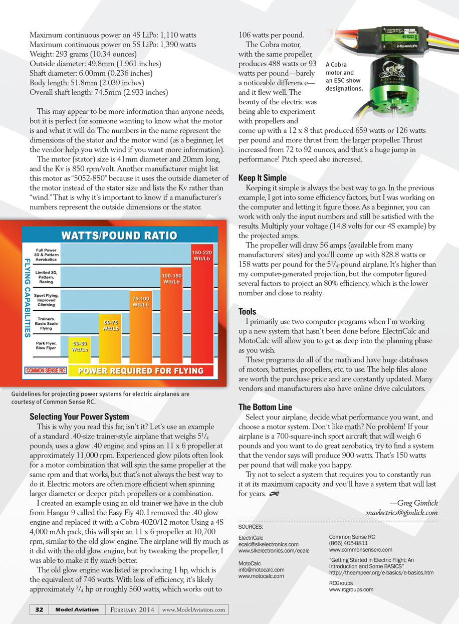 Select your airplane, decide what performance you want, and choose a motor system. Don’t like math? No problem! If your airplane is a 700-square-inch sport aircraft that will weigh 6 pounds and you want to do great aerobatics, try to find a system that the vendor says will produce 900 watts. That’s 150 watts per pound that will make you happy.