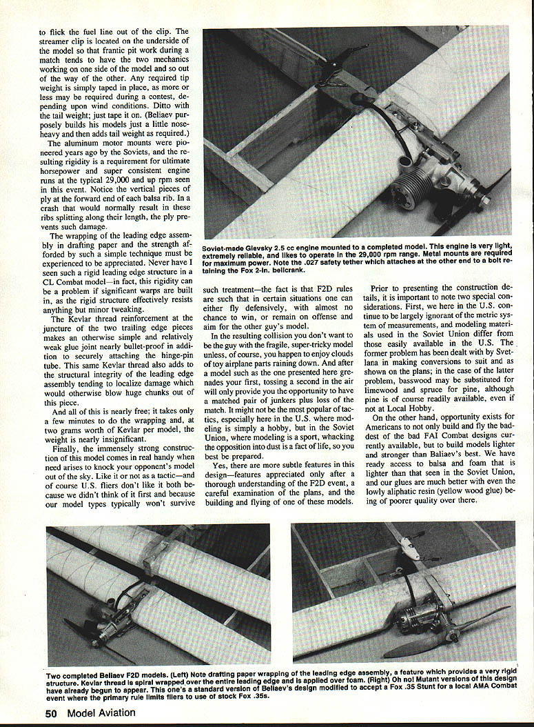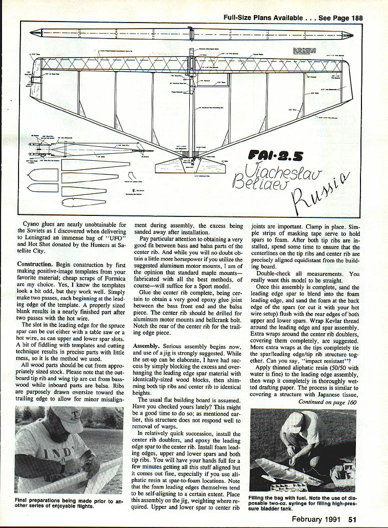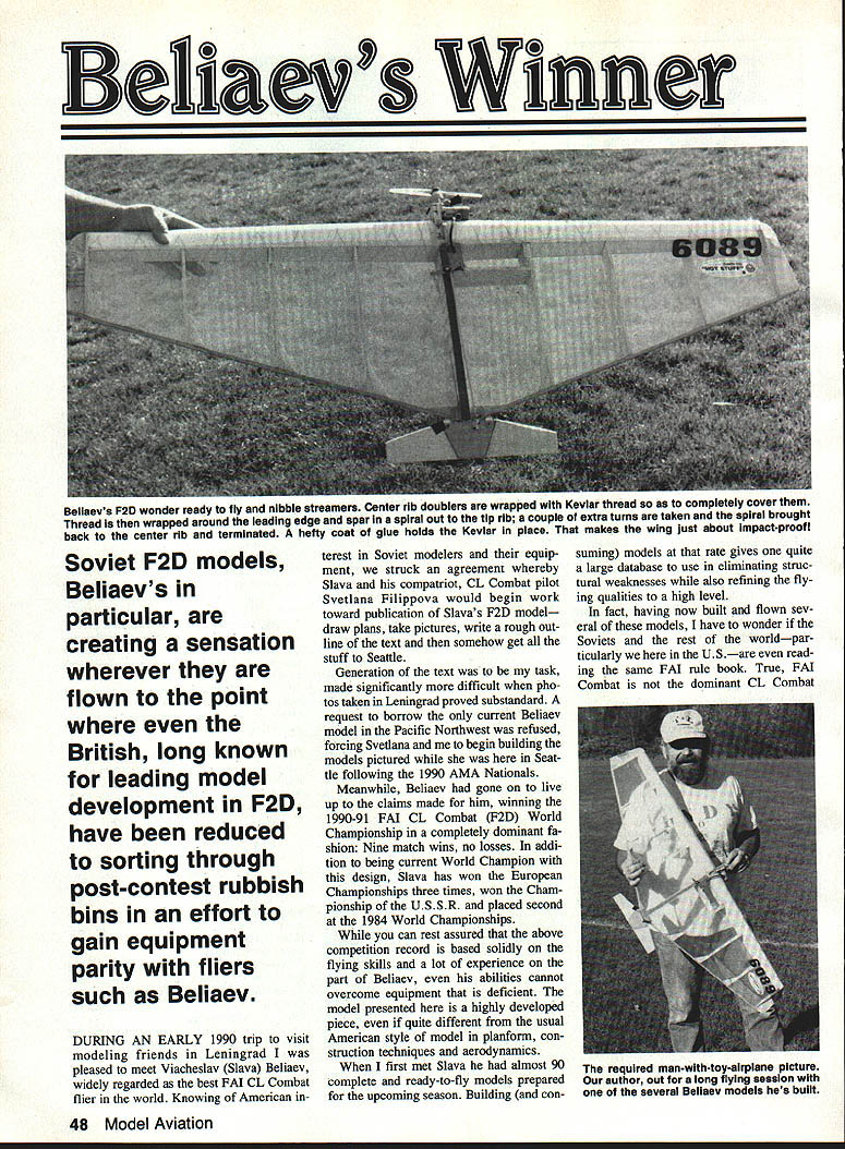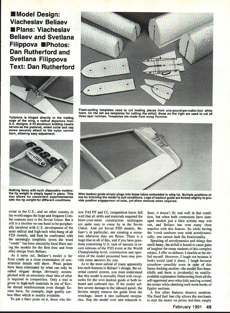 UTi 6 ~inner Soviet F2D models Beliaevs particular creating sensation wherever flown point British long known leading model development F2D have reduced sorting through post-contest rubbish bins effort gain equipment parity fliers such Beliaev DURING EARLY 1990 trip visit modeling friends Leningrad pleased meet Viacheslav Slava Beliaev widely regarded best FM CL Combat flier world Knowing American interest Soviet modelers equip ment struck agreement whereby Slava compatriot CL Combat pilot Svetlana Filippova would begin work toward publication Slavas F2D model draw plans take pictures write rough out line text somehow get stuff Seattle Generation text task made significantly difficult pho tos taken Leningrad proved substandard request borrow current Beliaev model Pacific Northwest refused forcing Svetlana begin building models pictured Seat tle following 1990 AMA Nationals Meanwhile Beliaev gone live up claims made him winning 1990-91 FM CL Combat F2D World Championship completely dominant fa shion Nine match wins no losses addi tion being current World Champion design Slava has won European Championships three times won Cham pionship USSR placed second 1984 World Championships can rest assured above competition record based solidly flying skills lot experience part Beliaev abilities cannot overcome equipment deficient model presented highly developed piece quite different usual American style model planform con struction techniques aerodynamics first met Slava almost 90 complete ready-to-fly models prepared upcoming season Building consuming models rate gives quite large database use eliminating struc tural weaknesses also refining fly ing qualities high level fact having now built flown sev eral models have wonder Soviets rest worldpar ticularly US read ing same FM rule book True FM Combat dominant CL Combat 48 Model Aviation Belisevs P20 wonder ready fly nibble streamers Center rib doublers wrapped Keviar thread completely cover Thread wrapped around leading edge spar spiral out tip rib couple extra turns taken spiral brought back center rib terminated hefty coat glue holds Keviar place makes wing just about impact-proof required man-with-toy-airplane picture author out long flying session several Beiiaev models hes built EModel Design Viacheslav Beliaev U Plans Viacheslav Beliaev Svetlana Filippova U Photos Dan Rutherford Svetlana Filippova Text Dan Rutherford event US no other country world stages huge frequent Com bat contests seen Soviet Union still shocker hand peripher ally involved US development radical high-tech whiz-bang F2D models confronted seemingly simplistic word crude has uttered local fliers see ing models first time afar design Beliaev As turns out Beliaevs model far crude close examination con struction details will show Weak points have eliminated what can called elegant design obviously accom plished extremely clear idea what required competition Only nod given high-tech materials use Key lar thread reinforcement though So viets have example high quality car bon fiber readily available put finer point fol low FAI FF CL competition know full well skills materials required blow-your-mind construction techniques quite easy come Soviet Union yet Soviet F2D models liaevs particular creating sensa tion wherever flown huge clue have ques tions concerning US lack success re cent editions F2D event World Championship level construction oper ation model presented may pro vide some answers As salient apparently low-tech features Beliaevs design ex ternal control system must understand model normally fitted recep tacles wire leadout guide both board outboard tips model suf fers severe damage inboard panel Soviets simply remove guide wreckage insert outboard recepta cles flop model over relaunch Sure doesnt fly real well condi tion both contestants have dam aged models just little airtime may win out Beliaev has won close matches feature So having crank outdoors may stink aerodynami cally cannot fault functionality Speaking aerodynamics things smell funny airfoil bound cause gales laughter students complex subject offer no defense chuckle air foil myself However laugh because looks weird does laugh because somehowpossibly spite funny-looking sectionthe model flies beau tifully evidently no readilyavailable explanation forthcoming self-appointed aero whiz-kids peering around corner clutching well-worn books Eppler sections few other features deserve mention fixed fuel line clip allows mechanic start motor prime simply February 1991 49 Tailpiane hinged directly trailing edge wing radical departure US designs #3 aluminum knitting needle serves pushrod wheel collar cap screw securely attach nylon control horn allowing easy adjustment Foam-cutting templates used cut leading pieces one-pound-per-cubic-loot white foam left templates cutting airfoil right used cut three spar notches Templates made scrap Formica Nothing fancy such disposable models tip weight simply taped place also allows convenient experimentation tip weight different conditions Wire leadout guide simply plugs brass tubes embedded wing tip Muitipie positions al low trimming model suit conditions Legs leadout guide kinked slightly pro vide positive engagement tube yet allow removal required flick fuel line out clip streamer clip located underside model frantic pit work during match tends have two mechanics working side model out way other Any required tip weight simply taped place less may required during contest de pending upon wind conditions Ditto tail weight just tape Beliaev pur posely builds models just little noseheavy adds tail weight required aluminum motor mounts pio neered years ago Soviets re sulting rigidity requirement ultimate horsepower super consistent engine runs typical 29000 up rpm seen event Notice vertical pieces ply forward end balsa rib crash would normally result ribs splitting along length ply pre vents such damage wrapping leading edge assem bly drafting paper strength af forded such simple 