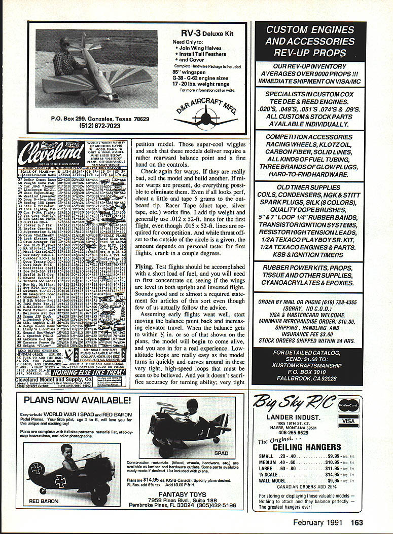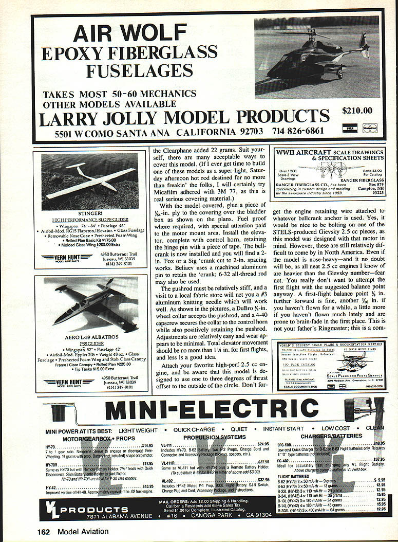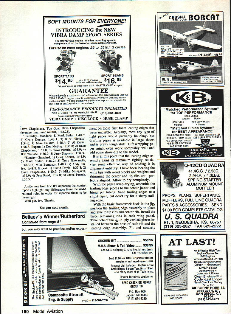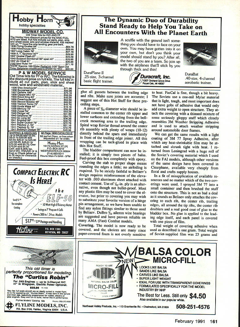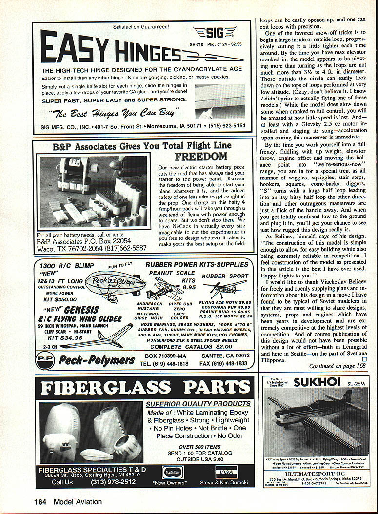 UTi 6 ~inner Soviet F2D models Beliaevs particular creating sensation wherever flown point British long known leading model development F2D have reduced sorting through post-contest rubbish bins effort gain equipment parity fliers such Beliaev DURING EARLY 1990 trip visit modeling friends Leningrad pleased meet Viacheslav Slava Beliaev widely regarded best FM CL Combat flier world Knowing American interest Soviet modelers equip ment struck agreement whereby Slava compatriot CL Combat pilot Svetlana Filippova would begin work toward publication Slavas F2D model draw plans take pictures write rough out line text somehow get stuff Seattle Generation text task made significantly difficult pho tos taken Leningrad proved substandard request borrow current Beliaev model Pacific Northwest refused forcing Svetlana begin building models pictured Seat tle following 1990 AMA Nationals Meanwhile Beliaev gone live up claims made him winning 1990-91 FM CL Combat F2D World Championship completely dominant fa shion Nine match wins no losses addi tion being current World Champion design Slava has won European Championships three times won Cham pionship USSR placed second 1984 World Championships can rest assured above competition record based solidly flying skills lot experience part Beliaev abilities cannot overcome equipment deficient model presented highly developed piece quite different usual American style model planform con struction techniques aerodynamics first met Slava almost 90 complete ready-to-fly models prepared upcoming season Building consuming models rate gives quite large database use eliminating struc tural weaknesses also refining fly ing qualities high level fact having now built flown sev eral models have wonder Soviets rest worldpar ticularly US read ing same FM rule book True FM Combat dominant CL Combat 48 Model Aviation Belisevs P20 wonder ready fly nibble streamers Center rib doublers wrapped Keviar thread completely cover Thread wrapped around leading edge spar spiral out tip rib couple extra turns taken spiral brought back center rib terminated hefty coat glue holds Keviar place makes wing just about impact-proof required man-with-toy-airplane picture author out long flying session several Beiiaev models hes built EModel Design Viacheslav Beliaev U Plans Viacheslav Beliaev Svetlana Filippova U Photos Dan Rutherford Svetlana Filippova Text Dan Rutherford event US no other country world stages huge frequent Com bat contests seen Soviet Union still shocker hand peripher ally involved US development radical high-tech whiz-bang F2D models confronted seemingly simplistic word crude has uttered local fliers see ing models first time afar design Beliaev As turns out Beliaevs model far crude close examination con struction details will show Weak points have eliminated what can called elegant design obviously accom plished extremely clear idea what required competition Only nod given high-tech materials use Key lar thread reinforcement though So viets have example high quality car bon fiber readily available put finer point fol low FAI FF CL competition know full well skills materials required blow-your-mind construction techniques quite easy come Soviet Union yet Soviet F2D models liaevs particular creating sensa tion wherever flown huge clue have ques tions concerning US lack success re cent editions F2D event World Championship level construction oper ation model presented may pro vide some answers As salient apparently low-tech features Beliaevs design ex ternal control system must understand model normally fitted recep tacles wire leadout guide both board outboard tips model suf fers severe damage inboard panel Soviets simply remove guide wreckage insert outboard recepta cles flop model over relaunch Sure doesnt fly real well condi tion both contestants have dam aged models just little airtime may win out Beliaev has won close matches feature So having crank outdoors may stink aerodynami cally cannot fault functionality Speaking aerodynamics things smell funny airfoil bound cause gales laughter students complex subject offer no defense chuckle air foil myself However laugh because looks weird does laugh because somehowpossibly spite funny-looking sectionthe model flies beau tifully evidently no readilyavailable explanation forthcoming self-appointed aero whiz-kids peering around corner clutching well-worn books Eppler sections few other features deserve mention fixed fuel line clip allows mechanic start motor prime simply February 1991 49 Tailpiane hinged directly trailing edge wing radical departure US designs #3 aluminum knitting needle serves pushrod wheel collar cap screw securely attach nylon control horn allowing easy adjustment Foam-cutting templates used cut leading pieces one-pound-per-cubic-loot white foam left templates cutting airfoil right used cut three spar notches Templates made scrap Formica Nothing fancy such disposable models tip weight simply taped place also allows convenient experimentation tip weight different conditions Wire leadout guide simply plugs brass tubes embedded wing tip Muitipie positions al low trimming model suit conditions Legs leadout guide kinked slightly pro vide positive engagement tube yet allow removal required flick fuel line out clip streamer clip located underside model frantic pit work during match tends have two mechanics working side model out way other Any required tip weight simply taped place less may required during contest de pending upon wind conditions Ditto tail weight just tape Beliaev pur posely builds models just little noseheavy adds tail weight required aluminum motor mounts pio neered years ago Soviets re sulting rigidity requirement ultimate horsepower super consistent engine runs typical 29000 up rpm seen event Notice vertical pieces ply forward end balsa rib crash would normally result ribs splitting along length ply pre vents such damage wrapping leading edge assem bly drafting paper strength af forded such simple 