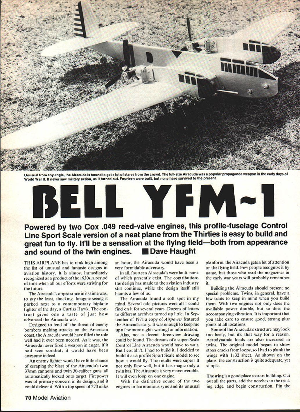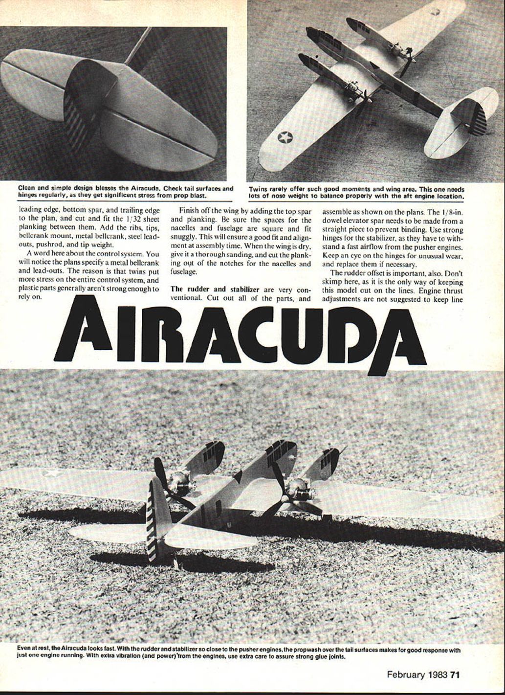 Unusual angie Airacuda bound get lot atares Irom crowd full-size Airacuda waa popular propaganda weapon early days World War ii never saw military action turned out Fourteen built have survived present Powered E two Cox 049 reed-valve engines profile-fuselage Control Line Sport Scale version neat plane Thirties easy build great fun fly Itll sensation flying fieldboth appearance sound twin engines U Dave Haught THIS AIRPLANE has rank high among list unusual fantasic designs aviation history almost immediately recognized product 1930s period time efforts striving future Airacudas appearance its time say least shocking Imagine seeing parked next contemporary biplane fighter day Curtiss Hawk con trast gives taste just advanced Airacuda Designed fend off threat enemy bombers making attacks American coast Airacuda would have filled role well ever needed As Airacuda never fired weapon anger seen combat would have awesome indeed An enemy fighter would have little chance escaping blast Airacudas twin 37mm cannons twin 30-caliber guns automatically locked onto target Firepower primary concern its design could deliver top speed 270 miles hour Airacuda would have very formidable adversary fourteen Airacudas built presently exist contributions design has made aviation industry still continue design itself still haunts few us Airacuda found soft spot mind Several odd pictures could find several years Dozens letters different archives turned up little Sep tember 1971 copy Airpower featured Airacuda story enough keep up few nights writing information Alas decent three-view drawing could found dreams super-Scale Control Line Airacuda would have wait couldnt build decided build profile Sport Scale model see would fly results super flew well has magic twin has Airacuda very maneuverable will loop engine distinctive sound two engines harmonious sync its unusual planform Airacuda gets lot attention flying field Few people recognize name read magazines early war years will probably remember Building Airacuda should present no special problems Twins general have few traits keep mind build two engines does available power double does accompanying vibration important take care ensure good strong glue joints locations Some Airacudas structure may look too beefy its way reason Aerodynamic loads also increased twins original model began show stress cracks loops plank wings / 32 sheet As shown plans construction quite adequate yet simple wing good place start building Cut out parts add notches trail ing edge begin construction Pin 70 Model Aviation Clean simple design blesses Airacuda Check tail surfaces Twins rarely offer such good moments wing area needs hinges regularly get significent stress prop blast lots nose weight balance properly aft engine location leading edge bottom spar trailing edge plan cut fit 1/32 sheet planking between Add ribs tips bellcrank mount metal belicrank steel lead outs pushrod tip weight word about control system will notice plans specify metal bellcrank lead-outs reason twins put stress entire control system plastic parts generally arent strong enough rely Finish off wing adding top spar planking sure spaces nacelles fuselage square fit snuggly will ensure good fit align ment assembly time wing dry give thorough sanding cut plank ing out notches nacelles fuselage rudder stabilizer very con ventional Cut out parts assemble shown plans / 8-in dowel elevator spar needs made straight piece prevent binding Use strong hinges stabilizer have stand fast airflow pusher engines Keep eye hinges unusual wear replace necessary rudder offset important also Dont skimp way keeping model out lines Engine thrust adjustments suggested keep line rest Airacuda looks fast rudder stabilizer close pusher engines propwaan over inc ieii suriaces manes gooa response just engine running extra vibration powerfrom engines use extra care assure strong glue jotnis February 1983 71 tension dynamics involved pusher engines located close center lift gravity make some complicated problems original model does well 0-0 thrust rudder offset shown Dont forget add notch fin dowel connecting elevators fuselage made two pieces sheet upper half notched fit leading edge spars trailing edge Make sure wing fuselage line up squarely glue bottom half place Use strong glue allow set before adding tail wheel stabilizer rudder assemblies drying cut out parts nacelles Cut notches fit wing glue together shown plans Take care ensure firewalls have unwanted offset Correct alignment problems wrap firewall areas light glass cloth Glue nacelles sew landing gear wires place Cover attachment points glass cloth add fairings bottom wing has dried sanded hook up pushrod adjust lead-outs Give entire model good sanding Fill dents rough areas Finish Airacuda five coats clear dope sand ing between coat overall color Airacuda silver Trim red blue shown plan paint curing add guns wheels set up engines power plants Cox 049s easy starting prime concern twin version larger tanks will give longer flight either will work well Whichever Cox engines choose use will need modified fol lows Remove backplate engines move fuel line pickup tube front tank Remember engines will facing rear model fuel pickup tubes need set outside corner tank Set both engines same will draw fuel same way Reinstall tanks tighten screws wont leak Mount engines checking 0-0 thrust Balance Airacuda shown plan Airacuda very responsive model tends overly sensitive balanced shown Dont worried about amount weight takes bal ance plane added power large wing area Airacuda will easily carry weight Before heading out flying field few Continued page 159 OSHEETOPSR N0ERACOK AA0 WIEU WE OATMW00 RHASS Ar71I~i] Zi iZZiIILLE 000ThK 32AN WAS 5 0 LEADNA .5-'ALL RIBS ARELEAVE 328 SPBOE FORTSP N BOTTOMEDGE E3232 SHEETNACaLES N PGSELAAE F LER LAO 8 DOWEL~2A0OR O NOR PLANK TOP B BOTTOM WITH 032 SASET NOTE NOTCHES FOR RIBS K 128 PLTWSOEI BELLIZOAMI MT NOTE 800008 OFFSET 00000 OR-- -_________ NYLON RINSESI/H GR