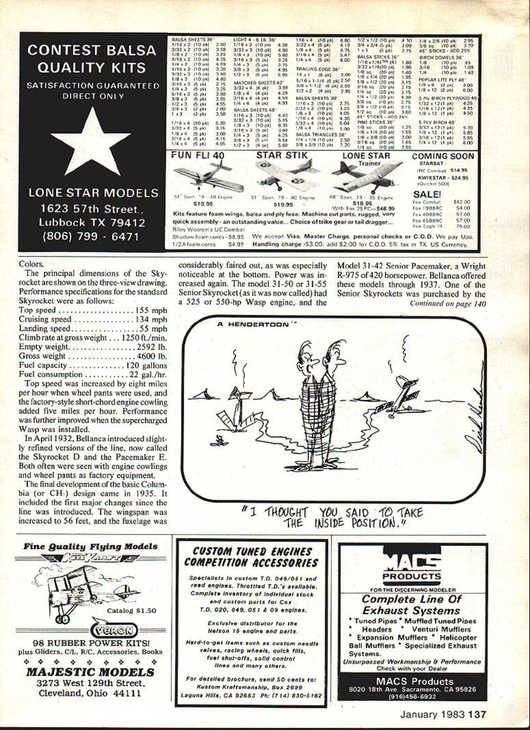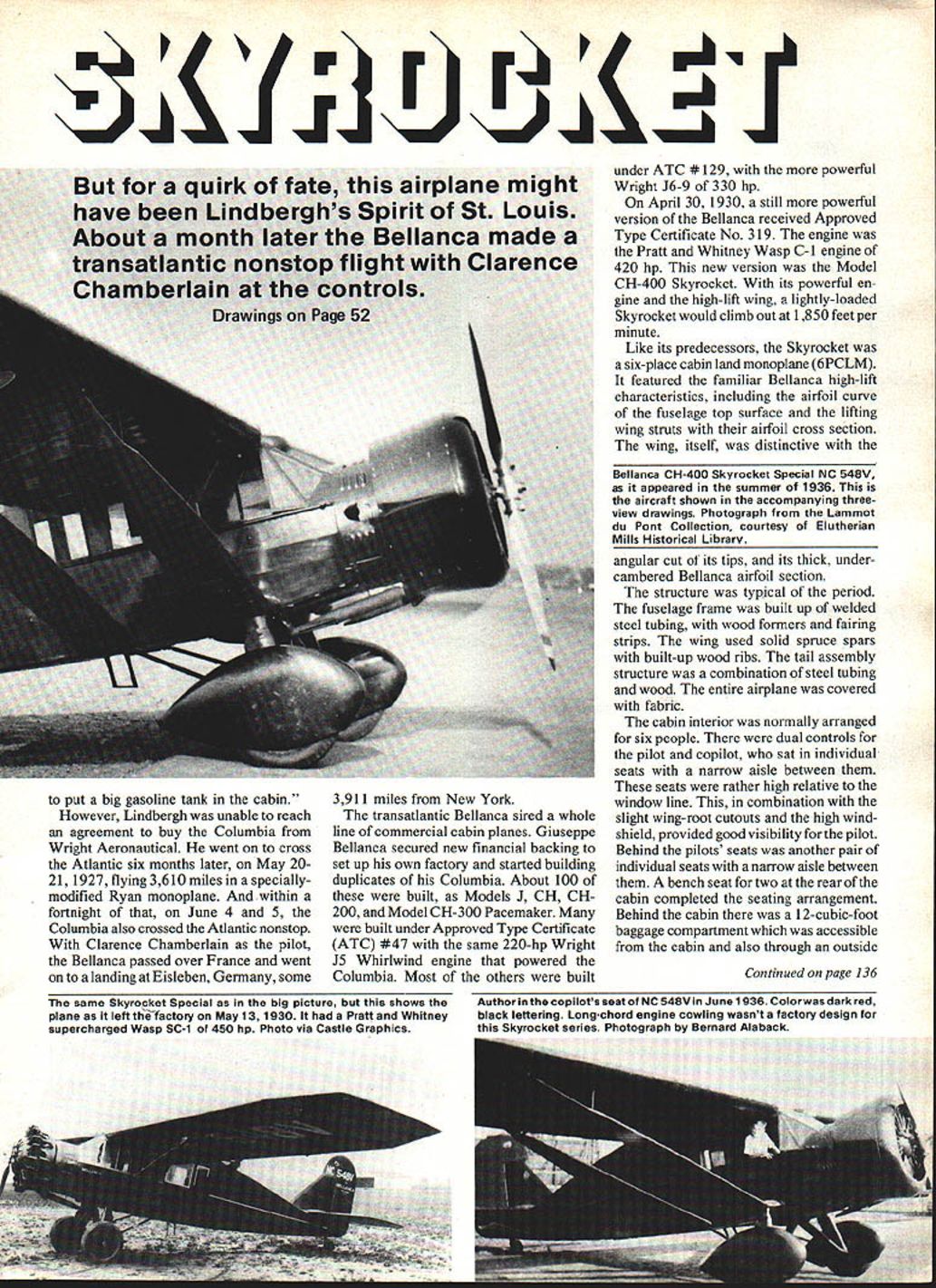iI WHEN IT WAS introduced spring 1930 Bellanca Skyrocket represented latest powerful version already-famous airplane design traced its origin back five years record-break ing prototype 1925 Giuseppe M Bellanca de signed built high-wing cabin mono plane Wright Aeronautical Corpo ration Wright commissioned design show off new Model J4 engine 200 horsepower plane known Wright-Bellanca WB-1was destroyed downwind landing attempt late 1925 second airplane design built 1926 landing gear simplified engine latest Wright air-cooled radial 220-horsepower Model J5 Wright-Bellanca WB-2 later named Bellanca Columbia Bellanca won both efficiency contests Detroit News Trophy speed 1926 National Air Races duly noted Charles Lindbergh chief pilot Robertson Aircraft Cor poration Robertson held air-mail con tract CAM No 2 between St Louis Chicago using Liberty-powered DeHavil land DH-4s route inefficiency war-surplus planes set Lindbergh dreaming Bellanca night September 1926 flying mail Chicago Lindbergh later recalled thoughts book Spirit St Lou grow conscious limits biplane inefficiency its wings struts wires bind earth field ahead Chicago Bellanca would cruise least 15 miles hour faster burn half amount gasoline carry double payload DH. Bellanca Id show St Louis businessmen what modem aircraft could do.. kinds records could break demonstrationdistance altitude load non-stop flights across country ging accounts Ive read its efficient plane ever G James Alaback built siblymy mind startled its thoughtI could fly non-stop between New York Paris New York Parisit sounds like dream yetif could carry fuel enough Bellanca mightif engine didnt stop new Wright Whirlwinds seldom stop arent like old Libertiesif just held right course long enough should arrive Europe Over next few weeks Lindbergh decided seriously pursue Orteig prize first nonstop New York Paris flight first secured preliminary financial backing group St Louis businessmen November 1926 meeting Giuseppe Bellanca Waldorf-Astoria Hotel New York plane fully capable flying nonstop New York Paris Bellanca told Lindbergh will necessary Registred NR 179N first Bellanca CH-400 Skyrocket spe cial 450-hp supercharged Wasp SC-i engine single cabin door Standard engine 420-hp Wasp C1 Note pilots raincoat draped wing Strut galoshes ground below Hugh W Butterfield pic Wright-Bellarica WB-2 Columbia looked November 1926 Lindbergh tried buy attempt non-stop flight New York Paris fuselage tail silver wing clear-dooed fabric lwhich looked tan light yellow Hank Clark pic /EJ YFj\9\i1jLj to put big gasoline tank cabin However Lindbergh unable reach agreement buy Columbia Wright Aeronautical went cross Atlantic six months later May 2021 1927 flying 3610 miles speciallymodified Ryan monoplane within fortnight June 4 5 Columbia also crossed Atlantic nonstop Clarence Chamberlain pilot Bellanca passed over France went landing Eisleben Germany some 3911 miles New York transatlantic Bellanca sired whole line commercial cabin planes Giuseppe Bellanca secured new financial backing set up own factory started building duplicates Columbia About 100 built Models J CH CH 200 Model CH-300 Pacemaker built under Approved Type Certificate ATC #47 same 220-hp Wright J5 Whirlwind engine powered Columbia Most others built under ATC #129 powerful Wright J6-9 330 hp April 30 1930 still powerful version Bellanca received Approved Type Certificate No 319 engine Pratt Whitney Wasp C- 1 engine 420 hp new version Model CH-400 Skyrocket its powerful en gine high-lift wing lightly-loaded Skyrocket would climb out 1850 feet per minute Like its predecessors Skyrocket six-place cabin land monoplane 6PCLM featured familiar Bellanca high-lift characteristics including airfoil curve fuselage top surface lifting wing struts airfoil cross section wing itself distinctive Bellanca CH400 Skyrocket Special NC 548V appeared summer 1936 aircraft shown accompanying three view drawings Photograph Lammot du Pont Collection courtesy Elutherian Mills Historical Library angular cut its tips its thick undercambered Bellanca airfoil section structure typical period fuselage frame built up welded steel tubing wood formers fairing strips wing used solid spruce spars built-up wood ribs tail assembly structure combination steel tubing wood entire airplane covered fabric cabin interior normally arranged six people dual controls pilot copilot sat individual seats narrow aisle between seats rather high relative window line combination slight wing-root cutouts high wind shield provided good visibility pilot Behind pilots seats another pair individual seats narrow aisle between bench seat two rear cabin completed seating arrangement Behind cabin 12-cubic-foot baggage compartment accessible cabin also through outside Continued page 136 Author inthe copilots seat NC 548V June1936 Colorwasdark red black lettering Long-chord engine cowling wasnt factory design th kyrocket series Photograph Bernard Alaback same Skyrocket Special big picture shows plane left factory May13 1930 Pratt Whitney supercharged Wasp SC1 450 hp Photo via Castle Graphics AMA Building Update XV THE BUILDING FUND drive 1982 few months left go written have acknowl edged update reports will also given special recognition new home aeromodeling Since project has needed considerable amount money just get started contributed beginning will have up front recognition entrance new home reserved honoring donated first needed years come certain hobby businesses individuals clubs will want donations honored ac knowledgement up front lobby building lobby area reserved just contributed prior De cember 31 1982while Building Fund Drive names record various scrolls plaques real Whos aeromodeling chil dren visit AMA HQ AMA Museum will enjoy seeing name group own name display up front After first year lists finalized will publish names level donation will done first acknowledge donors once again second ensure have ones name way donor wishes placed scroll plaque alms race continues re