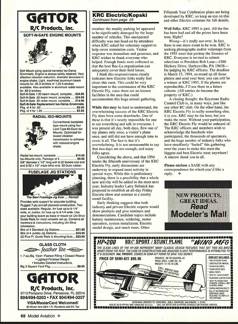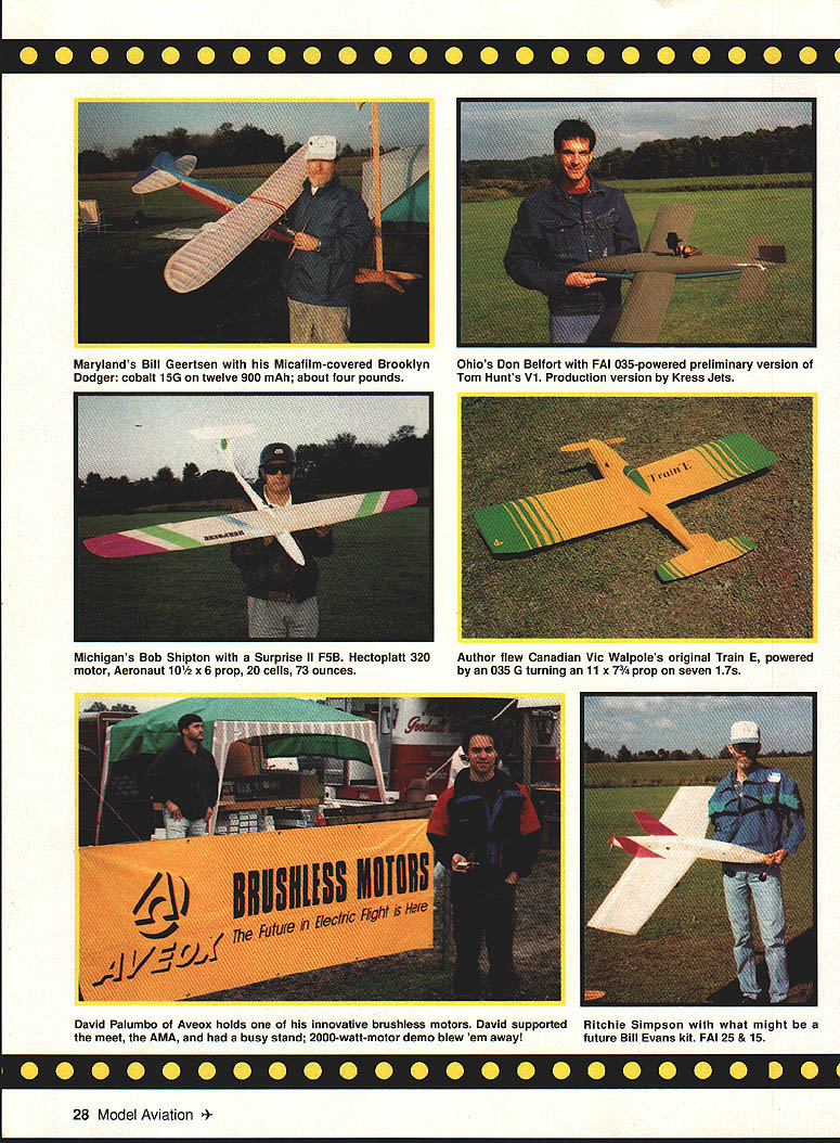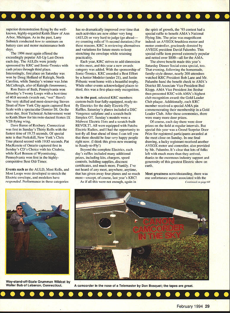 E 1993 KEYSTONE Radio fControl Electric Fly held September 18-19 paraphrase attendees left field Sunday best ever its fourteenth consecutive running prestigious Fun-Fly has established largest Electric gathering nation possibly world Folks attended over country well Canada Great Britain hundred sixty-one modelers registered Frequency Control logged approximately 600 flights attended KRC year read through endit may well worth weather less best enough H20rain What truly amazing rain cannot dampen Electric Spirit off-and-on light rain before weekend Saturday some understandable concern meets success As turned out however weather just didnt matter Indeed few transmitter antennas seen probing underneath umbrellas because rain threat thereof Except few several-minute-long periods Saturday always planes sky Friday pre-meet crowdthose cant wait scheduled days always come earlydid lots informal flying also under rain-threatening conditions Its become routine see lots folks flying Friday afternoons field being prepared visitors actually joined KRC field setup seems part Electric spirit Sundays weathersun some light breezeproperly rewarded stayed over came day Traditionally KRC meet formal two-day AMA-sanctioned affair held field borrowed Bucks-Lehigh c~oSportsmen Quakertown 3insylvaabout hour north delph spacious field over 900 once again filled both days War there people populated Friday evening due t e ormal Friday Night Fly organized did go Well Larry tells registered 22 participants Night Fly activity fitted just perfectly between some showers Its almost though Electric favored high After Electric does mess up environment some other means Hying began dark lasted about two hours Pilots flew time thorough delight large crowd estimated over 100 persons Some Night Fly participants no previous night-flying experience others well-seasoned Several Electrics fully equipped built-in lighting systems others taped-on chemical light sticks graciously provided Larry majority flew docile Old-Timer sailplane configurations some spirited performers planes both hand-launched ROG everyone seemed have great time evident cheering crowd reception activity positive plans underway bigger better Night Fly 1994 Look details column 1994 meet mailer Historically KRC Electric Fly has simple format offering nearly continuous open flying some special activities mixed include simple competitive events anyone interested some Ontarios Ross Smith Easy Built Space Walker cobalt 15G 12 14s February 1994 27 cooperation KRC Buc-Le Larry Sribnick SR Batteries Night Fly sort pre-meet meet response modelers show up field day early Friday crowd larger everpossibly encouraged add-on Night Fly see came first situation K U U U U U U U U rylands Bill Geertsen Micaflim-covered Brooklyn Dodger cobalt 15G twelve 900 mAh about four pounds 28 Model Aviation s Don Belfort FAI 035-powered preliminary version Tom Hunts Vi Production version Kress Jets Michigans Bob Shipton Surprise II F5B Hectoplatt 320 Author flew Canadian Vic Walpoles original Train E powered motor Aeronaut 10 x 6 prop 20 cells 73 ounces 035 G turning 11 x 7 prop seven 17s David Palumbo Aveox holds innovative brushless motors David supported Ritchie Simpson what might meet AMA busy stand 2000-watt-motor demo blew em away future Bill Evans kit PAl 25 & 15 [t U U U U U U U U U U U U U U U U U U U U U U superior demonstration flying wellknown highly-regarded Keith Shaw Ann Arbor Michigan As past Larry Sribnick conducted seminars battery care motor maintenance both days 1994 meet again offered exceedingly popular All-Up Last-Down day AULDs jointly sponsored KRC Sonic-Tronics cash prizes through third place Interestingly first place Saturday won Doug Holland Raleigh North Carolina Sundays winner John McCullough also Raleigh hmmmmm Ron Bates Bath Pennsylvania won Saturdays Twenty Loops best time 408 seconds watch out wet fliers very skilled most-deserving Steven Stratt New York City again captured Best Scale spectacular Domier DI same day Best Technical Achievement went Keith Shaw twin-ducted Horten IX V2B flying wing Dave Baron Roxbury Connecticut first Sundays Thirty Rolls fastest time 1975 seconds special note Peekskill New Yorks Chris True placed second 1985 seconds Pat MacKenzie Ontario captured first Sundays CDs Choice Citabria Karl Benson Wyomissing Pennsylvania won first highlycompetitive Best Old-Timer Events such AULD Most Rolls Most Loops developed stretch Electric envelope modelers have responded Performance categories has dramatically improved over time such activities now either very long AULD very hard judge go ahead try counting rolls 2A-second duration reasons KRC reviewing altematives variations future meets keep stretching envelope retaining practicality year KRC strives add dimension meet year new awards category added sponsorship Sonic-Tronics KRC awarded Best Effort Junior Modeler under 21 Justin Pribanic went home beautiful trophy other events acknowledged places third first-place-only recognition As past selected KRC members custom-built four fully-equipped ready-tofly Electrics daily Electric Fly Raffles Saturdays planes included DSC Vengence sailplane scratch-built Simplex OT Sundays models Midwest Electric Hots scratch-built REVOLT equipped Futaba Electric Radios opportunity test-fly four ahead time can tell should four very happy people right now think gives new meaning Ready-toFly Beyond complete Electrics days raffles included additional prizes including kits chargers speed controls building supplies discount certificates much Frankly Ive heard meet anywhere anytime has given away four planes much moreexcept course last years KRC As enough again spirit growth 93 contest special raffle benefit AMAs National Flying Site prize magnificent indeed AVEOX brushless motor motor controller graciously donated AVEOX president David Palumbo special raffle item proved extremely popular netted over $800all AMA above benefit made years Saturday Dinner Social extra spec