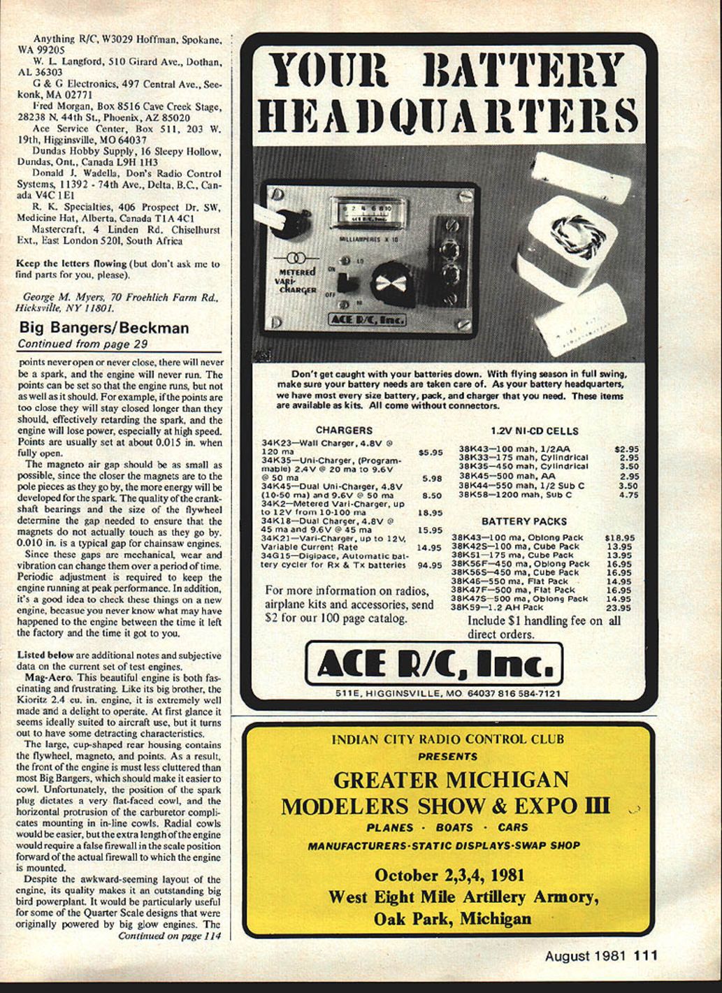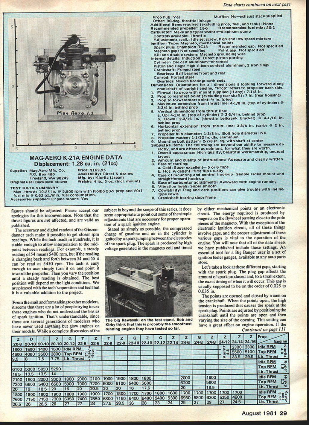 Beckman Kirby Crawford hi ban ersfo Part Three series power plants big uns Bob Kirby discuss five engines range smallest about biggest gasoline-burners THIS INSTALLMENT covers almost entire size range Big Bird gasoline burners 12 Cu fl MagAerotoa48 Cu special order engine Roush Mfg interesting note both engines based Kioritz products between extremes look three engines Roper Husky Kawasaki Refer Part 1 series April 81 Model Aviation description test equipment procedures has significant addition test equipment beginning have doubts about venerable old Heathkit Thumb Tach Now thanks Dick Penrod Giezen danner USA have use Giezendanner Digital Tachometers device easier read much accurate addition helped us identify rather embarrassing error original setup Bobs old Thumb Tach used several years instruction book long gone checked agalnst incandescent light 3000 rpm reading seemed correctdue faulty memory little thought would have realized should have 3600 until read instructions Digital Tach mistake became obvious cross-checking between two find multiplying Thumb Tach readings 12 yields same reading Giezendanner unit within rpm accuracy Thumb Tach itself previously published rpm D TZTZZDTZDTZ TZ KTZD T 15-61164 165 166 16-6 16-8 186 18-6 186 18-8 18-8 18-8 18-10 18-10 20-5 204 20-6 20-8 20-8 RPM 1900 1900 1900 1800 1800 f7 i T T7 1700 1700 1600 1600 1600 1600 1400 1800 1800 mu Top RPM 7350 18400 73006900 6850 6300 5600 6200 5800 5600 5600 5800 4950 5300 5500 5000 5600 5200 4600 Lb Thrust 65775 75 8825 8 55 10 5 10 9510 le RPM See Rorer Ntes Top RPMIOOOU G1009600940087007150840076007400710072006000650070006200700063506550 rust 145 135 16155 155 1614175 16145 16151415155 155 165 155 15 RPM 2500 2600 2500 2500 2600 2500 2400 2200 2500 2300 2600 2300 2100 EEL RPM 00 8500 3000 8000 8400 7400 8400 7300 7200 hrust18 205 201719195 185 185 202020195 2 RPMDDynathrustGGrish 2200 2200 23002000 2000 Top RPMKKoIboTTop FlitsZZinger8250 8900 8100 8550 7800 7500 rust-2353525562 28 Model Aviation smaii DUT impressive Mag-Aero Hywneel maaneto onints arm innida thin mar hounino Digital Tachometerfrum iaIeunuanner UM vaiuaoieaooiion tfl projects gear Headout units 100 rpm point prop move around until steady reading obtained ins HOPC 19 purrsawayon tuel consumption test run lumberyard props front Data charts continued next page figures should adjusted Please accept apologies inconvenience Note thrust figures affected valid published accuracy digital readout Giezen danner tach make possible get closer rpm readings tach reads hundreds stable enough allow interpolation mid point between readings example steady reading 54 means 5400 rpm reading changing back forth between 54 55 can read 5450 rpm tach easy enough use simply turn point toward propeller vary position until steady reading obtained best position will depend light conditions pleased tachs operation feel valuable addition project mail talking other modelers seems lot people trying use engines understand basics spark ignition Thats understandable since several generations modelers have never used anything glow engines models complete discussion Prop hub YesMuffler Noexhaust stack supplied Other 90-dog throttle linkage Additional items requird excluding prop fuel tank None Recommended propeller 18-6 Recommended fuei mix 201 Carburetor Make type Waibrodiaphram pump Controls availabie Throttle Adjustments avali idle set screw high low speed mixture ignitionType Magneto mechanical points Spark plug Champion RCJ8 Recommended gap specified Magneto gap specified Point gap specified Kill disable system Magneto grounding wire Internal details induction Direct piston porting Cyiinder Die cast aluminumchromed Piston rings High silicon content aiuminum 2 iron rings Crankshaft Forged steel Bearings Ball bearing front rear Conrod Forged steel Bearings Needle bearings both ends Dimensions Orientation dimensions looking forward along crankshaft upright engine Prop refers propeller back side 1 Firewall prop mount supplied 7-1/8 2 Prop reermost point excluding rear shaft 7 rear housing 3 Prop forwardmost point /4 plug 4 Maximum extension thrust line 4-1/8 top cylinder @ 3-3/4 behind prop 5 Vertical dimensions thrust line a Up 4-1/8 top cylinder 0 3-3/4 behind prop b Down 2-3/16 throttle belicrank bracket @ 4-1/16 behind prop 6 Horizontal extension thrust line 3-38 carb 0 2 behind prop 7 Propeller hub diameter 1-3/8 Bolt hole diameter NA 8 Propeller washer 1-1/32 dia aluminum 9 Mounting bolt pattern 2-7/8 sq shaft center Subjective items following beyond ability measure di rectly offered opinions what worth 1 Overall appearance High quality beautiful workmanship unusual layout 2 Amount quality instructions Adequate clearly written 3 Ease starting a Cold Super excellent 5 6 flips b Hot delightfirst flip usually 4 Ease mounting control hook-up Simple radial mount straightforward hook-up 5 Ease carburetor adjustments Awkward engine running 6 Vibration levels Super smooth - 7 Cowlabillty Plug carb positions can give trouble in4lnetype cowls 8 Crankshaft bearIng slop None subject beyond scope series does seem appropriate point out some simple adjustments necessary proper opera tion spark ignition engine Stated simply possible compressed charge gasoline air cylinder ignited spark jumping between electrodes spark plug spark produced high voltage generated magneto coil timed either mechanical points electronic circuit energy required produced magnets flywheel passing close pole pieces magneto exception electronic ignition circuit things involve gaps proper adjustment various gaps vital operation engine will note data sheets have published include settings An essential tool Big Banger user set ignition feeler gauges avallable auto parts store Lets take look different gaps starting spark plug plug gap affects amount spark produced small extent exact timing will occur gap usually supposed order 0025 0035 points opened closed cam crankshaft points open high tension produced causes spark spa