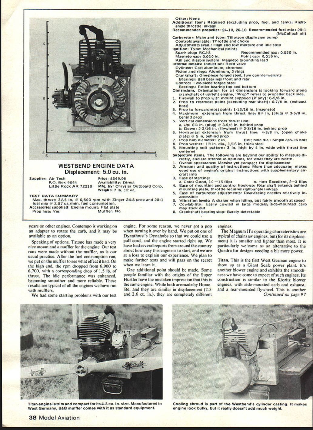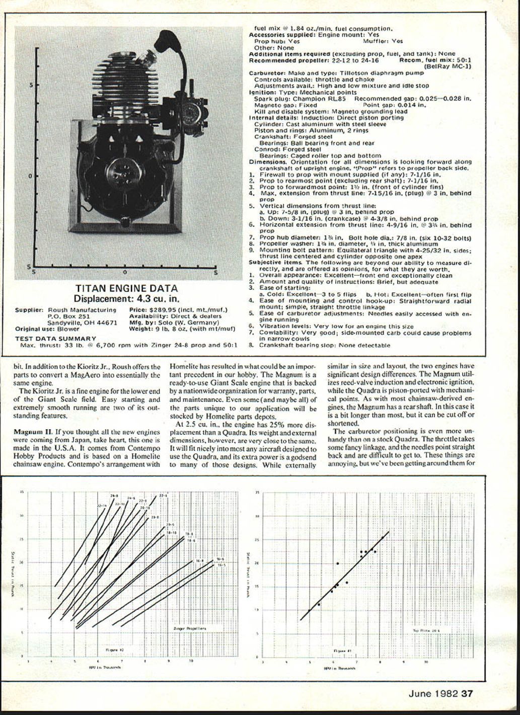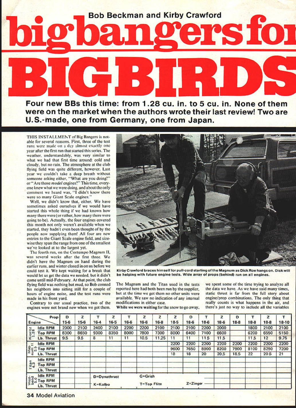 Bob Beckman Kirby Crawford hi ban ersfoi Four new BBs time 1 28 Cu 5 Cu None market authors wrote last review Two US-made Germany Japan THIS INSTALLMENT Big Bangers able several reasons First three test runs made day almost exactly year after first run started series weather understandably very similar what first time around cold cloudy no rain atmosphere club flying field quite different however Last year couldnt take deep breath someone asking either What doing Are model engines time knew what doing about comment heard didnt know Giant Scale engines Well didnt know either have sometimes asked ourselves would have started whole thing known manytherewereorrather howmanytherewere going Actually four engines covered month werent available started hadnt thought people now supplying four new entries Giant Scale engine field sizewise span range smallest weve looked largest yet fourth run Contempo Magnum II several weeks after first three didnt have Magnum hand during earlier runs winter closed us before could test kept waiting break would let us get data needed didnt come until mid-February point club flying field nothing mud Bob conned neighbors sitting still couple hours engine noise test runs made front yard Contrary usual practice two engines brand new got Magnum Titan used tests reported both run supplier time got no other units available saw no indication internal modifications either case waiting snow go away spent some time trying analyze data have As have said times static thrust far full story about engine/prop combinations thing really counts what happens air theres just no way include variables PropD rzTZZZDTzDTZT Engine15-615616-416-516-616-616-818-518-618-618-6 118-818-818-818-10 N Idle RPM2000 2100 2400 2100 2200 2200 2100 2100 2100 2200 2000 11800 2100 2100 t ~JJ Top RPM8300 8650 9300 8350 8000 7800 7300 8000 6400 7100 66006200 6550 5150 rust 95958iir 111051125 111111511511512975 Idle RPM r 2200 2200 2200 2200 2200 2200 2200 2200 ETop RPM 9600 7650 8900 8200 7900 8100 8250 7200 Lb Thrust 18 18 20 205 185 22 205 21 Idle RPM Top RPM Lb Thrust Idle RPMDDynathrustGGrish ~Top_RPM Lb ThrustKKoIbo2 2 TTop FliteZZinger 34 Model Aviation Kirby Crawford braces himself pull-cord starting Magnum Dick Roe hangs Dick will helping future engine tests Wide array props behind run engines Supplier Roush Manufacturing PO Box 251 Sandyville OH 44671 Original use Backpack blower Price $15995 Availability Direct & Dealers Mfg Kioritz Japan Weight 4 lb 8 oz mci mount TEST DATA SUMMARY Max thrust 12 lb @ 6550 rpm Zinger 18-8 prop 501 fuel mix @ 063 oz/min fuel consumption Accessories supplied Engine mount Yes Prop hub YesMuffler No Other None Additional items required excluding prop fuel tank None Recommended propellerRecommended fuel mix 501 Bel Ray MCi Carburetor Make type Waibro diaphragm pump Controls available Throttle Adjustments avail High low mixture idle stop Ignition Type Mechanical points Spark plug RCJ-8Recommended gap 0025 Magneto gap 0010 inPoint gap 0015 Kill disable system Magneto grounding lead Internal details Induction Direct piston porting Cylinder Aluminum chromed Crankshaft Forged steel three pieces pressed together Bearings Caged ball bearings front rear Conrod Forged Steel Bearings Caged roller top bottom Dimimensions Orientation dimensions looking forward along crankshaft upright engine Prop refers propeller back side 1 Firewall prop mount supplied 6-1/8 2 Prop rearmost point excluding rear shaft 6-1/8 3 Prop forwardmost point 11 crankcase 4 Maximum extension thrust line 8-11/16 plug @ 2/4 behind prop 5 Vertical dimensions thrust line a Up 8-11/16 plug 0 2/4 behind prop b Down 1/4 rear housing/mount @ 6-1/8 behind prop 6 Horizontal extension thrust line 31/4 carb mounting screws @ 2/4 behind prop 7 Propeller hub diameter 1/4 in Bolt hole diameter 3/s three 8-32 bolts 8Propeller washer 1/4 dIameter 3/16 thick aluminum 9Mounting bolt pattern 33/4 wide 21/2 high thrust line center Subjective items following beyond ability measure di rectly offered opinions what worth 1 Overall appearance Neat compact except rear flywheel hous ing obviously high quality 2 Amount quality instructions available report time 3 Ease starting a Cold ExcellentS 10 flips b Hot Excellentoften first flip 4 Ease mounting control hook-up Simple radial mount straight-through throttle hook-up 5 Ease carburetor adjustments Easy access engine running 6 Vibration levels Extremely smooth speeds 7 Cowlabillty Good except side-mounted carb 8 Crankshaft bearing slop None detectable test rig like However should some way use data very least selecting prop range props start sure weve really got yet well tell what thinking point welcome comments suggestions rest tried putting data several different forms seemed interesting plot thrust versus rpm prop Figure No 1 example what did using data Top Flite 20-6 dot repre sents observed thrust rpm engine prop first glance seems like very random collection some pretty reasonable assumptions can made First seems logical thrust produced pro peller going vary directly rpm Second variation should pretty linear over usable range As rpm increases cavita tion other effects will reduce props efficiency saw no clear evidence ever reached point props used random collection dots now begins take meaning can see definite trend lower left upper right across graph laying straightedge down taking eyeball average can draw idealized curve props performance point someone bound ask line represents props performance arent dots line Thats valid question answer cant control compensate variables involved example should obvious change air density will change thrust produced given rpm test runs made different times very different atmospheric conditions fact surprised data isnt scattered Plots made props combined manufacturer charts like Figure No 2 shown Zinger Handy Kioritz inductive tach Roush Manu facturing Unit senses counts spark plug discharges indicate rpm Z K T T Z 0 T Z G Z Z T ZProp 18-1020-520-