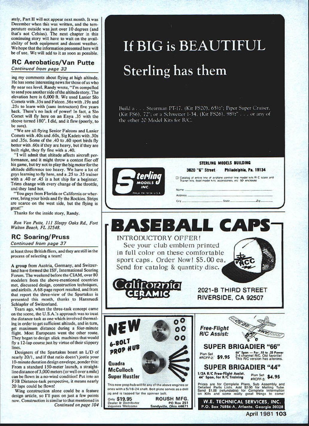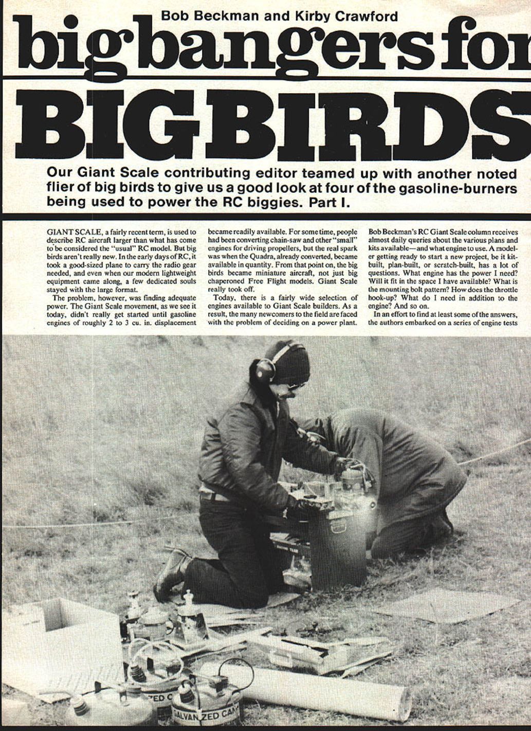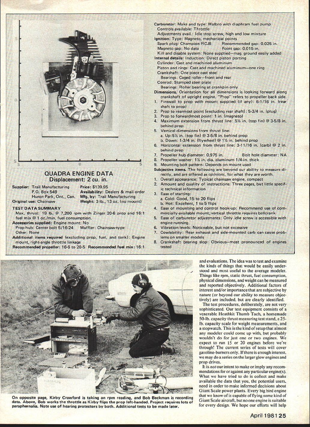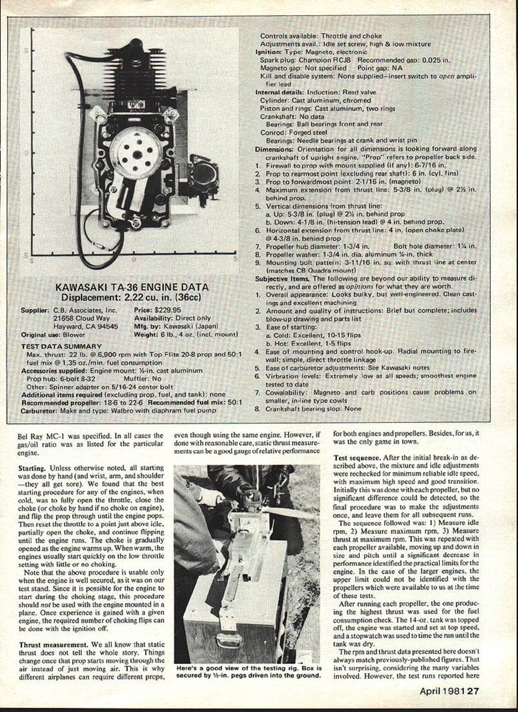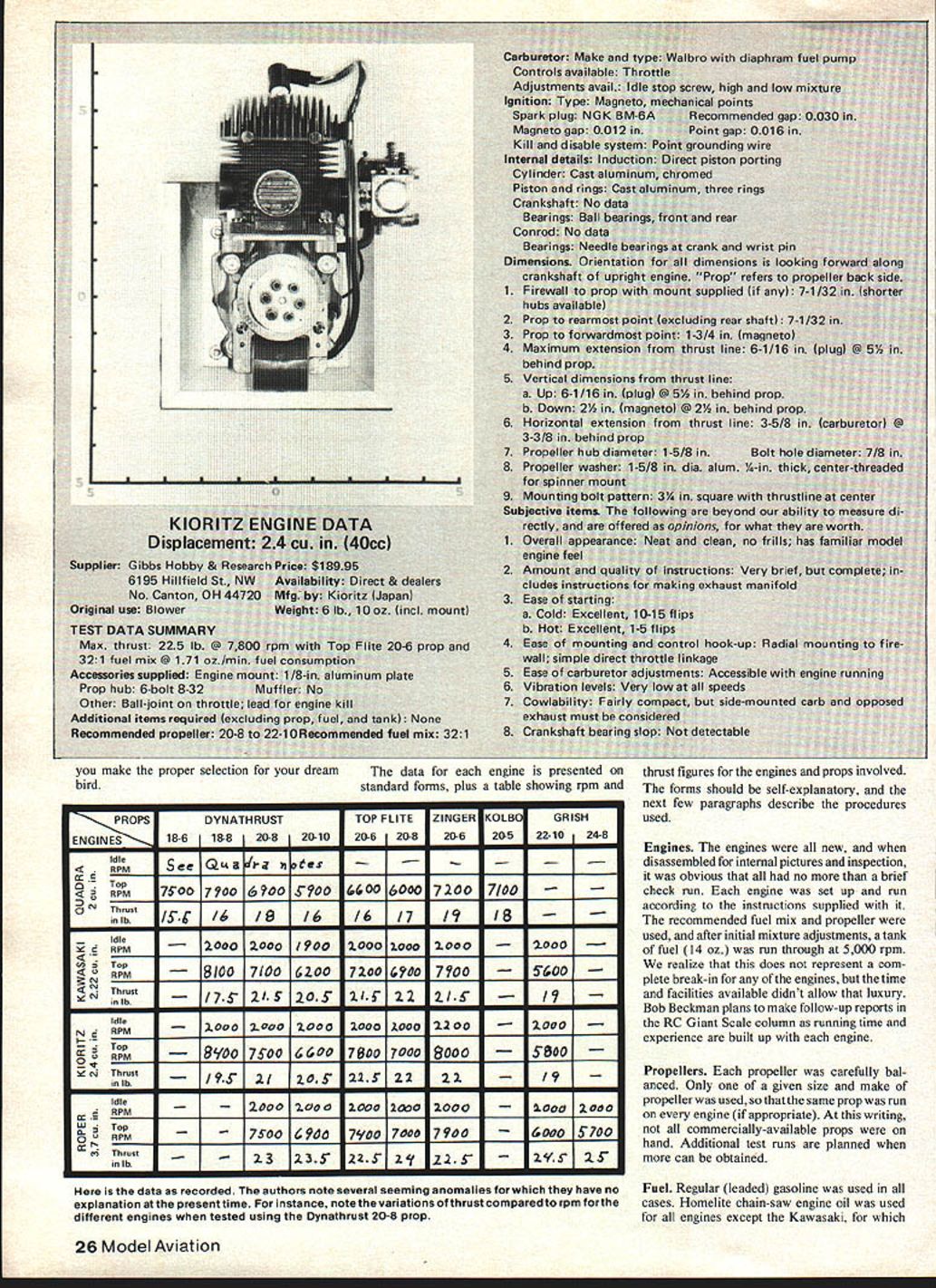 b Beckman Kirby Crawford hi ban ersfo Giant Scale contributing editor teamed up another noted flier big birds give us good look four gasoline-burners being used power RC biggies Part GIANT SCALE fairly recent term used describe RC aircraft larger what has come tobe considered usual RC model big birds arent really new early days RC took good-sized plane carry radio gear needed modern lightweight equipment came along few dedicated souls stayed large format problem however finding adequate power Giant Scale movement see today didnt really get started until gasoline engines roughly 2 3 cu displacement became readily available some time people converting chain-saw other small engines driving propellers real spark Quadra already converted became available quantity point big birds became miniature aircraft just big chaperoned Free Flight models Giant Scale really took off Today fairly wide selection engines available Giant Scale builders As result newcomers field faced problem deciding power plant Bob Beckmans RC Giant Scale column receives almost daily queries about various plans kits availableand what engine use model er getting ready start new project kitbuilt plan-built scratch-built has lot questions What engine has power need Will fit space have available What mounting bolt pattern does throttle hook-up What need addition engine effort find least some answers authors embarked series engine tests evaluations idea test examine kinds things would easily under stood useful average modeler Things like rpm static thrust fuel consumption physical dimensions weight can measured reported objectively Additional factors interest and/or importance subjective nature beyond ability measure objec tively included clearly identified test procedures deliberately very sophisticated test equipment consists venerable Heathkit Thumb Tach homemade SO-lb capacity thrust measuring test stand 25lb capacity scale weight measurements stopwatch kind setup almost modeler could come up probably wouldnt just two engines expect run 15 20 engines before through current series tests will cover gasoline-burners enough interest may series larger glow engines prop drives intent make imply recom mendations against particular engines What have tried collect make available data potential users need order make informed decisions about Giant Scale power plants big bird engine know capable flying some kind Giant Scale aircraft no engine suitable design hope efforts will help April 1 981 25 opposite page Kirby Crawford taking rpm reading Bob Beckman recording data Above Bob works throttle Kirby flips prop left-handed Project requires lots paraphernalia Note use hearing protectors both Additional tests made later & dealers japan z mci mount 2a-6 prop plate ank None ad fuel mix 321 make proper selection dream bird data engine presented standard forms plus table showing rpm m PROPSDYNATHRUSTTOP FLITEZINGER KOLBOGRISH ENGINES18-6 18-8 20-820-1020-620-8 20-620-52210248 Idler RPM3ee ULIA aij Top RPM7500 7900 6900 590000 6000 72007100 Thrust nib/5 /619/6/6 17/918 Idle 20002000 900 2000 1000 2000 Ci RPM 81007100 6200 7200 600 7900 oo Thrust nib/75215QO52/S221/5 1 Idle~95ct2000200022002000 RPM 5500 Top RPM8i00750060076007000Sooo NThrust2120522522 22 lb173 Idle cRPM2Ooo200520001000100020082000 Top 75000o710070007900c0o05700 oRPM mi. Thu335225 1z525 oh data recorded authors note several seeming anomalies have no explanation present time instance note variations thrust compared rpm forthe different engines tested using Dynathrust 20-8 prop thrust tigures tor engines props involved forms should self-explanatory next few paragraphs describe procedures used Engines engines new disassembled internal pictures inspection obvious no brief check run engine set up run according instructions supplied recommended fuel mix propeller used after initial mixture adjustments tank fuel 14 oz run through 5000 rpm realize does represent com plete break-in engines time facilities available didnt allow luxury Bob Beckman plans make follow-up reports RC Giant Scale column running time experience built up engine Propellers propeller carefully bal anced Only given size make propeller used same prop run engine appropriate writing commercially-available props hand Additional test runs planned can obtained Fuel Regular leaded gasoline used cases Homelite chain-saw engine oil used engines except Kawasaki 26 Model Aviation Bel Ray MC-1 specified cases gas/oil ratio listed particular engine Starting Unless otherwise noted starting done hand wrist arm shoulder get sore found best starting procedure engines cold fully open throttle close choke choke hand no choke engine flip prop through until engine pops reset throttle point just above idle partially open choke continue flipping until engine runs choke gradually opened engine warms up warm engines usually start quickly low throttle setting little no choking Note above procedure usable engine well secured test stand Since possible engine start during choking stage procedure should used engine mounted plane Once experience gained given engine required number choking flips can done ignition off Thrust measurement know static thrust does tell whole story Things change once prop starts moving through air instead just moving air different airplanes can require different props 8 though using same engine However done reasonable care static thrust measure ments can good gauge relative performance both engines propellers Besides us game town Test sequence After initial break-in de scribed above mixture idle adjustments rechecked minimum reliable idle speed maximum high speed good transition Initially done propeller no significant difference could detected final procedure make adjustments once leave subsequent runs sequence followed 1 Measure idle rpm 2 Measure maximum rpm 3 Measure thrust maximum rpm repeated propeller available moving up down size pitch until significant decrease performance identified practical limits engine case la