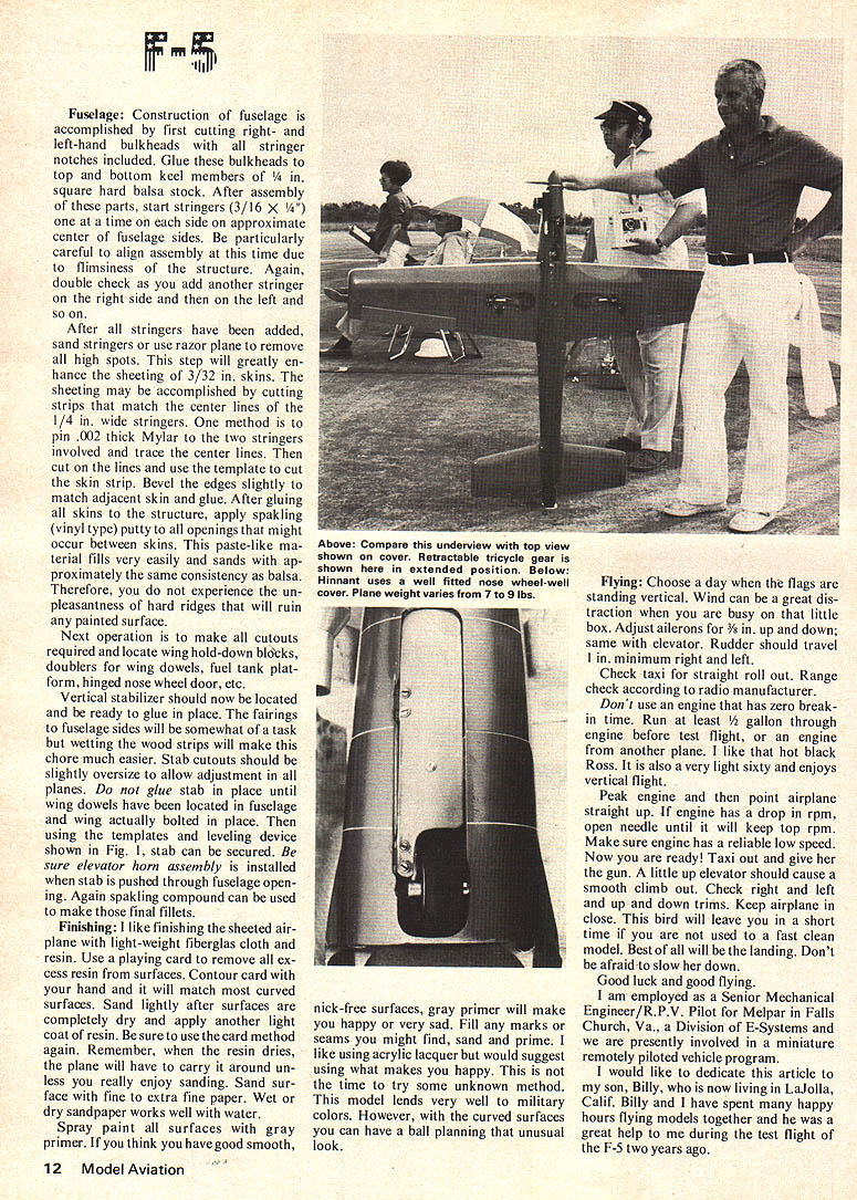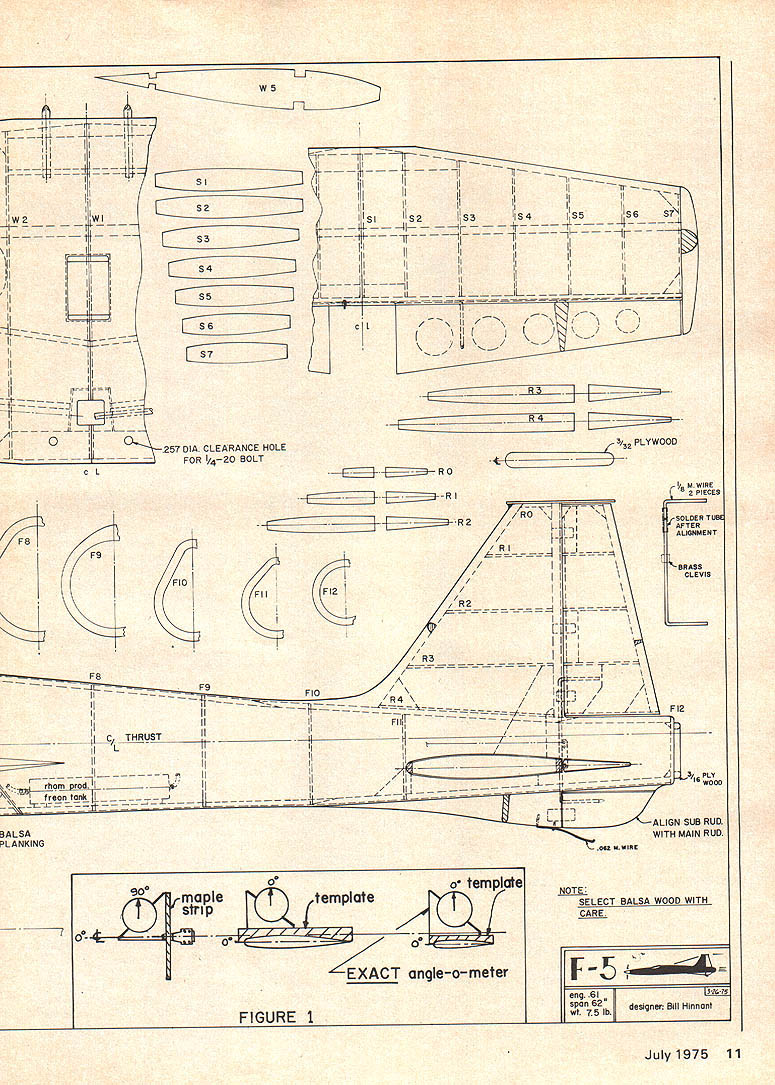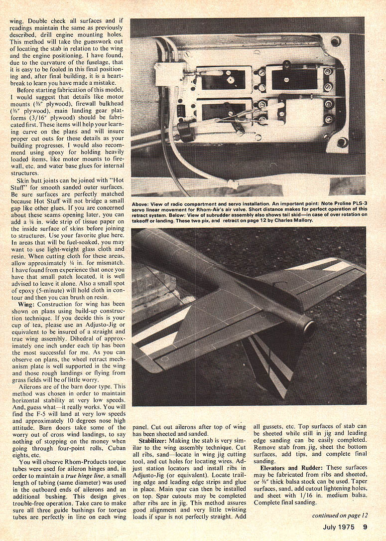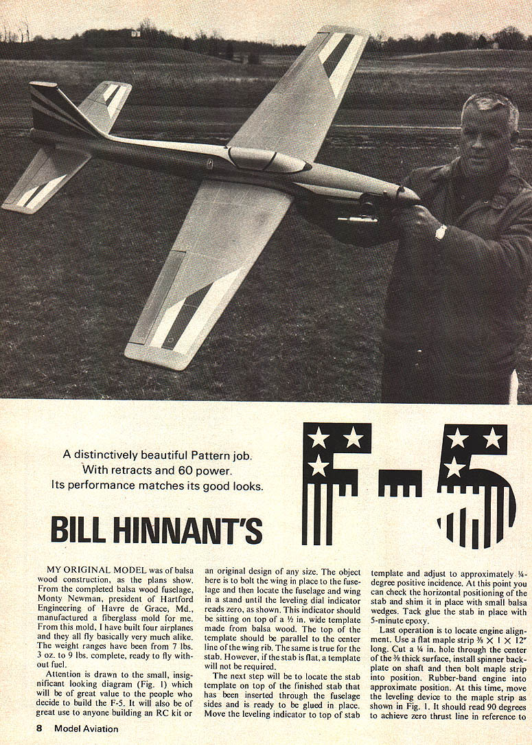 A distinctively beautiful Pattern job retracts 60 power Its performance matches its good looks BILL HINNANTS IIIiiII MY ORIGINAL MODEL balsa wood construction plans show completed balsa wood fuselage Monty Newman president Hartford Engineering Havre de Grace Md manufactured fiberglass mold mold have built four airplanes fly basically very much alike weight ranges have 7 lbs 3 oz 9 lbs complete ready fly out fuel Attention drawn small insig nificant looking diagram Fig 1 will great value people decide build F-S will also great use anyone building RC kit original design size object bolt wing place fuse lage locate fuselage wing stand until leveling dial indicator reads zero shown indicator should sitting top /2 wide template made balsa wood top template should parallel center line wing rib same true stab However stab flat template will required next step will locate stab template top finished stab has inserted through fuselage sides ready glued place Move leveling indicator top stab template adjust approximately Y4degree positive incidence point can check horizontal positioning stab shim place small balsa wedges Tack glue stab place 5-minute epoxy Last operation locate engine align ment Use flat maple strip X 12 long Cut hole through center /8 thick surface install spinner backplate shaft bolt maple strip position Rubber-band engine approximate position time move leveling device maple strip shown Fig should read 90 degrees achieve zero thrust line reference 8 Model Aviation wing Double check surfaces readings maintain same previously described drill engine mounting holes method will take guesswork out locating stab relation wing engine positioning have found due curvature fuselage easy fooled final position ing after final building heart break learn have made mistake Before starting fabrication model would suggest details like motor mounts i/s plywood firewall bulkhead ood main landing gear plat forms 3/16 plywood should fabri cated first items will help learn ing curve plans will insure proper cut outs details building progresses would also recom mend using epoxy holding heavily loaded items like motor mounts fire wall etc water base glues internal structures Skin butt joints can joined Hot Stuff smooth sanded outer surfaces sure surfaces perfectly matched because Hot Stuff will bridge small gap like other glues concerned about seams opening later can add strip tissue paper inside surface skins before joining structures Use favorite glue areas will fuel-soaked may want use light-weight glass cloth resin cutting cloth areas allow approximately /4 mismatch have found experience once have small patch located well advised leave alone Also small spot epoxy 5-minute will hold cloth con tour can brush resin Wing Construction wing has shown plans using build-up construc tion technique decide cup tea please use Adjusto-Jig equivalent insured straight true wing assembly Dihedral approx imately inch under tip has successful As can observe plans wheel retract mech anism plate well supported wing rough landings flying grass fields will little worry Ailerons barn door type method chosen order maintain horizontal stability very low speeds guess whatit really works will find F-S will land very low speeds approximately 10 degrees nose high attitude Barn doors take some worry out cross wind landings say nothing stopping money going through four-point rolls Cuban eights etc will observe Rhom-Products torque tubes used aileron hinges order maintain true hinge line small length tubing same diameter used outboard ends ailerons additional bushing design gives trouble-free operation Take care make sure three guide bushings torque tubes perfectly line wing panel Cut out ailerons after top wing has sheeted sanded Stabilizer Making stab very sim ilar wing assembly technique Cut ribs sandlocate wing jig cutting tool cut holes locating wires Ad just station locators install ribs Adjusto-Jig equivalent Locate trail ing edge leading edge strips glue place Main spar can installed top Spar cutouts may completed after ribs jig method assures good alignment very little twisting loads spar perfectly straight Add gussets etc Top surfaces stab can sheeted still jig leading edge sanding can easily completed Remove stab jig sheet bottom surfaces add tips complete final sanding Elevators Rudder surfaces may fabricated ribs sheeted Y8 thick balsa stock can used Taper surfaces sand add cutout lightening holes sheet 1/16 medium balsa Complete final sanding continued page 12 July1975 9 Above View radio compartment servo installation An important point Note Proline PLS-3 servo linear movement horn-Airs air valve Short distance makes perfect operation retract system Below View subrudder assembly also shows tail skidin case over rotation takeoff lending two pix retract page 12 Charles Mallory W4 Iiii II iiII 7~IiiIiiiII /IiiiiiIii IiIIiijiiijiII WIIWI011W9WeIf7IW611W511W4liv -11---- --Hi IIIIII Iiir ________ IIIIIIIII _____________________________ ____________________ iiIiIiIIii11L IIIi IIIiI 1t~IIIIi1ii IIIIIIIiii iIIIIII JLIiIi II~.iiIIIIIIIII I~-iI----7~1IJLIIII 1IIIII III Ii ltzcc-2----- Ij II IIii KIiii II __ LIII Ii IIIIIIiII ii ______ II II We--i-ILIIII -JI__ W 10 W7 WI W8 F6 W9 3 F7 F4 F2f F5 _ F6 F2F3IIII 21/2DIAFl ___--- ii ii SPINNER ii I [v32][b-1-10-1-10]]4 ii 14I6OzIArJK IIIii I sheif Ii II____ ___________II PAN /7..020 ALUM DOORS 114DI A2 DIA MAINS 0123450 Inch. 10 Model Aviation IL Ni iI 2ii / 4 SI S2 S3 S4 S5 S6 S7 W5 T -j-i I-I II WI ii ~1 II I _____________I ii III iiI Ii / II0257 DIA CLEARANCE HOLE FOR /420 BOLT CL in-- 4i-~1r------- II I Ii~ -It--- I II iiiiIiIi ~~1 --1- IIII IIII IiIIIII iLIi III / LYIJi 1171 ci/\II //NI \ / 1j PLYWOOD RD MWIRE 2 PIECES 5E7ZZZZZZZZZI4-3-R 2/ISOLDER TUBE F8F9/i -JI\ALIGNMENT FIO HIFI2T / / / / R3 F8/ F9FIOR4 \ Ii — r// IIII __ IIF111F /--- ~41 ST___________ ii L II_ ------ II/II \\I --Ih E7IJC.fr- ____ ALIGN SUB RUD BALSA WITH MAIN RUD PLANKING 00a template 900template stripIKLZI