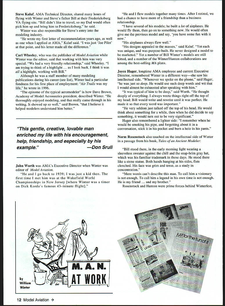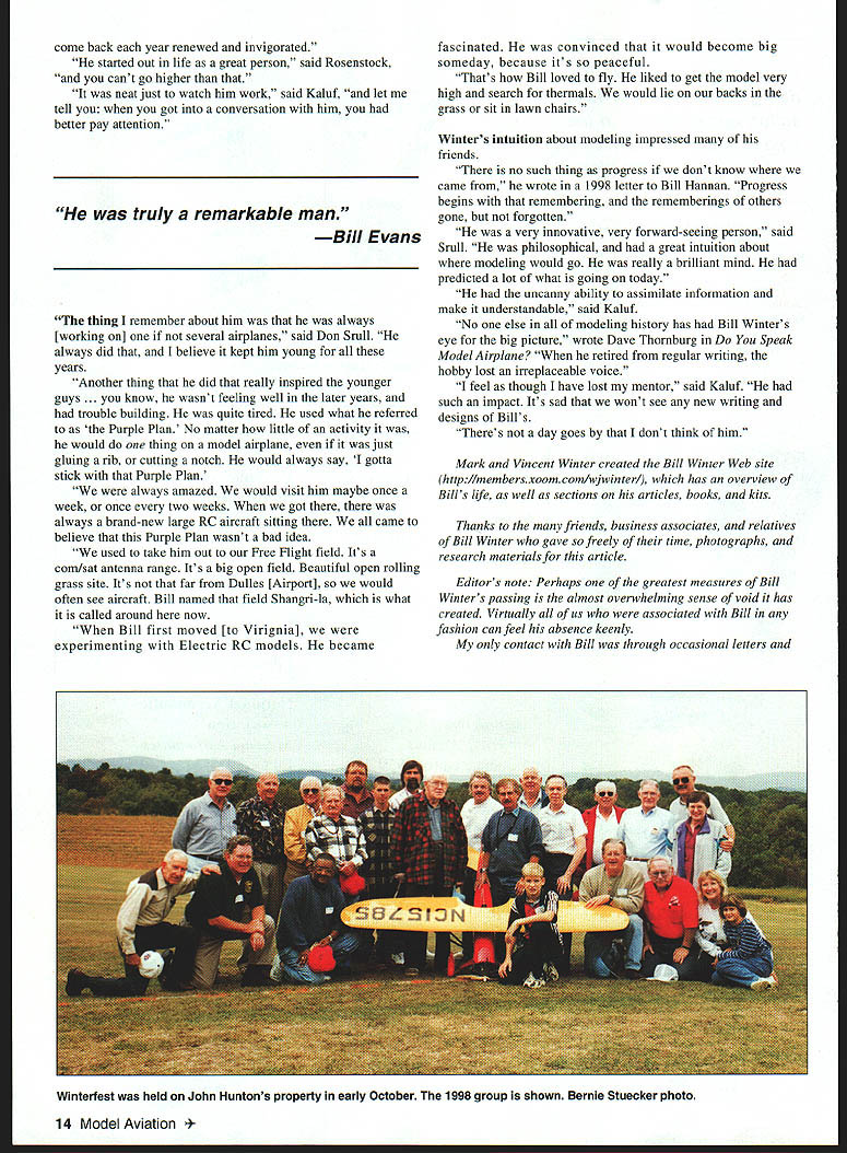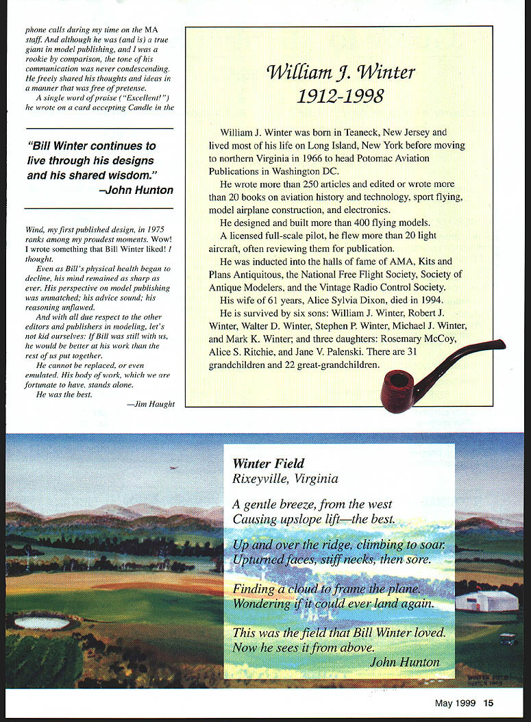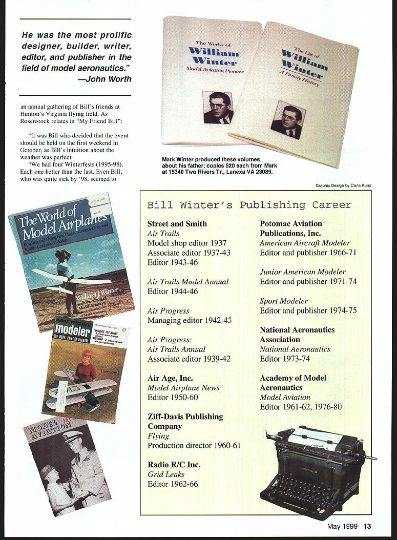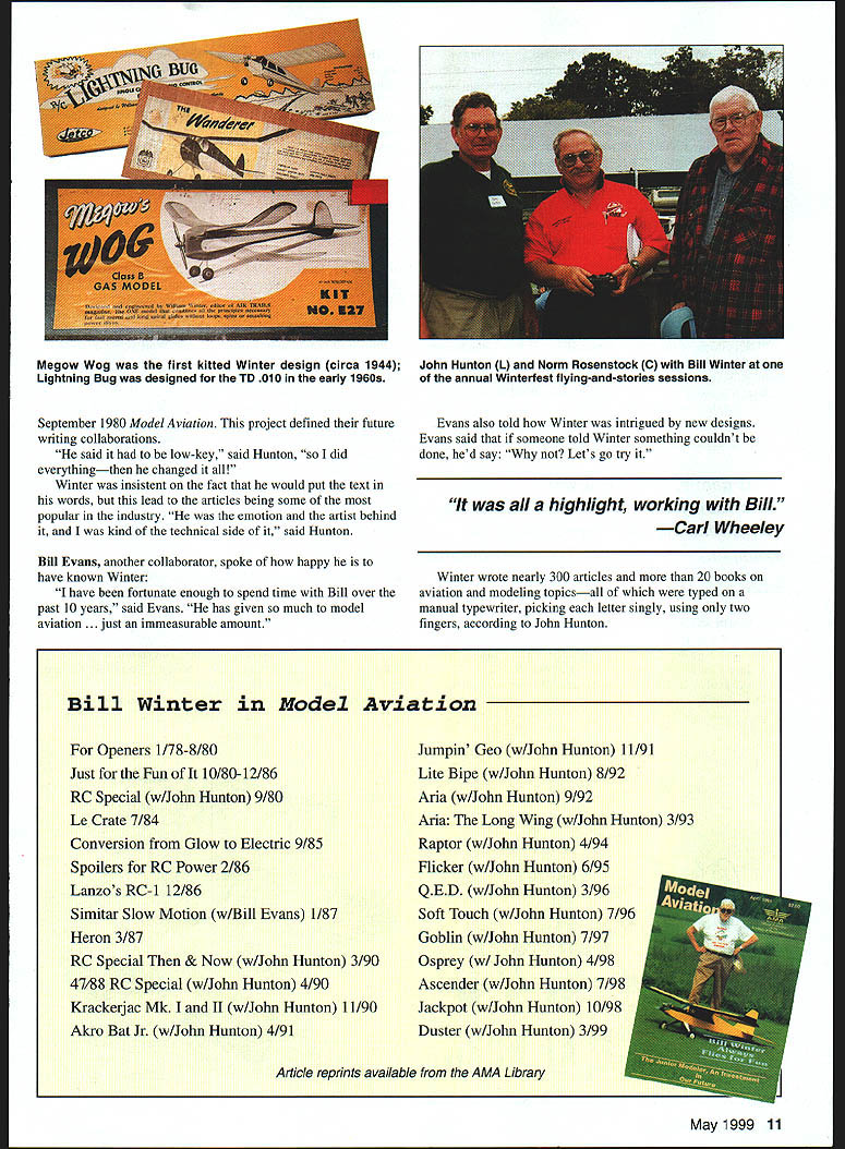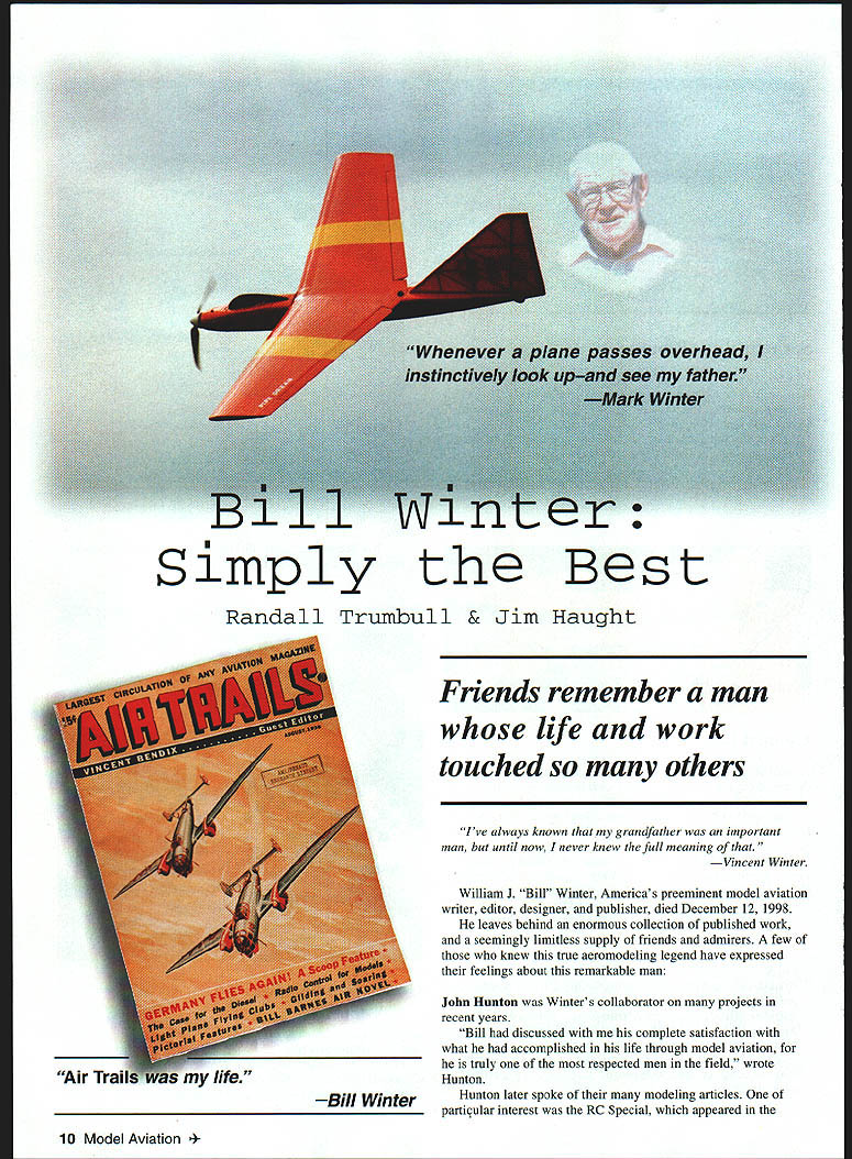 Simply Best Randall Trumbull & Jim Haught Friends remember man life work touched others Ive always known grandfather important man hut until now never knew full meaning Vincent Winter William J Bill Winter Americas preeminent model aviation writer editor designer publisher died December 12 1998 leaves behind enormous collection published work seemingly limitless supply friends admirers few knew true aeromodeling legend have expressed feelings about remarkable man John ilunton Winters collaborator projects recent years Bill discussed complete satisfaction what accomplished life through model aviation truly respected men field wrote Hunton Hunton later spoke modeling articles parthular interest RC Special appeared 10 Model Aviation lJJ L L S Bill Winter September 1980 Model Aviation project defined future writing collaborations said low-key said Hunton did everythingthen changed Winter insistent fact would put text words lead articles being some popular industry emotion artist behind kind technical side said Hunton Bill Evans another collaborator spoke happy have known Winter have fortunate enough spend time Bill over past 10 years said Evans has given much model aviation . just immeasurable amount Evans also told Winter intrigued new designs Evans said someone told Winter something couldnt done hed say Lets go try highlight working Bill Carl Wheeley Winter wrote nearly 300 articles 20 books aviation modeling topicsall typed manual typewriter picking letter singly using two fingers according John Hunton Bill Winter Model Aviation Openers 1/78-8/80 Just Fun 10/80-12/86 RC Special w/John Hunton 9/80 Le Crate 7/84 Conversion Glow Electric 9/85 Spoilers RC Power 2/86 Lanzos RC-1 12/86 Simitar Slow Motion w/Bill Evans 1/87 Heron 3/87 RC Special & Now w/John Hunton 3/90 47/88 RC Special w/John Hunton 4/90 Krackerjac Mk II w/John Hunton 11/90 Akro Bat Jr w/John Hunton 4/91 Jumpin Geo w/John Hunton 11/91 Lite Bipe w/John Hunton 8/92 Aria w/John Hunton 9/92 Aria Long Wing w/John Hunton 3/93 Raptor w/John Hunton 4/94 Flicker w/John Hunton 6/95 QED w/John Hunton 3/96 Soft Touch w/John Hunton 7/96 Goblin w/John Hunton 7/97 Osprey w/ John Hunton 4/98 Ascender w/John Hunton 7/98 Jackpot w/John Hunton 10/98 Duster w/John Hunton 3/99 Article reprints available AMA Library May1999 11 Megow Wag first kitted Winter design circa 1944 John Hunton L Norm Rosenstock C Bill Winter Lightning Bug designed TD 010 early 1960s annual Winterfest flying-and-stories sessions Steve Kaluf AMA Technical Director shared hours flying Winter Steves father Bill Fredericksburg VA flying site Bill didnt like travel Dad would often pick him up bring him Fredericksburg said Winter also responsible Steves entry modeling industry wrote first letter recommendation years ago well applied AMA Kaluf said just Joe Pilot point letter made difference Carl Wheeley publisher Model Aviation Winter editor said working him very special very friendly relationship said Wheeley am trying think highlight . look back think highlight working Bill Although staff member modeling publications during career see list Winter particular fondness first place employment Air Trails life wrote 1996 epitome typical aeromodeler Dave Brown Academy Model Aeronautics president described Winter thoroughly enjoyed modeling really came through writing showed up well said Brown believe helped modelers understand him better gentle creative lovable man enriched life encouragement help friendship especially exampleDon Srull John Worth AMAs Executive Director Winter editor Model Aviation go back 1939 just kid first time met him Wakefield World Championships New Jersey [where Winter timer Dick Kordas famous 43-minute flight] flew models together times After retired chance have friendship business relationship have several models built lot airplanes would fly go something new would often give previous model say have some fun now airplanes always flew well designs appealed masses said Kaluf Yet unique purpose-built never designed model marketed Yet number Bill Winters models still kitted number Winter/Hunton collaborations among best-selling MA plans Joyce Hager longtime AMA employee current Executive Director remembered Winter different wayshe saw intellectual side Whenever spoke phone said Hager just deep would use such deep words wit would almost exhausted after speaking him typical him deep said Worth thought deeply everything always wrote things right off top head Bill would write rewrite until perfect made word important very seldom just talked off top head would think about something did decide say something would turn out very significant Hager also remembered lighter side remember would smoking pipe forgetting about conversation stick pocket burn hole pants Norm Rosenstock also touched intellectual side Winter passage book Tales Ancient Modeler Bill stood early morning light wearing sleeveless sweater against chill snap-brim gray hat familiar trademark days stood like stone statue Both hands hanging sides fists clenched face grim tense study concentration Mere words cant describe man call him visionary enough call him legend own time enough friend . brother Rosenstock Hunton prime forces behind Winterfest Winter AT WORK 12 Model Aviation ific designer builder writer editor publisher field model aeronautics John Worth annual gathering Bills friends Huntons Virginia flying field As Rosenstock relates Friend Bill Bill decided event should held first weekend October Bills intuition about weather perfect four Winterfests 1995-98 better last Bill quite sick 98 seemed fl lvi wu tern Mark Winter produced volumes about father copies $20 Mark 15340 Two Rivers Tr Lanexa VA 23089 Graphic Design Carla Kunz Bill Winters Street Smith Air Trails Model shop editor 1937 Associate editor 1937-43 Editor 1943-46 Air Trails Model Annual Editor 1944-46 Air Progress Managing editor 1942-43 Air Progress Air Trails Annual Associate editor 1939-42 Air Age Inc Model Airplane News Editor 1950-60 Z