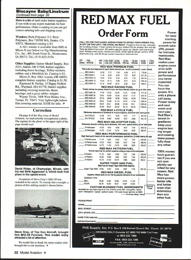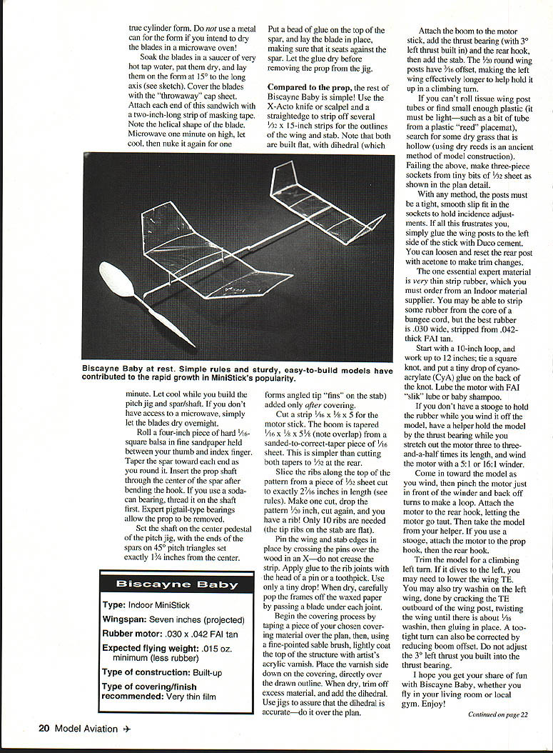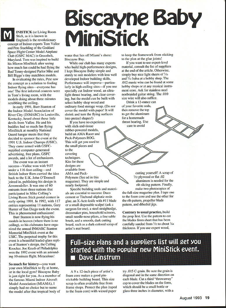 I IMSTICK Living Room Stick known England revolutionary concept Indoor experts Tom Vallee Pete Staehling Goddard Space flight Center Model Airplane Club GSFC MAC Greenbelt Maryland Tom inspired build Micron MiniStick after seeing bow much fun could flying Bud Tenny-designed Parlor Mite Bill Bigges tiny matchbox models evaluating rules Pete saw concept solution finding Indoor flying siteseveryone has first informal contests Toms living room models doing about three minutes scrubbing ceiling early 1991 Burr Stanton Indoor Model Association River City INMARC Louisville Kentucky heard about little devils Vallee buddies much fun flying MiniStick monthly National Guard hangar meets decided sponsor event 1991 US Indoor Champs USIC came armed GSFC supplied computer-generated advertising free plans GSFC awards lot enthusiasm event instant successVallee won 907 under 116-foot ceilingand British Indoor fliers carried idea back UK John ODonnell joined publishing design Aeromodeller 60 entrants three nations participated Mike Collings Living Room Stick postal contest early spring 1991 1992 117 entries representing 11 nations Gary Hunter San Diego took event phenomenal enthusiasm Burr Stanton now flying models heaven no ceiling clubmates have orga nized annual INMARC Stanton Memorial MiniStick event USIC perpetual trophy event beautiful leaded-glass repli ca Stantons design Ceiling Knocker Joe Krush Philadelphia won 1992 event astound ing 10-minute flight Miraculous So much historyyou want own MiniStick fly home local gym Biscayne Baby just right As member famous Miami Indoor Aircraft Model Association MIAMA simply no choice name model after tropical body Bscayne Baby MiniStick water lies off Miamis shore Biscayne Bay club has experts build high-performance designs kept Biscayne Baby simple sturdy suit modelers less well developed Indoor building skills Performance will improveparticu larly high-ceiling sitesif use specially cut Indoor wood ultralight thrust bearing clear cover ing model can built select hobby shop wood ordinary food storage wrap cover model paper will shrink turn flying surfaces pretzel shapes have no experience stick-and-tissue rubber-powered models build AMA Racer Peck-Polymers ROG will get used small pieces covering techniques Kits designs avallable AMA PeckPolymers See ad magazine simple nearly foolproof Specific building tools materi als essential success Duco cement Titebond aliphatic resin glue X-Acto knife #11 blade small disposable scalpel ask surgeon steel stralghtedge dressmaker pins household scissors small needle-nose pliers fine sable brush smooth dark cutting board such dark-colored scrap artists mat board 9 x 12-inch piece artists foam core makes good pin stickable building board size scrap often available free frame shops Protect plan taped foam core waxed paper keep framework sticking plan glue joints want use expert-level material consult list suppliers end article Otherwise simply buy nice light sheets As /32 balsa hobby shop 012 music wire can found some hobby shops musical instru ment store Ask stainless steel nonbraided guitar string 010 size wire will also suffice Drink 12-ounce can favorite soda remove top get aluminum homemade thrust bearing Use care avoid cutting yourself scrap Y32 plywood flat 02 aluminum needed rib slicing pattern Finally make two photocopies full-size magazine plan tape foam core use other rib pattern propeller blade pattern dihedral jigs Contrary usual practice build prop first Use pattern cut blades sheet has carefully sanded 1/32 about /s thickness use expert wood try 015 C-grain sure grain diagonal same direction blade Cut third throwaway cap cover blades form should small bottle glass three inches diameter August1993 19 true cylinder form use metal can form intend dry blades microwave oven Soak blades saucer very hot tap water pat dry lay form 150 long axis see sketch Cover blades throwaway cap sheet Attach end sandwich two-inch-long strip masking tape Note helical shape blade Microwave minute high let cool nuke again minute Let cool build pitch jig spar/shaft dont have access microwave simply let blades dry overnight Roll four-inch piece hard 1A6square balsa fine sandpaper held between thumb index finger Taper spar toward end round Insert prop shaft through center spar after bending hook use sodacan bearing thread shaft first Expert pigtail-type bearings allow prop removed Set shaft center pedestal pitch jig ends spars 450 pitch triangles set exactly l/4 inches center Put bead glue top spar lay blade place making sure seats against spar Let glue dry before removing prop jig Compared prop rest Biscayne Baby simple Use X-Acto knife scalpel straightedge strip off several 2 x 15-inch strips outlines wing stab Note both built flat dihedral forms angled tip fins stab added after covering Cut strip A6 x x 5 motor stick boom tapered As x x 5 1/ note overlap sanded-to-correct-taper piece A6 sheet simpler cutting both tapers A2 rear Slice ribs along top pattern piece 1A2 sheet cut exactly 27/is inches length see rules Make cut drop pattern %o inch cut again have rib Only 10 ribs needed tip ribs stab flat Pin wing stab edges place crossing pins over wood Xdo crease strip Apply glue rib joints bead pin toothpick Use tiny drop dry carefully pop frames off waxed paper passing blade under joint Begin covering process taping piece chosen cover ing material over plan using fine-pointed sable brush lightly coat top structure artists acrylic varnish Place varnish side down covering directly over drawn outline dry trim off excess material add dihedral Use jigs assure dihedral accuratedo over plan Attach boom motor stick add thrust bearing 30 left thrust built rear hook add stab 1/20 round wing posts have /i offset making left wing effectively longer help hold up climbing turn cant roll tissue wing post tubes find small enough plastic must lightsuch bit tube plastic reed placemat search some dry grass hollow using dry reeds ancient method model constru