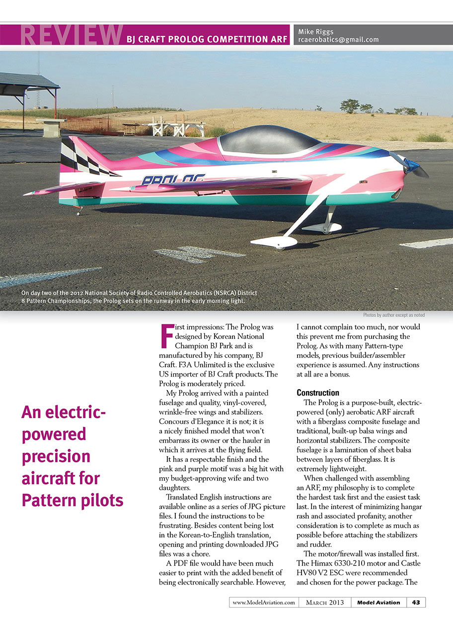 First impressions: The Prolog was designed by Korean National Champion BJ Park and is manufactured by his company: BJ Craft. F3A Unlimited is the exclusive US importer of BJ Craft products. The Prolog is priced between BJ Craft’s glow/electric Monolog and FAI-optimized Nuance offerings.