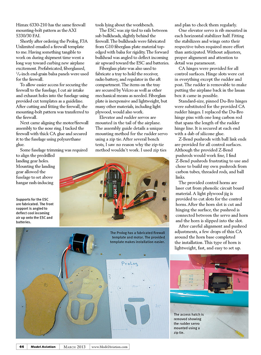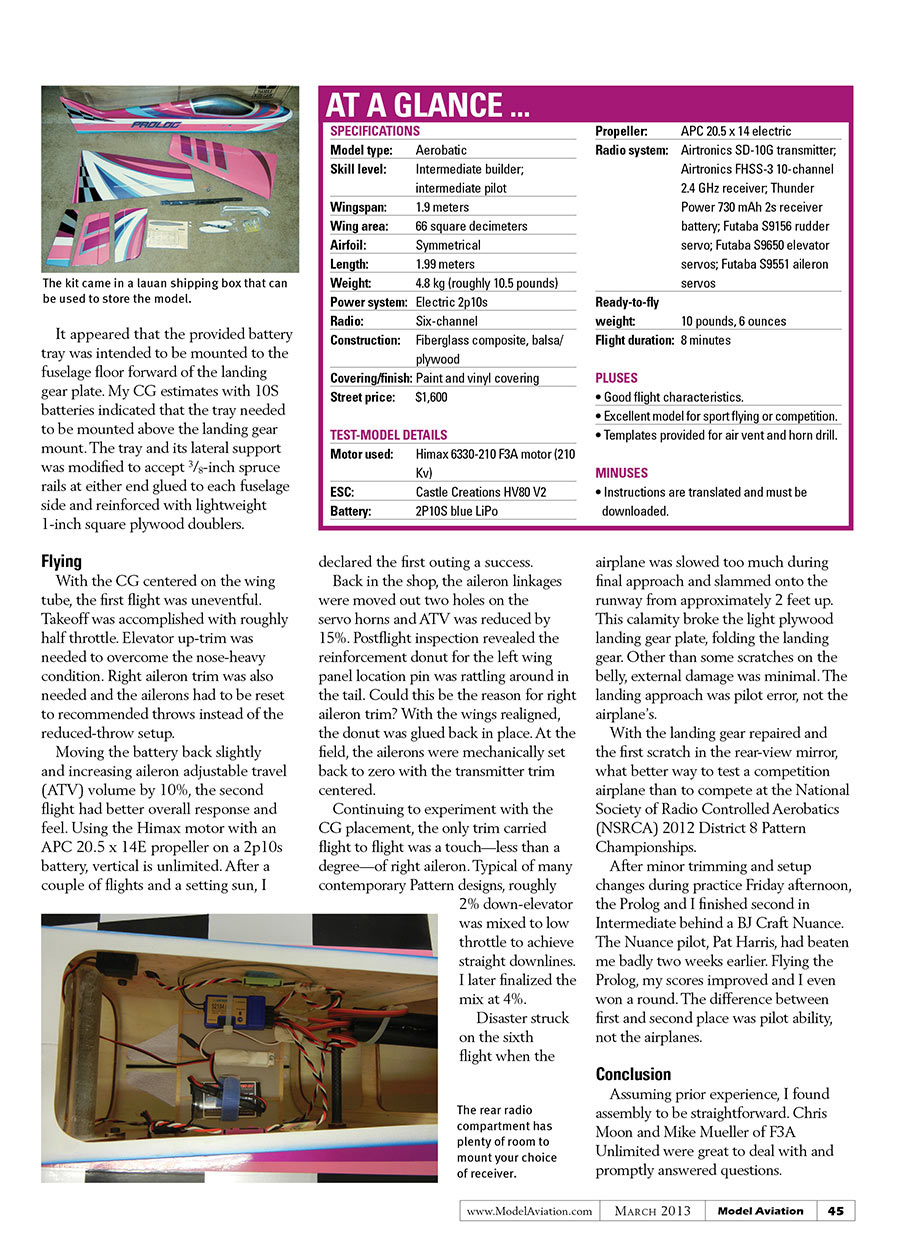 The Prolog is a purpose-built, electric-powered (only) aerobatic ARF aircraft with a fiberglass composite fuselage and traditional, built-up balsa wings and horizontal stabilizers. The composite fuselage is a lamination of sheet balsa between layers of fiberglass. It is extremely lightweight.