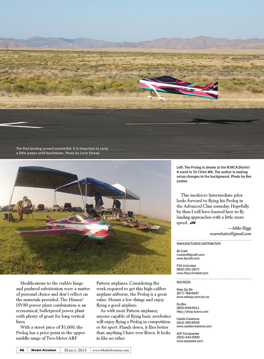As with most Pattern airplanes, anybody capable of flying basic aerobatics will enjoy flying a Prolog in competition or just for sport. Hands down, it flies better than anything I have ever flown. It locks in like no other.