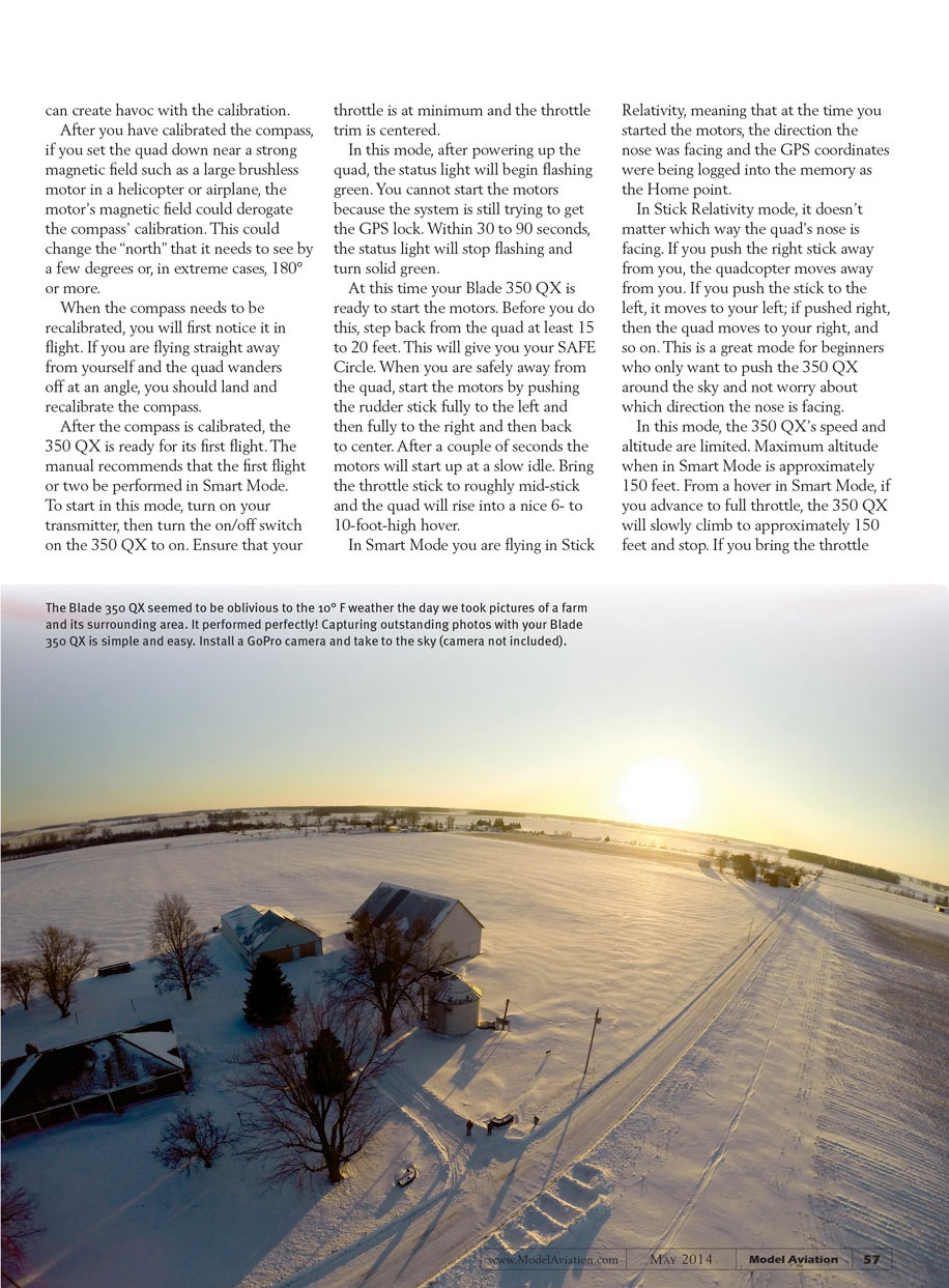 Although it has been cold the past month, I have enjoyed getting out and flying the Blade 350 QX and would certainly recommend it to my non-RC pilot friends who are interesting in learning how to fly a multirotor aircraft. In Smart Mode it is unbelievably docile and easy to fly, but to the experienced pilot flying it in Agility Mode, it becomes a little rocket ship!