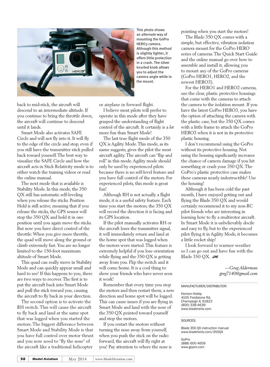 With the current popularity of multirotor aircraft, I am not going to go over the basics of flying one. Instead, I will cover the more specific flight mode features of the Blade 350 QX, such as Smart Mode, Stability Mode, and Agility Mode. The Blade 350 QX also has a Return Home function that can be manually initiated or, upon loss of transmitter signal, automatically initiated.
