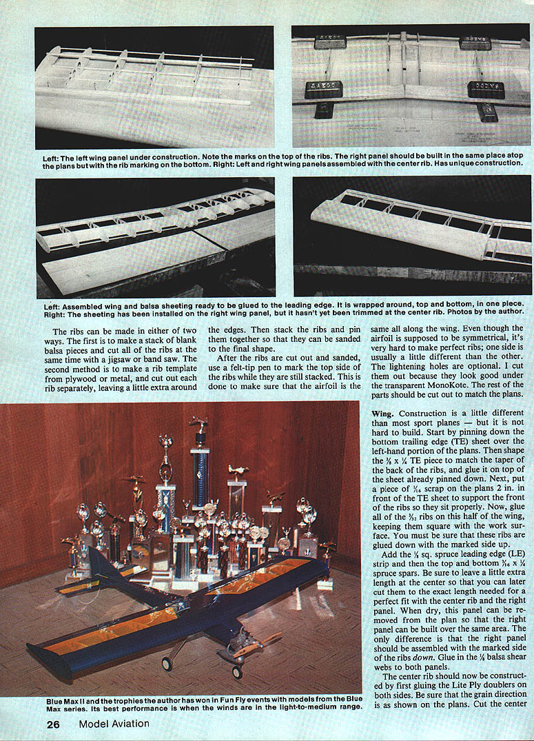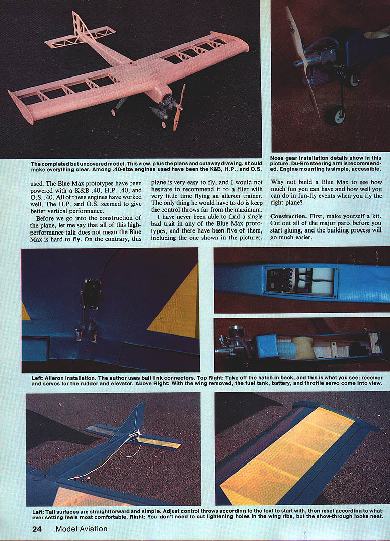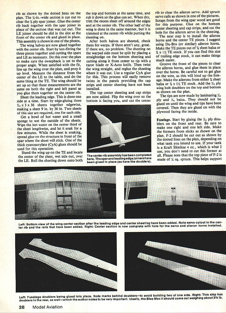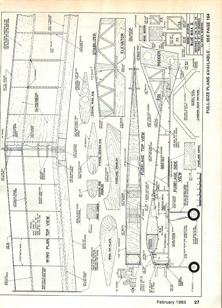 NO OCR TEXT NO OCR TEXT completed uncovered model Thisylew plus plansand cutawaydrawing should make everything cleat Among 40-size engines used have K&B HP 05 Nose gear installation deta picture DuBrosteering arm us ed Engine mounting simple used Blue Max prototypes have powered K&B 40 HP 40 OS 40 engines have worked well HP OS seemed give better vertical performance Before go construction plane let say highperformance talk does mean Blue Max hard fly contrary plane very easy fly would hesitate recommend flier very little time flying aileron trainer thing would have keep control throws far maximum have never able find single bad trait Blue Max proto types have five including shown pictures 24Model Aviation build Blue Max much fun can have h can fun-fly events right plane Construction First make yoi Cut out major parts start gluing building pro go much easier Left Aileron installation author uses ball link connectors Top Right Take off hatch back what servos rudder elevator Above Right wing removed fuel tank battery throttle Left Tail surfaces stralgnuorwara simple Adjust control throws according text start wnn tnei ever setting feels comfortable Right dont need cut lightening holes wing ribs WN N FiT -CIIP OFF N T14E AV/k-I S WUT FAWCVS IM 51 - -WAZELS 4TI- CUB -CHUCI OFF IN CHINA! -ME-IMIN sI-IW III / FLY 1/16 CAP STRIPS OPND BOTTOM 6 I/32LITE PLY DCIJBLER UPTO NOSE REIN F jLOCK SERVO ROD TO NOSE WHEEL 7I/4XI/2LEFIN T E POST AND FIN MOUNT 1/4 SHEET TAPERED RUDDER 3/16 X 1/4 SPRUCE LE AND SPAR I/32LITE PLY AFT DOUBLER 3/16 SPRUCE ELEV JOINER 3/16 SHEET ELEVATcRS 1/4 SHEET VENTRAL WITH I/16SKID I/B SHEEr BALSA SIDES I/4 FRAMES 1/8 SHEET BALSA lOP/BOTTOM CRCSGRAIN I/B LITE-PLY SPAR _____________ REINFORCING C/S ONLY I/B LITE PLY RIB REINF OVER 1/4 DOWEL HOLD DOWNN 1/4 DOWEL INTO I/B PLYWDOD BLOCK I/BBALSA HATCH TRIANGLE STOCK 1/4 PLY FIREWALL KM 40 MOUNT DU BRO STEER ARM 2 WHEEL ON 3/16 3/16 STEERABLE NOSE GEAR 7 / / / 2 I/2WHEELS ON DUBRO /AXLES 1/16 PLYWOOD10 32 LE JOINERNYLON BOLTS SIG SKYBOLT L GEAR ON I/8FLY MOUNT THRU V2SOSPRUCE I/16LITE SHEET ALLLEAND CS 3/16 X 1/4 SPRUCE SPARS 7 I/8LITEpLY HAICH IIA I/B SHEET WEBS 1/850 SPRUCE L E 1/32 PLYDO FUSELA3E DOUBLER I/16x TE SHEET TOP AND BOTTOM 1/4 X 3/8 AILERON SPAR 3/8x 11/2 AILERO~J 7 7 1/32 PLY TIP PLATES 3/32Th1B5 ALL SAME SHAPE Left left wing panel under construction Note marks top ribs right panel should built same place atop plans rib marking bottom Right Left rightwlng panels assembled center rib Has unique construction Left Assembled wing balsa sheeting ready glued leading edge wrapped around top bottom piece Right sheeting has installed right wing panel hasnt yet trimmed center rib Photos author ribs can made either two ways first make stack blank balsa pieces cut ribs same time jigsaw band saw second method make rib template plywood metal cut out rib separately leaving little extra around edges stack ribs pin together can sanded final shape After ribs cut out sanded use felt-tip pen mark top side ribs still stacked done make sure airfoil same along wing though airfoil supposed symmetrical its very hard make perfect ribs side usually little different other lightening holes optional cut out because look good under transparent MonoKote rest parts should cut out match plans Wing Construction little different sport planes build Start pinning down bottom trailing edge TE sheet over left-hand portion plans shape 3/ x / TE piece match taper back ribs glue top sheet already pinned down Next put piece /16 scrap plans 2 in front TE sheet support front ribs sit properly Now glue %2 ribs half wing keeping square work sur face must sure ribs glued down marked side up Add sq spruce leading edge LE strip top bottom Y16 x / spruce spars sure leave little extra length center can later cut exact length needed perfect fit center rib right panel dry panel can re moved plan right panel can built over same area difference right panel should assembled marked side ribs down Glue balsa shear webs both panels center rib should now construct ed first gluing Lite Ply doublers both sides sure grain direction shown plans Cut center 26Model Aviation XII ietropfliestfle aL rna I-un ny VUI1I5 wiui EIIUUUUO IJfl Max series its best performance winds light-to-medluim 1/8 LITE PLY1/4 DOWEL1/8 SO SPRUCELEADING EDGE SHEETING IS ONE -I/IS LIGHT BALSACG RANGE 3/3D BALSA EDGE DREETING _______________OPTIONALI/IR 3/B BALSA CAPSYRIPS I/4 3/B BALSABALSA AILERON1/4 BALSA TRAILING EDGE 1/83/18 ALGA TIP PLATES LAMINATEDPLYWOOD2ITYPICAL WING RIB FROM I/3D PLYWLOD AND 1/16 BALSA-PLY TOWARDS THE INSIDESPAR JOINER ENTER RIBTYPICAL CENTER RIBI/43/IB DWBLERSPRUCE 1/32 PLYWOOD DOUBLERS WING TIP PLATE7 FUSELAGE OUBLER 3/IRI/4ELEVATOR 1/4 BALSA SHEET 1/4 BALSA________________ I/O TRI S OUTLINE OF STOCKFUSELAGE SIDES SIDE NOT SHOWN FIN INCIDENCE1/B BALSA SHEETFOR CLARITY OR OS-SI OSITIVESIDES TOPABOTTOM [v32][b-1-10-1-10]]ItBEVEL V/i 7XIIl/Al ON RAFTL/-1Il//Il DL 4 TANK- - 1/32 PLYI IyyAIl//Il RECEIVER -DOUBLERR(JDDR CO RANGEI/O TRI-STOCI LEVATOR AND RUDDER rII lii F4 THROTTLE ERVO AREAISPRUCE -2BATTERY AREAAREA O CIS M-40IF-IEND OFDOUBLER __CU MOUNTI/DSG SPRUCE WITH I/BPLYWOODSIDETOP AND BOTTOM _F2 TAPPED HOLES GEAR MOUNT FUSELAGESHEETING IS CROSS-- STEERINGVIEW ARM 4S35S0 0/IS NOSE GEAR FON COMPlUSE 010 SKYBOLT GEARDESIRES SHAPE OF SKYBOLTMA GABA GA SPORT F LY INS CON SIMILAR MOUNTED 5/52 IWITH 10-32 NYLON BOLTS MODEL AV ATION I/B LITE PLYSKYBOLT GEAR 2 WHEEL j 2-1/4 WHEELS ONORIGINAL SHAPE BANNER OR OD-BROIIDES GNED BY 3 M ALLEN JR AXLES0 2 ELAGE HATCH LANDING GEAR PATTERNRAC NG BY JOE DEMARCO 5____________________________ BKTS RESERVED FULL-SIZE PLANS AVAILABLESEE PAGE 164 rib shown dotted lines plan A-in-wide section cut out clear / ply spar joiner Glue center rib back together spar joiner place section cut out LE joiner should slid slot front center rib glued place assembly shown photos wing halves now glued together center rib Start test-fitting three pieces together cutting s