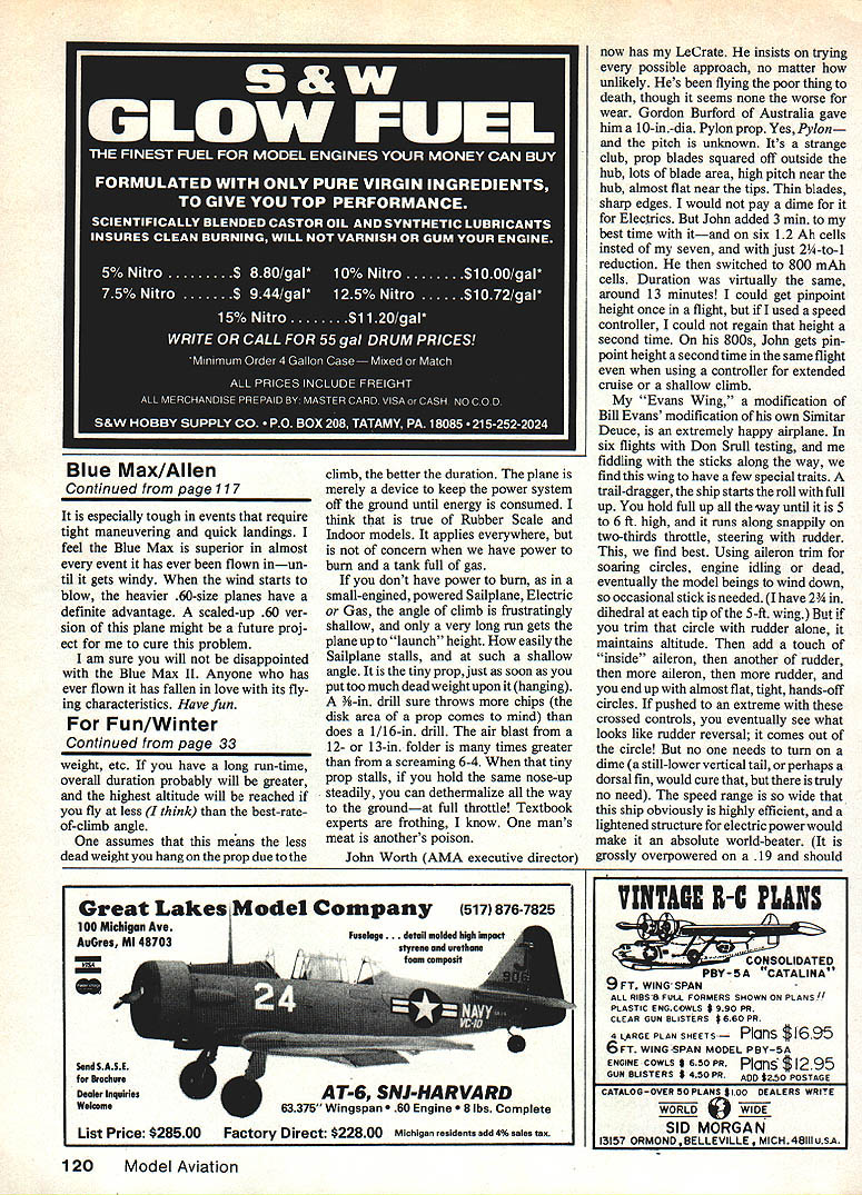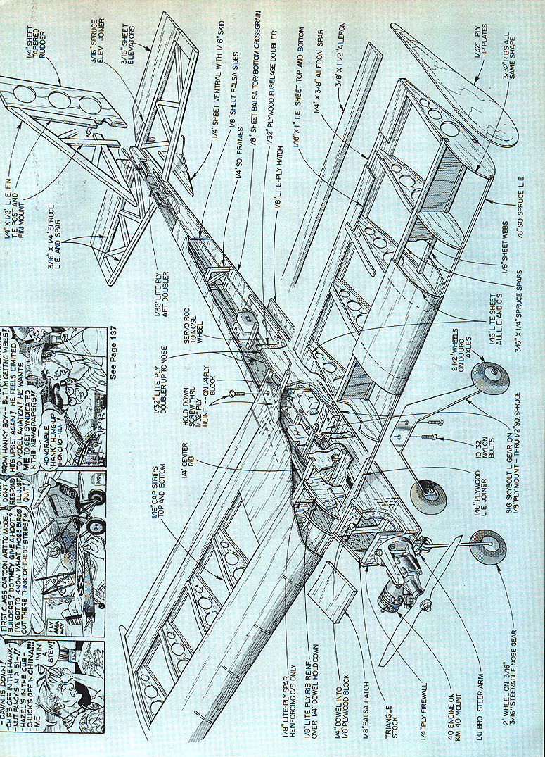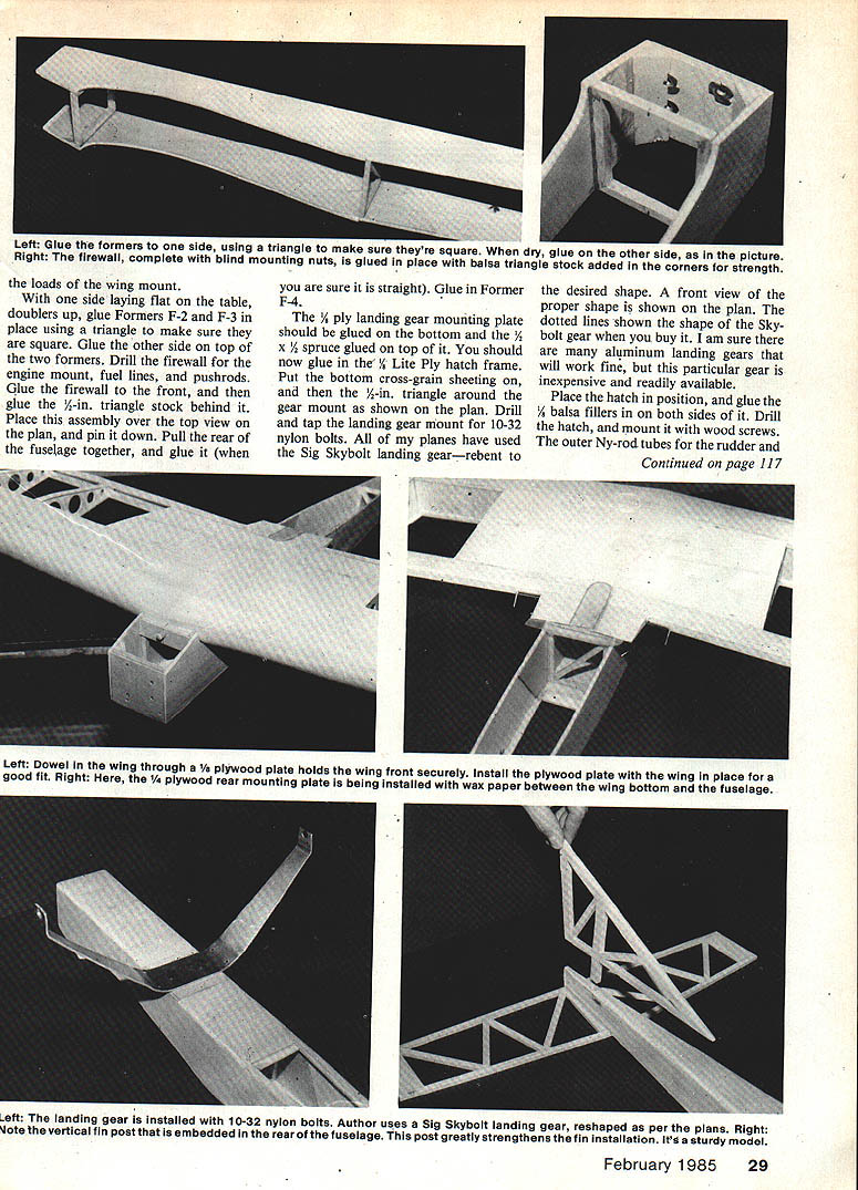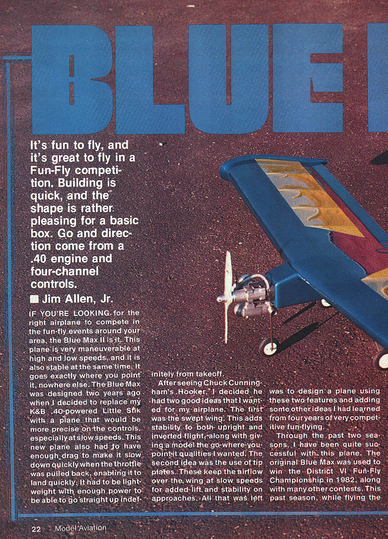 NO OCR TEXT NO OCR TEXT completed uncovered model Thisylew plus plansand cutawaydrawing should make everything cleat Among 40-size engines used have K&B HP 05 Nose gear installation deta picture DuBrosteering arm us ed Engine mounting simple used Blue Max prototypes have powered K&B 40 HP 40 OS 40 engines have worked well HP OS seemed give better vertical performance Before go construction plane let say highperformance talk does mean Blue Max hard fly contrary plane very easy fly would hesitate recommend flier very little time flying aileron trainer thing would have keep control throws far maximum have never able find single bad trait Blue Max proto types have five including shown pictures 24Model Aviation build Blue Max much fun can have h can fun-fly events right plane Construction First make yoi Cut out major parts start gluing building pro go much easier Left Aileron installation author uses ball link connectors Top Right Take off hatch back what servos rudder elevator Above Right wing removed fuel tank battery throttle Left Tail surfaces stralgnuorwara simple Adjust control throws according text start wnn tnei ever setting feels comfortable Right dont need cut lightening holes wing ribs WN N FiT -CIIP OFF N T14E AV/k-I S WUT FAWCVS IM 51 - -WAZELS 4TI- CUB -CHUCI OFF IN CHINA! -ME-IMIN sI-IW III / FLY 1/16 CAP STRIPS OPND BOTTOM 6 I/32LITE PLY DCIJBLER UPTO NOSE REIN F jLOCK SERVO ROD TO NOSE WHEEL 7I/4XI/2LEFIN T E POST AND FIN MOUNT 1/4 SHEET TAPERED RUDDER 3/16 X 1/4 SPRUCE LE AND SPAR I/32LITE PLY AFT DOUBLER 3/16 SPRUCE ELEV JOINER 3/16 SHEET ELEVATcRS 1/4 SHEET VENTRAL WITH I/16SKID I/B SHEEr BALSA SIDES I/4 FRAMES 1/8 SHEET BALSA lOP/BOTTOM CRCSGRAIN I/B LITE-PLY SPAR _____________ REINFORCING C/S ONLY I/B LITE PLY RIB REINF OVER 1/4 DOWEL HOLD DOWNN 1/4 DOWEL INTO I/B PLYWDOD BLOCK I/BBALSA HATCH TRIANGLE STOCK 1/4 PLY FIREWALL KM 40 MOUNT DU BRO STEER ARM 2 WHEEL ON 3/16 3/16 STEERABLE NOSE GEAR 7 / / / 2 I/2WHEELS ON DUBRO /AXLES 1/16 PLYWOOD10 32 LE JOINERNYLON BOLTS SIG SKYBOLT L GEAR ON I/8FLY MOUNT THRU V2SOSPRUCE I/16LITE SHEET ALLLEAND CS 3/16 X 1/4 SPRUCE SPARS 7 I/8LITEpLY HAICH IIA I/B SHEET WEBS 1/850 SPRUCE L E 1/32 PLYDO FUSELA3E DOUBLER I/16x TE SHEET TOP AND BOTTOM 1/4 X 3/8 AILERON SPAR 3/8x 11/2 AILERO~J 7 7 1/32 PLY TIP PLATES 3/32Th1B5 ALL SAME SHAPE Left left wing panel under construction Note marks top ribs right panel should built same place atop plans rib marking bottom Right Left rightwlng panels assembled center rib Has unique construction Left Assembled wing balsa sheeting ready glued leading edge wrapped around top bottom piece Right sheeting has installed right wing panel hasnt yet trimmed center rib Photos author ribs can made either two ways first make stack blank balsa pieces cut ribs same time jigsaw band saw second method make rib template plywood metal cut out rib separately leaving little extra around edges stack ribs pin together can sanded final shape After ribs cut out sanded use felt-tip pen mark top side ribs still stacked done make sure airfoil same along wing though airfoil supposed symmetrical its very hard make perfect ribs side usually little different other lightening holes optional cut out because look good under transparent MonoKote rest parts should cut out match plans Wing Construction little different sport planes build Start pinning down bottom trailing edge TE sheet over left-hand portion plans shape 3/ x / TE piece match taper back ribs glue top sheet already pinned down Next put piece /16 scrap plans 2 in front TE sheet support front ribs sit properly Now glue %2 ribs half wing keeping square work sur face must sure ribs glued down marked side up Add sq spruce leading edge LE strip top bottom Y16 x / spruce spars sure leave little extra length center can later cut exact length needed perfect fit center rib right panel dry panel can re moved plan right panel can built over same area difference right panel should assembled marked side ribs down Glue balsa shear webs both panels center rib should now construct ed first gluing Lite Ply doublers both sides sure grain direction shown plans Cut center 26Model Aviation XII ietropfliestfle aL rna I-un ny VUI1I5 wiui EIIUUUUO IJfl Max series its best performance winds light-to-medluim 1/8 LITE PLY1/4 DOWEL1/8 SO SPRUCELEADING EDGE SHEETING IS ONE -I/IS LIGHT BALSACG RANGE 3/3D BALSA EDGE DREETING _______________OPTIONALI/IR 3/B BALSA CAPSYRIPS I/4 3/B BALSABALSA AILERON1/4 BALSA TRAILING EDGE 1/83/18 ALGA TIP PLATES LAMINATEDPLYWOOD2ITYPICAL WING RIB FROM I/3D PLYWLOD AND 1/16 BALSA-PLY TOWARDS THE INSIDESPAR JOINER ENTER RIBTYPICAL CENTER RIBI/43/IB DWBLERSPRUCE 1/32 PLYWOOD DOUBLERS WING TIP PLATE7 FUSELAGE OUBLER 3/IRI/4ELEVATOR 1/4 BALSA SHEET 1/4 BALSA________________ I/O TRI S OUTLINE OF STOCKFUSELAGE SIDES SIDE NOT SHOWN FIN INCIDENCE1/B BALSA SHEETFOR CLARITY OR OS-SI OSITIVESIDES TOPABOTTOM [v32][b-1-10-1-10]]ItBEVEL V/i 7XIIl/Al ON RAFTL/-1Il//Il DL 4 TANK- - 1/32 PLYI IyyAIl//Il RECEIVER -DOUBLERR(JDDR CO RANGEI/O TRI-STOCI LEVATOR AND RUDDER rII lii F4 THROTTLE ERVO AREAISPRUCE -2BATTERY AREAAREA O CIS M-40IF-IEND OFDOUBLER __CU MOUNTI/DSG SPRUCE WITH I/BPLYWOODSIDETOP AND BOTTOM _F2 TAPPED HOLES GEAR MOUNT FUSELAGESHEETING IS CROSS-- STEERINGVIEW ARM 4S35S0 0/IS NOSE GEAR FON COMPlUSE 010 SKYBOLT GEARDESIRES SHAPE OF SKYBOLTMA GABA GA SPORT F LY INS CON SIMILAR MOUNTED 5/52 IWITH 10-32 NYLON BOLTS MODEL AV ATION I/B LITE PLYSKYBOLT GEAR 2 WHEEL j 2-1/4 WHEELS ONORIGINAL SHAPE BANNER OR OD-BROIIDES GNED BY 3 M ALLEN JR AXLES0 2 ELAGE HATCH LANDING GEAR PATTERNRAC NG BY JOE DEMARCO 5____________________________ BKTS RESERVED FULL-SIZE PLANS AVAILABLESEE PAGE 164 rib shown dotted lines plan A-in-wide section cut out clear / ply spar joiner Glue center rib back together spar joiner place section cut out LE joiner should slid slot front center rib glued place assembly shown photos wing halves now glued together center rib Start test-fitting three pieces together cutting s