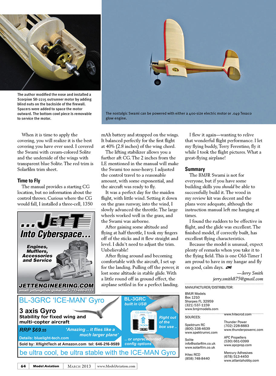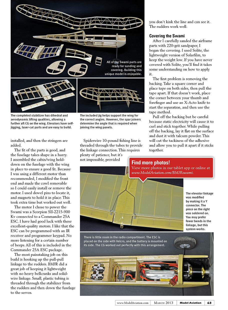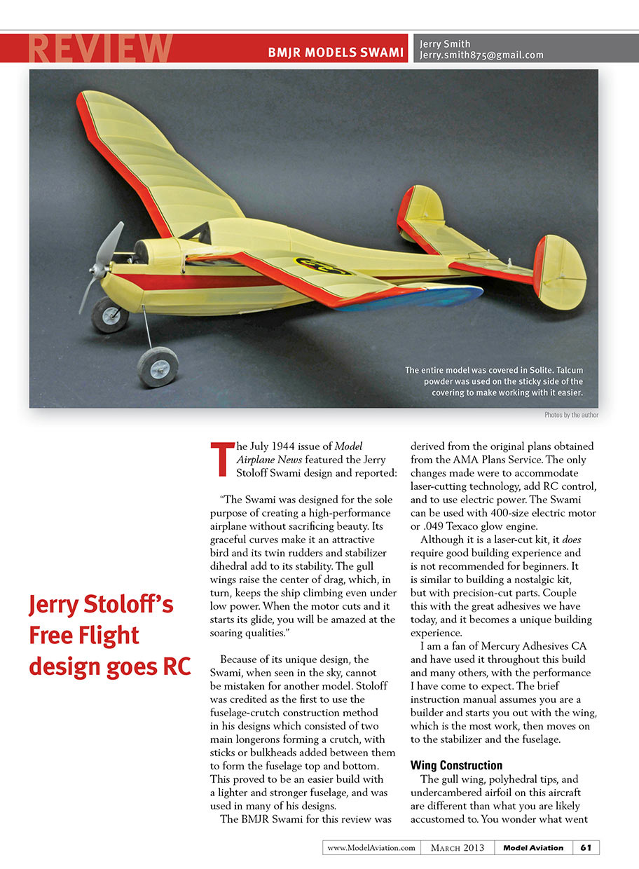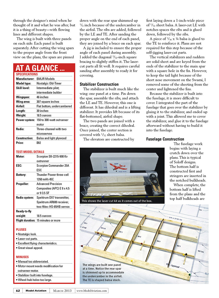 The BMJR Swami, in this review, was derived from the original plan obtained from the AMA Plans Service. The only changes were to accommodate laser cutting technology, adding RC control, and for the use of electric power. The Swami can be used with 400-sized electric motor or .049 Texaco glow engine.