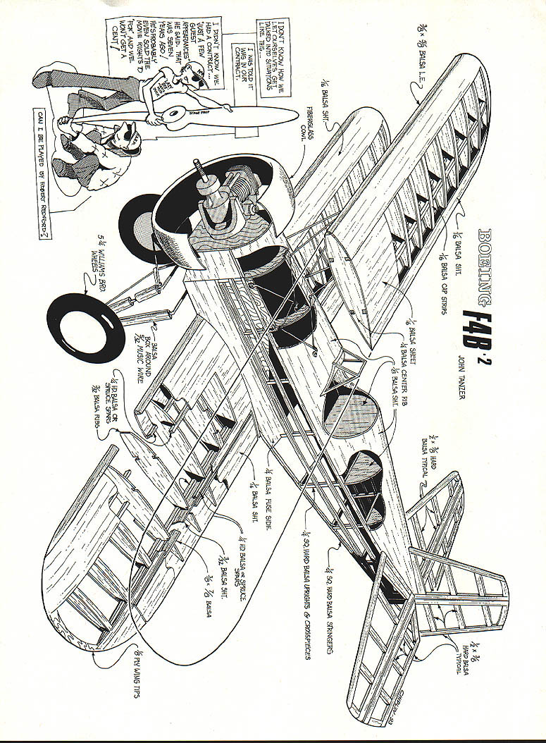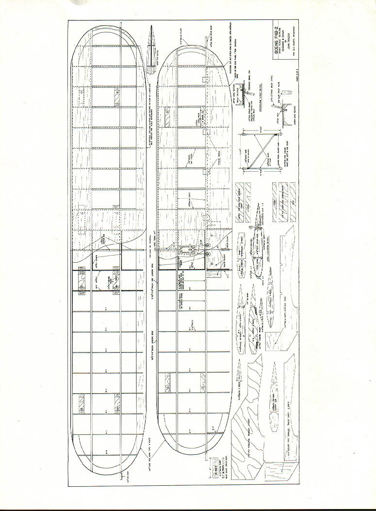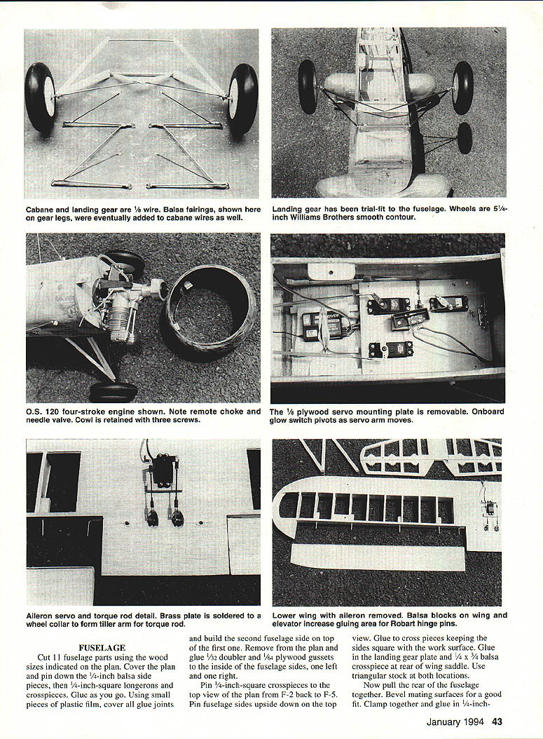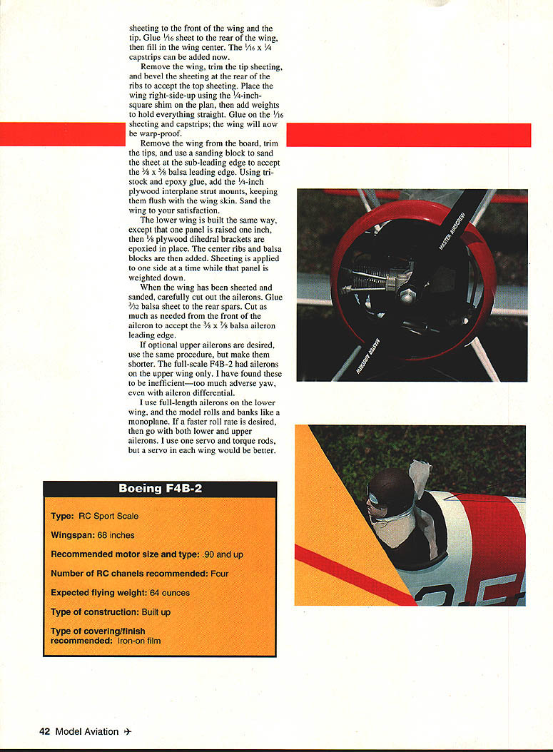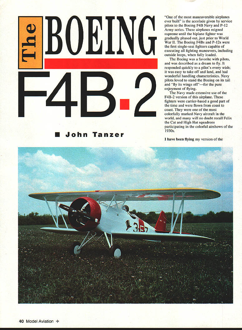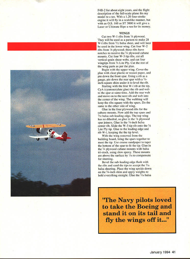BOEING FzIP U John Tanzer maneuverable airplanes ever built accolade given service pilots Boeing F4B Navy P-12 Army series airplanes reigned supreme until biplane fighter gradually phased out just prior World War II Boeing F4Bs P-12s first single-seat fighters capable executing fighting maneuvers including outside loops fully loaded Boeing favorite pilots described dream fly responded quickly pilots wish easy take off land wonderful handling characteristics Navy pilots loved stand Boeing its tail fly its wings offfor pure enjoyment flying Navy made extensive use F4B-2 version airplane fighters carrier-based good part time flown coast coast colorfully marked Navy aircraft world will no doubt recall Felix Cat High Hat squadrons participating colorful airshows 1930s have flying version 40 Model Aviation 2 about eight years flight description full-scale plane fits model tee 120 four-stroke engine will fly scalelike manner 05 160 ST 3000 will give Laser Ultimate Bipe run its money WINGS Cut two W-1 ribs /s plywood will used pattern make 28 W-l ribs 3h2 balsa sheet will later used lower wing Cut four W-2 ribs /s plywood ribs have notches receive ood cabane mounts Cut four W-3 tip ribs cut vertical-grain shear webs cut four wingtips t/ Lite Ply Cut rest wing parts per plan Begin upper wing Cover plan clear plastic waxed paper pin down front spar Using rib gauge pin down rear spar inch-square shim under level rib Starting first W-l rib tip CyA cyanoacrylate glue rib web spar same time Add rear web move next rib web center wing webbing will keep ribs square spars same other side wing Glue four plywood ribs cabane mounts Now add top spars 3A2 balsa sub-leading edge top wing has no dihedral glue 1/g plywood spar joiners Glue -inch balsa center rib Slide W-3 tip rib onto 1/ Lite Ply tip Glue leading edge rib W-l keeping the tip level wing removed building board bring spars together meet tip Use coarse sandpaper taper bottom spar fit tip Glue ood cabane mounts balsa tn-stock using slow epoxy mounts above surface 146 compensate sheeting Bevel sub-leading edge flush ribs sand tips accept A6 balsa sheeting Place wing upside down -inch shim apply weights hold everything straight Glue /16 balsa January1994 41 sheeting front wing tip Glue /16 sheet rear wing fill wing center 1A6 x capstrips can added now Remove wing trim tip sheeting bevel sheeting rear ribs accept top sheeting Place wing right-side-up using -inchsquare shim plan add weights hold everything straight Glue /16 sheeting capstrips wing will now warp-proof Remove wing board trim tips use sanding block sand sheet sub-leading edge accept 3/ X /8 balsa leading edge Using tri stock epoxy glue add -inch plywood interplane strut mounts keeping flush wing skin Sand wing satisfaction lower wing built same way except panel raised inch /s plywood dihedral brackets epoxied place center ribs balsa blocks added Sheeting applied side time panel weighted down wing has sheeted sanded carefully cut out ailerons Glue /32 balsa sheet rear spars Cut much needed front aileron accept 3/ x /8 balsa aileron leading edge optional upper ailerons desired use same procedure make shorter full-scale F4B-2 ailerons upper wing have found inefficienttoo much adverse yaw aileron differential use full-length ailerons lower wing model rolls banks like monoplane faster roll rate desired go both lower upper ailerons use servo torque rods servo wing would better 42 Model Aviation LAGE Cut 11 fuselage parts using wood sizes indicated plan Cover plan pin down -inch balsa side pieces -inch-square longerons crosspieces Glue go Using small pieces plastic film cover glue joints build second fuselage side top first Remove plan glue 1/32 doubler 1/64 plywood gussets inside fuselage sides left right Pin -inch-square crosspieces top view plan F-2 back F-5 Pin fuselage sides upside down top view Glue cross pieces keeping sides square work surface Glue landing gear plate balsa crosspiece rear wing saddle Use triangular stock both locations Now pull rear fuselage together Bevel mating surfaces good fit Clamp together glue -inchJanuary 1994 43 Cabane landing gear 1k wire Balsa fairings shown gear legs eventually added cabane wires well Landing gear has trial-fit fuselage Wheels 5inch Williams Brothers smooth contour OS 120 four-stroke engine shown Note remote choke 1/8 plywood servo mounting plate removable Onboard needle valve Cowl retained three screws glow switch pivots servo arm moves Aileron servo torque rod detail Brass plate soldered Lower wing aileron removed Balsa blocks wing wheel collar form tiller arm torque rod elevator increase gluing area Robart hinge pins square crosspieces rear keeping rear fuselage square work surface Glue -inch plywood tailwheel plate Glue /s plywood wing dowel plate wing bolt plates fuselage still flat bench lay lower wing saddle Align perfectly drill front wing accept -inch dowel Take wing off glue dowel Now return wing fuselage drill two mounting holes tap hold-down plates 20 bolts Remove wing fuselage put aside now Remove fuselage plan Glue firewall formers proper locations Glue -inch balsa fuselage outside doublers -inchsquare stringers Fair stringers rear fuselage Using tn-stock epoxy -inch ply cabane mounts ply cabane brace bolt plate top fuselage Glue a sheet cockpit floor sheet top fuselage lower front nose Fair sides nose wing saddle Glue two balsa blocks former F-8 using 3/ balsa spacer form slot fin Spot-glue spacer rear stab slot Note 3/n shim under front stab 11/20 positive incidence Plane sand block shape remove 3/ spacer rear tail can now built using 3/ X hard balsa some a sheet parts Round off edges cut hinge slots c wire elevator joiner can used Y pushrod two pushrods two servos Trial-fit stab fin fuselage slots did glue tail until fuselage tail covered finished make /s music wire cabane cut four pieces c wire five inches long Using piece plywood jig mark solder lug locations screw down hold alignment soldering Bend diagonal brace wrap copper 