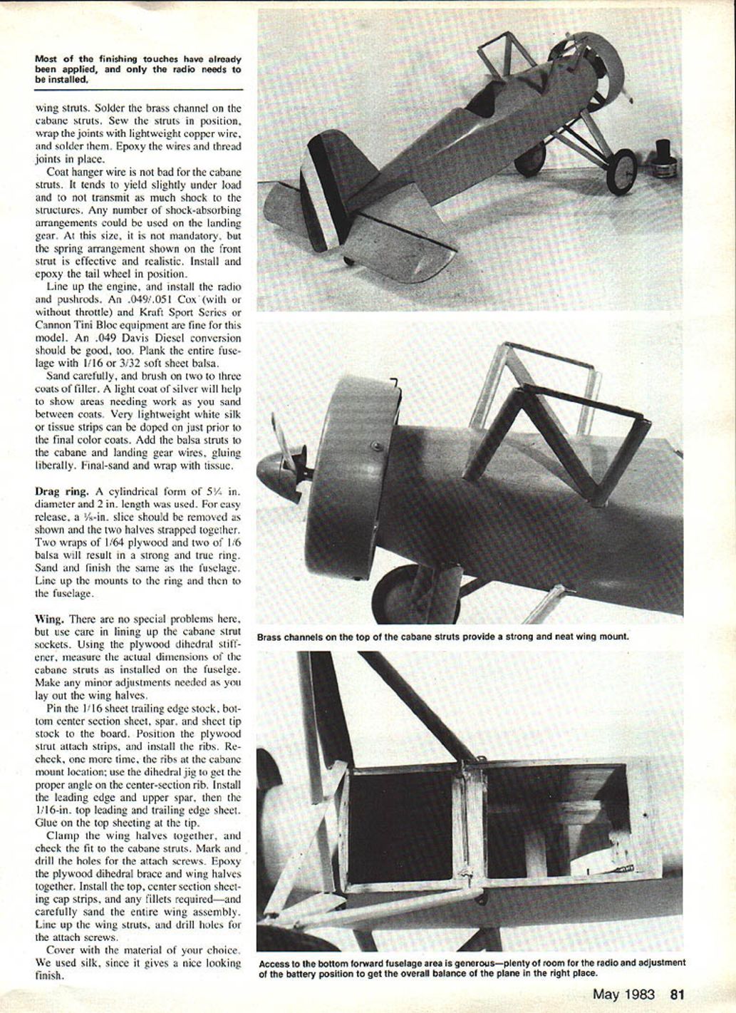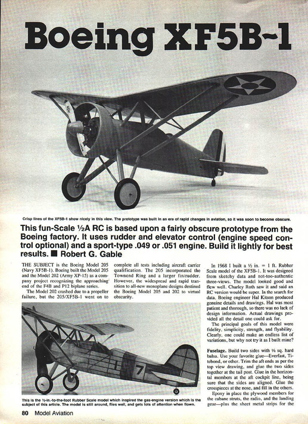 Crisp lines XF5B-1 show nicely view prototype built era rapid changes aviation soon become obscure fun-Scale /2A RC based upon fairly obscure prototype Boeing factory uses rudder elevator control engine speed con trol optional sport-type 049 051 engine Build lightly best results U Robert G Gable THE SUBJECT Boeing Model 205 Navy XF5B-l Boeing built Model 205 Model 202 Army XP-15 com pany project recognizing approaching end F4B P12 biplane series Model 202 crashed due propeller failure 205/XF5B-l went complete tests including aircraft carrier qualification 205 incorporated Townend Ring larger fin/rudder However widespread rapid tran sition all-new monoplane designs destined Boeing Model 205 202 virtual obscurity 1968 built /2 Rubber Scale model XF5B- 1 designed sketchy data not-too-authentic three-views model looked good flew well Charley Roth saw said RC version would super search data Boeing engineer Hal Kitson produced genuine details drawings Hal patient thorough no lack design information Actual drawings pro vided detail could ask principal goals model fidelity simplicity strength flyability Clearly could make endless list variations try built Fuselage Build two sides /8 sq hard balsa Use favorite glueEverfast Ti tebond other Trim aft ends per top view drawing glue two sides together tail post Glue horizon tal members aft cockpit line being sure sides aligned Glue crosspieces nose fill others Epoxy place plywood members cabane struts radio landing gearplus sheet metal strips 80 Model Aviation 1A-in-to-the-foot Rubber Scale model inspired gas-engine version subject article model still around flies well gets lots attention flown Most finishing touches have already applied radio needs installed wing struts Solder brass channel cabane struts Sew struts position wrap joints lightweight copper wire solder Epoxy wires thread joints place Coat hanger wire bad cabane struts tends yield slightly under load transmit much shock structures Any number shock-absorbing arrangements could used landing gear size mandatory spring arrangement shown front strut effective realistic Install epoxy tail wheel position Line up engine install radio pushrods An 049/051 Cox throttle Kraft Sport Series Cannon Tini Bloc equipment fine model An 049 Davis Diesel conversion should good too Plank entire fuse lage 1/16 3/32 soft sheet balsa Sand carefully brush two three coats filler light coat silver will help show areas needing work sand between coats Very lightweight white silk tissue strips can doped just prior final color coats Add balsa struts cabane landing gear wires gluing liberally Final-sand wrap tissue Drag ring cylindrical form 5 diameter 2 length used easy release /8-in slice should removed shown two halves strapped together Two wraps 1/64 plywood two 1/6 balsa will result strong true ring Sand finish same fuselage Line up mounts ring fuselage Wing no special problems use care lining up cabanc strut sockets Using plywood dihedral stiff ener measure actual dimensions cabane struts installed fuselge Make minor adjustments needed lay out wing halves Pin 1/16 sheet trailing edge stock bot tom center section sheet spar sheet tip stock board Position plywood strut attach strips install ribs Re check time ribs cabane mount location use dihedral jig get proper angle center-section rib Install leading edge upper spar 1/16-in top leading trailing edge sheet Glue top sheeting tip Clamp wing halves together check fit cabane struts Mark drill holes attach screws Epoxy plywood dihedral brace wing halves together Install top center section sheet ing cap strips fillets requiredand carefully sand entire wing assembly Line up wing struts drill holes attach screws Cover material choice used silk since gives nice looking finish May 1983 81 Brass channels top cabane struts provide strong neat wing mount Access bottom forward fuselage area generoisplenty room radio adjustment battery position get overall balance plane right place FULL-SIZE PLANS AVAILABLE. SEE PAGE 180 AC SREET TOP ONLY 1055 SPARS 116 SHEET TOP ITO SO LEASING EDGE PB RIBS LW RIBS TIE OR CAP STRIPS InC GREET TOP 8 -fr*~ TAB III ILii FORM FORLJ I}__IiSTIING PLAND8 ____if_ AILERON cfE010 SnEEr TOP 00 SPARSARO POP OBAPINSCOW MARC TWO Krca BWTiTZR AT ITCO FOR SrRSTOR FOOMERSFRAMEWORKI A-SO RAROWOODATTACRUENTODE S BOTTOM KBRASS LOANNELSOLDER2 PEN 1PM BOFURELARE FLANKEDVRSO DRIEDRA.SOLDER TO STROTBALSA BKAPOR LS OR 332110 LS LAM BRACEITKAIRE-WRES CORIL MADE FROM LARONATIONS OF VA ITO SO T BIND WIOB - 01 0-CEO METALITBDORIRPO BALSAPOOR RODITBPLYSIIABEL.EV TAB TO MATEFuLAOE SEEFRAME-WORKEOITSo TAILWREEL ______________________________IBAA 110 ABBE2 PEG OR GREET METAL TAB WILLIAMS BROS2T2205K BOEING XF5B-/ DES GNED BY R G GABLE DRAWN BY C E ROTH TRACING BY TOE DEMARCO Tail Earl Stahl method effective get both good aerodynamic shape nice looking assembly after covering As semble elevator stab install fuselage assemble fin rudder epoxy fuselage Finishing confusing part aircrafts background what colors used Bowers books said fuselage Boeing green tail bottom wing French gray top wing international orange Aero Publishers reference USN Fighters 1918-1964 said dark blue fuselage chrome yellow wing tail Another source said XP-15 olive drab fuselage struts yellow wing tail Logic review available pictures would make lean toward Bowers data other hand look military aircraft era youll find remarkable number color combinations various national signia numerous squadron identifi cation emblemsreally total lack con sistency used gray chrome yellow plus insignia type appropriate period Williams Brothers wheels model weighed 18 ounces Thats bit heavy flight characteristics little hot otherwise docile Like high-wing parasol XF5B stable responsive Keep CG forward one-third chord point 82 Model Aviation bottom hatch can either built-up minimum weight carved solid balsa block Bottom view wing center section shows slots brass channels fit Another view landing gear fuselage bottom now radio pl