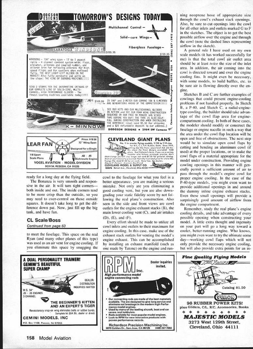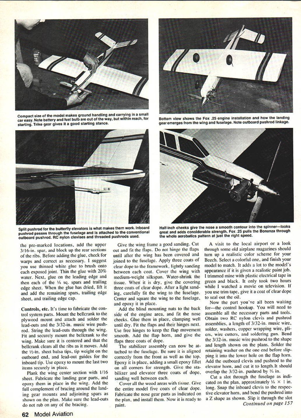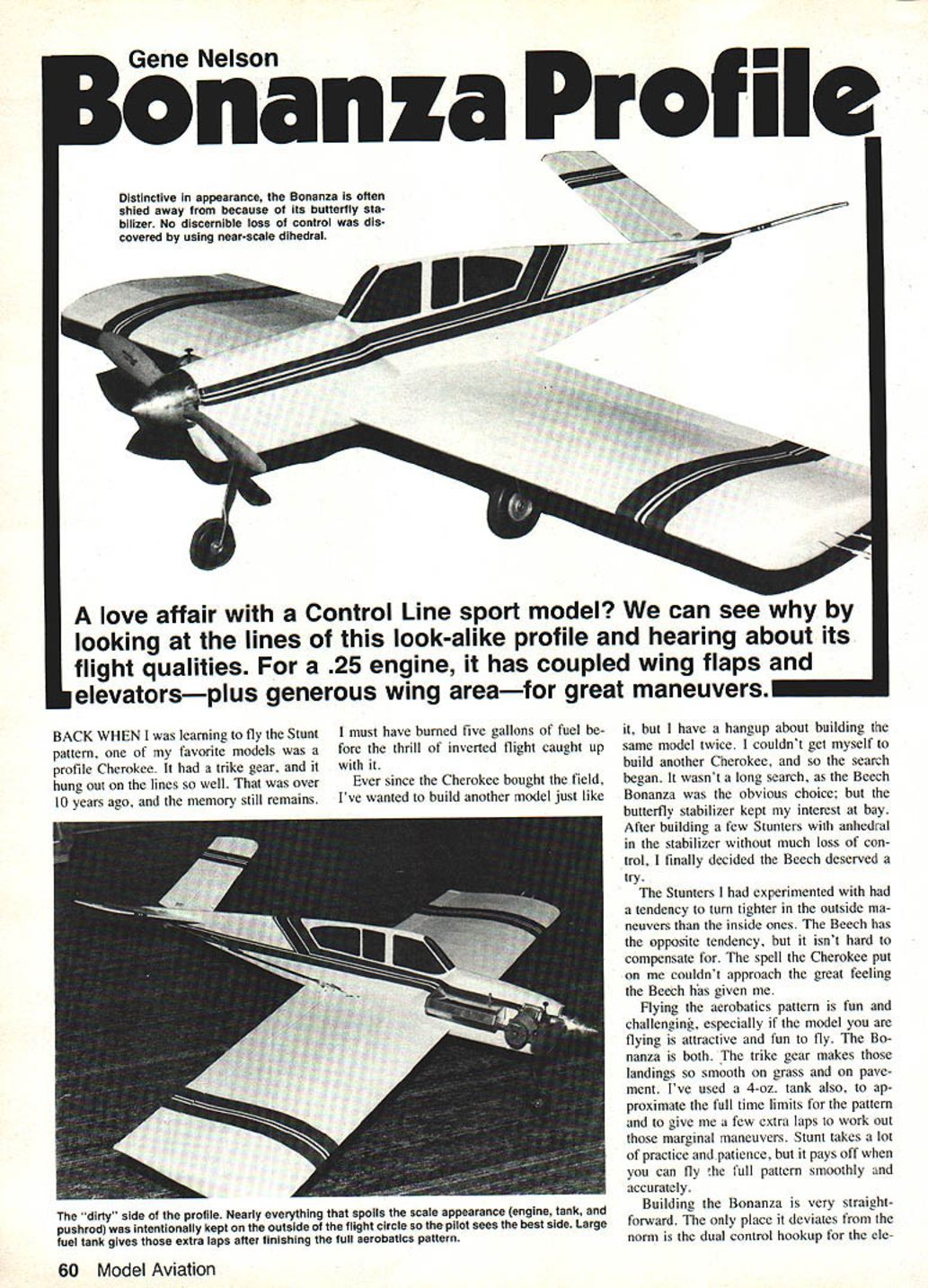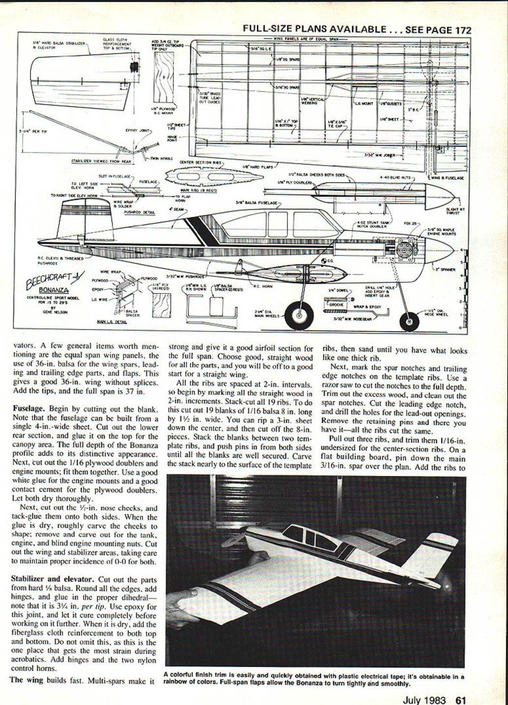 BACK WHEN learning fly Stunt pattern favorite models profile Cherokee trike gear hung out lines well over 10 years ago memory still remains have hangup about building same model twice couldnt get myself build another Cherokee search began wasnt long search Beech Bonanza obvious choice butterfly stabilizer kept interest bay After building few Stunters anhedral stabilizer much loss con trol finally decided Beech deserved try Stunters experimented tendency turn tighter outside ma neuvers inside ones Beech has opposite tendency isnt hard compensate spell Cherokee put couldnt approach great feeling Beech has given Flying aerobatics pattern fun challenging especially model flying attractive fun fly Bo nanza both trike gear makes landings smooth grass pave ment Ive used 4-oz tank also ap proximate full time limits pattern give few extra laps work out marginal maneuvers Stunt takes lot practice patience pays off can fly full pattern smoothly accurately Building Bonanza very straight forward place deviates norm dual control hookup ele 60 Model Aviation anza Prof Gene Nelson Distinctive appearance Bonanza often shied away because its butterfly sta bilizer No discernible loss control dis covered using near-scale dihedral love affair Control Line sport model can see wily looking lines look-alike profile hearing about its flight qualities 25 engine has coupled wing flaps atorsplus generous wing areafor great maneuvers must have burned five gallons fuel fore thrill inverted flight caught up Ever since Cherokee bought field Ive wanted build another model just like dirty side profile Nearly everything spoils scale appearance engine tank pushrod intentionally kept outside flight circle pilot sees best side Large fuel tank gives extra laps after finishing full aerobatics pattern FULL-SIZE PLANS AVAILABLE . SEE PAGE 172 GLASS CLOTHBOO S/N OZTIP 1/8 RAVE RALSA STABILIZERRONPYRCEMENTWEO4T OBTUWIND N CLEVATOT084TIP ONLY TIPS 3 /4 PER TIPEPOXY JOINT TWPA PORNS STABILIZER VIEWEC FROM REAR lINDE MRSG L E MOO 0/650 3/SE BORNS TIGE LEABIt l SIT GUIBESWEBBINGLB MGVRROSSEES IIIIY -il BA BC CLEYIS N THREBOES PA S GPO OS CONTROL-LINE SPORT MOREL PER IS TO 293 BY GENE SELSOR MANLURETAL OR PLY04MW LBV4MALSABC ROBS PR SHOWNSPACER WREOVBSORELUASB EPOXY N INSERT BEAR L-IklGROOVE WRAP N EPOXY 01.flI-I/O OR WW2~ROSE WBEEL vators few general items worth men tioning equal span wing panels use 36-in balsa wing spars lead ing trailing edge parts flaps gives good 36-in wing splices Add tips full span 37 Fuselage Begin cutting out blank Note fuselage can built single 4-in-wide sheet Cut out lower rear section glue top canopy area full depth Bonanza profile adds its distinctive appearance Next cut out 1/16 plywood doublers engine mounts fit together Use good white glue engine mounts good contact cement plywood doublers Let both dry thoroughly Next cut out /2-in nose cheeks tack-glue onto both sides glue dry roughly carve checks shape remove carve out tank engine blind engine mounting nuts Cut out wing stabilizer areas taking care maintain proper incidence 0-0 both Stabilizer elevator Cut out parts hard balsa Round edges add hinges glue proper dihedral note 3 per tip Use epoxy joint let cure completely before working further dry add fiberglass cloth reinforcement both top bottom omit this place gets strain during aerobatics Add hinges two nylon control horns strong give good airfoil section full span Choose good straight wood parts will off good start straight wing ribs spaced 2-in intervals begin marking straight wood 2-in increments Stack-cut 19 ribs cut out 19 blanks 1/16 balsa 8 long 1 /2 wide can rip 3-in sheet down center cut off 8-in pieces Stack blanks between two tem plate ribs push pins both sides until blanks well secured Carve stack nearly surface template ribs sand until have what looks like thick rib Next mark spar notches trailing edge notches template ribs Use razor saw cut notches full depth Tnm out excess wood clean out spar notches Cut leading edge notch drill holes lead-out openings Remove retaining pins have itall ribs cut same Pull out three ribs trim l/16-in undersized center-section ribs flat building board pin down main 3/16-in spar over plan Add ribs July 1983 61 S/G2MWJGB$R,A1110 ____________DENTER SECTIONj__________ JI SLOT IN FASEL RAEI/ZRALSB OBOEBS DOER smI SELAGE TO LEFT SIRE FUSELAGEIAN PLY SOTIRLERO ELEY BORN MAIN RIBS IS REQS TO BOlT SlOE EIEY BORN FLAP WIPE WRAP /BORN3/N BALSA-, N SOLDER 450AMSLIWIT NT PUORROB CORALTMPOST RUlER DOUBLER 3/M SO MAPLE ENONE WRONIS Z OlRNER 3A colorful finish trim easily quickly obtained plastic electrical tape its obtainable wing builds fast Multi-spars make rainbow colors Full-span flaps allow Bonanza turn tightly smoothly pre-marked locations add upper 3/16-in spar block up rear sections ribs Before adding glue check warps correct necessary suggest use thinned white glue brush onto exposed joint Thin glue 20% water Next glue leading edge sq spars trailing edge sheet glue has dried lift add remaining spars trailing edge sheet trailing edge cap Controls etc Its time fabricate con trol system parts Mount bellcrank plywood mount attach solder lead-outs 3/32-in music wire pushrod String lead-outs through wing Fit securely mount bellcrank wing Make sure centered bellcrank clears ribs moves Add -in sheet balsa tips tip weight outboard end lead-out guides inboard tip Use epoxy mount last two items securely place Plank wing center section 1/16 sheet Fabricate landing gear parts epoxy place wing Add full complement bracing around land ing gear mounts adjoining spars shown plan Make sure lead-outs rub bracing Give wing frame good sanding Cut out fit flaps hinge flaps until after wing has covered joined fuselage Apply three coats clear dope framework lightly sanding between coat Cover wing medium-weight silkspan Water-shrink tissue dry give covering three coats clear dope After light sand ing carefully fit wing fuselage Center square wing fuselage epoxy place Add blind mountin