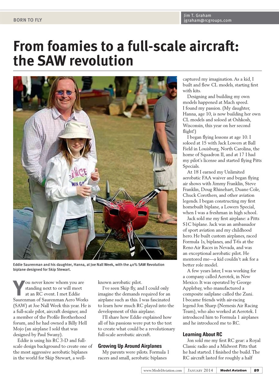 You never know whom you are standing next to or will meet at an RC event. I met Eddie Saurenman of Saurenman Aero Works (SAW) at Joe Nall Week this year. He is a full-scale pilot, aircraft designer, and a member of The Profile Brotherhood forum, and he had owned a Billy Hell Mojo (an airplane I sold that was designed by Paul Swany).