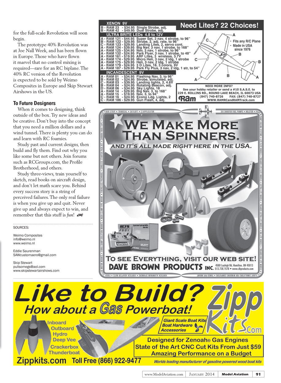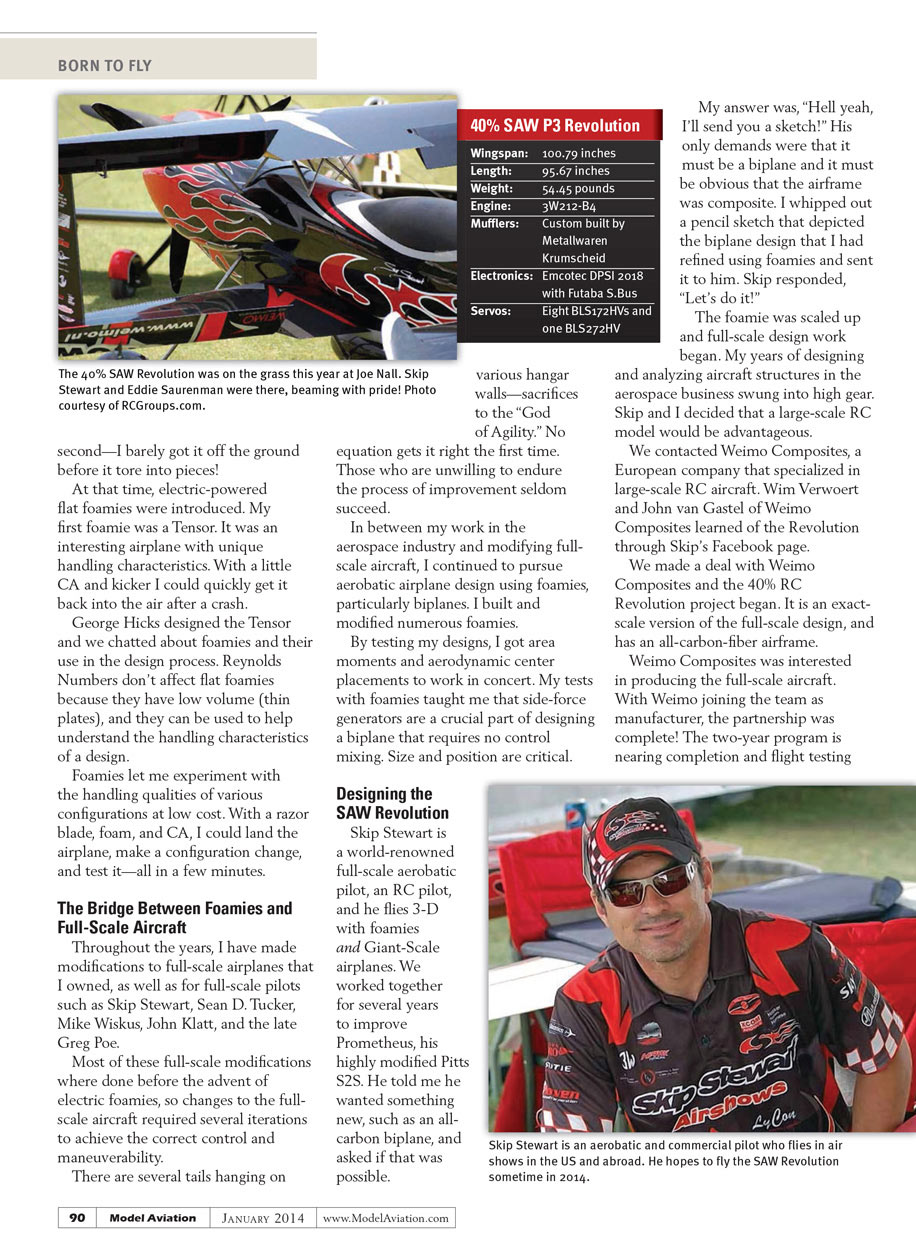 The prototype 40% Revolution was at Joe Nall Week, and has been flown in Europe. Those who have flown it marvel that no control mixing is required—rare for an RC biplane. The 40% RC version of the Revolution is expected to be sold by Weimo Composites in Europe and Skip Stewart Airshows in the US.