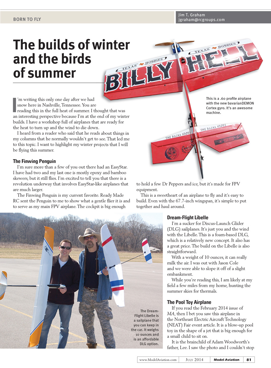 I’m writing this only one day after we had snow here in Nashville, Tennessee. You are reading this in the full heat of summer. I thought that was an interesting perspective because I’m at the end of my winter builds. I have a workshop full of airplanes that are ready for the heat to turn up and the wind to die down.