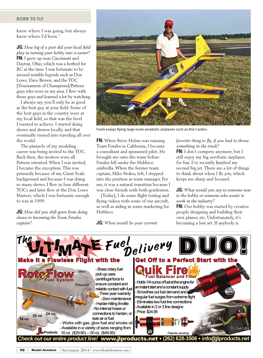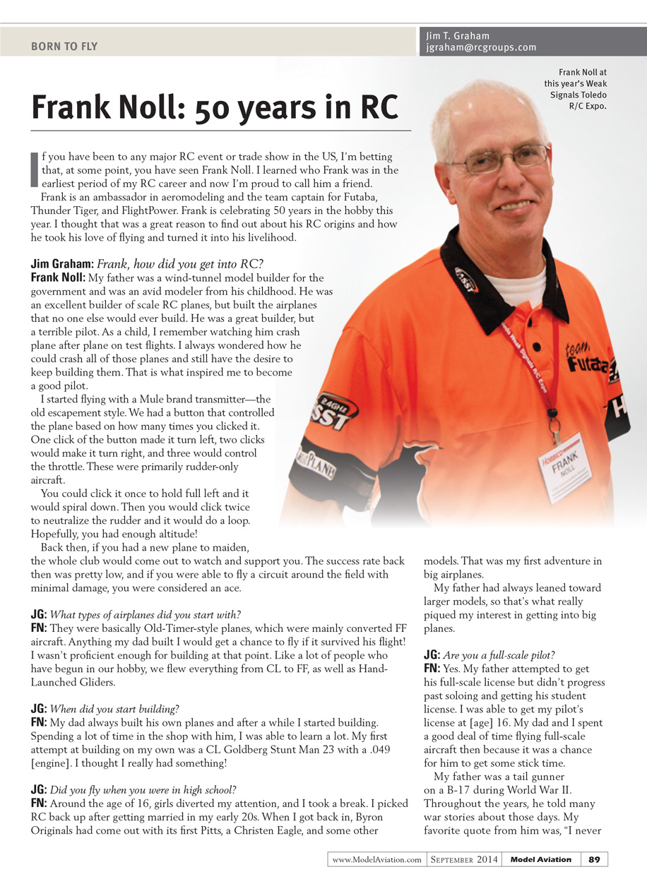 Frank Noll: My father was a wind-tunnel model builder for the government and was an avid modeler from his childhood. He was an excellent builder of scale RC planes, but built the airplanes that no one else would ever build. He was a great builder, but a terrible pilot. As a child, I remember watching him crash plane after plane on test flights. I always wondered how he could crash all of those planes and still have the desire to keep building them. That is what inspired me to become a good pilot.
