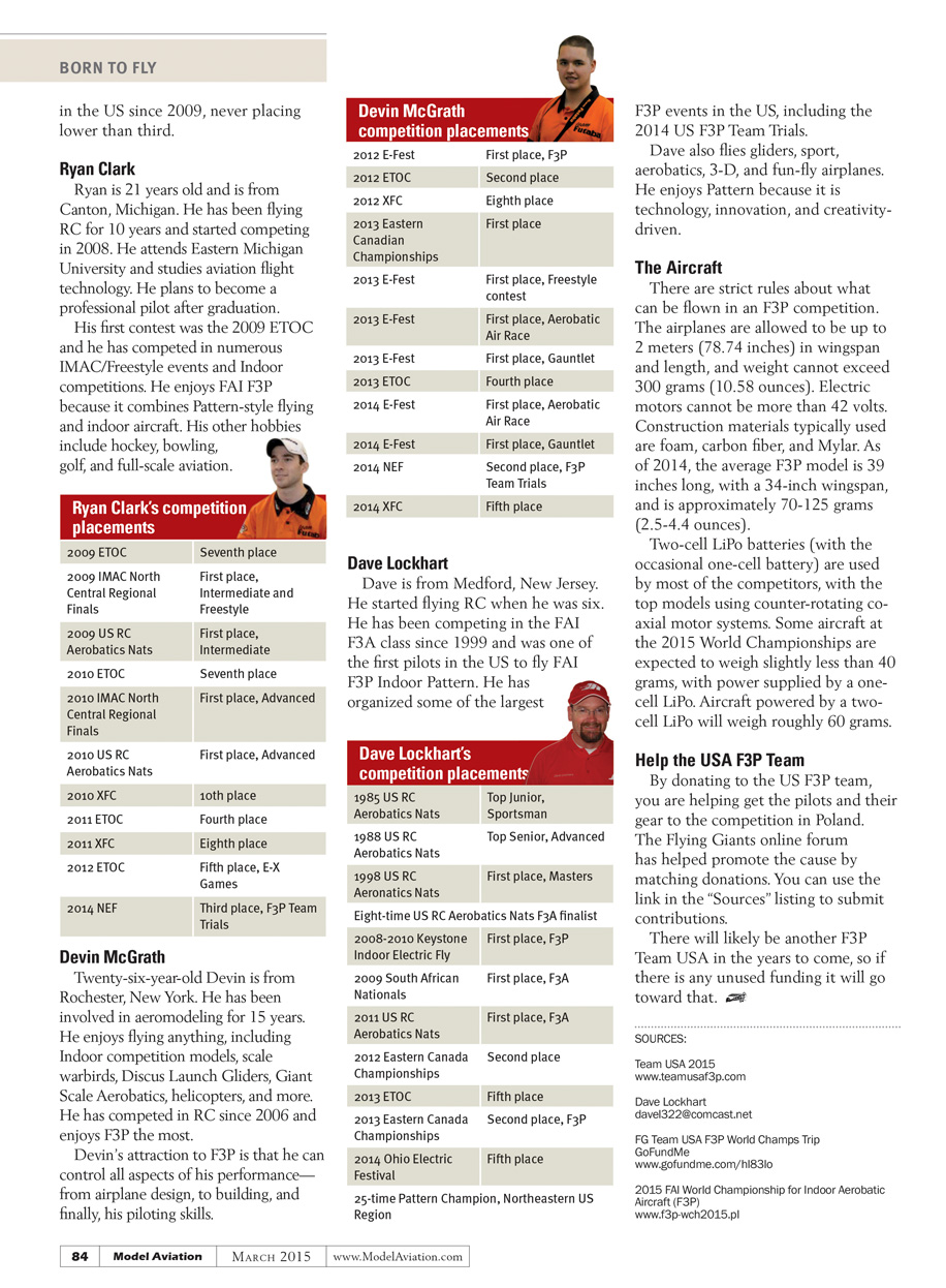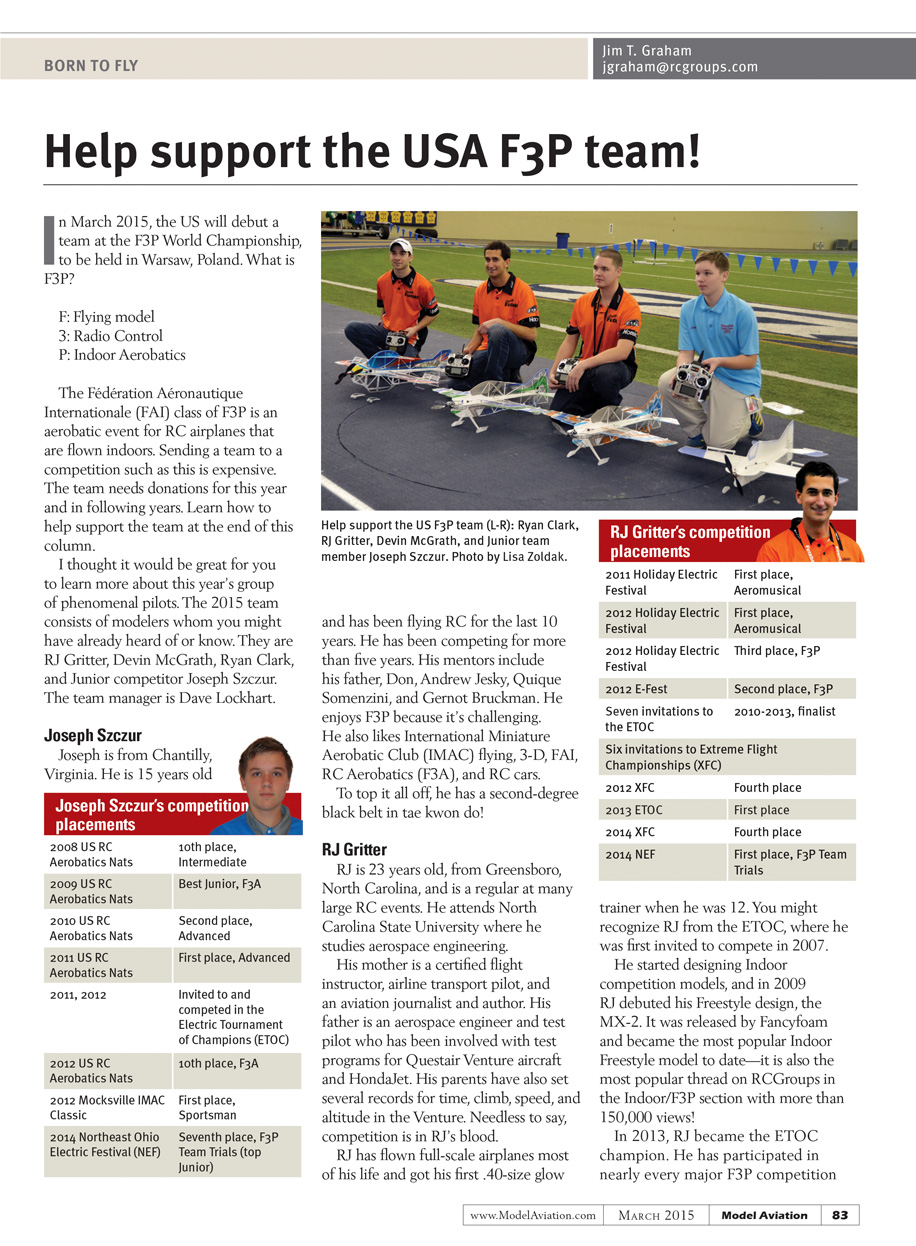 The Fédération Aéronautique Internationale (FAI) class of F3P is an aerobatic event for RC airplanes that are flown indoors. Sending a team to a competition such as this is expensive. The team needs donations for this year and following years. Learn how to help support the team at the end of this column.
