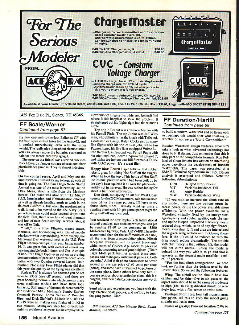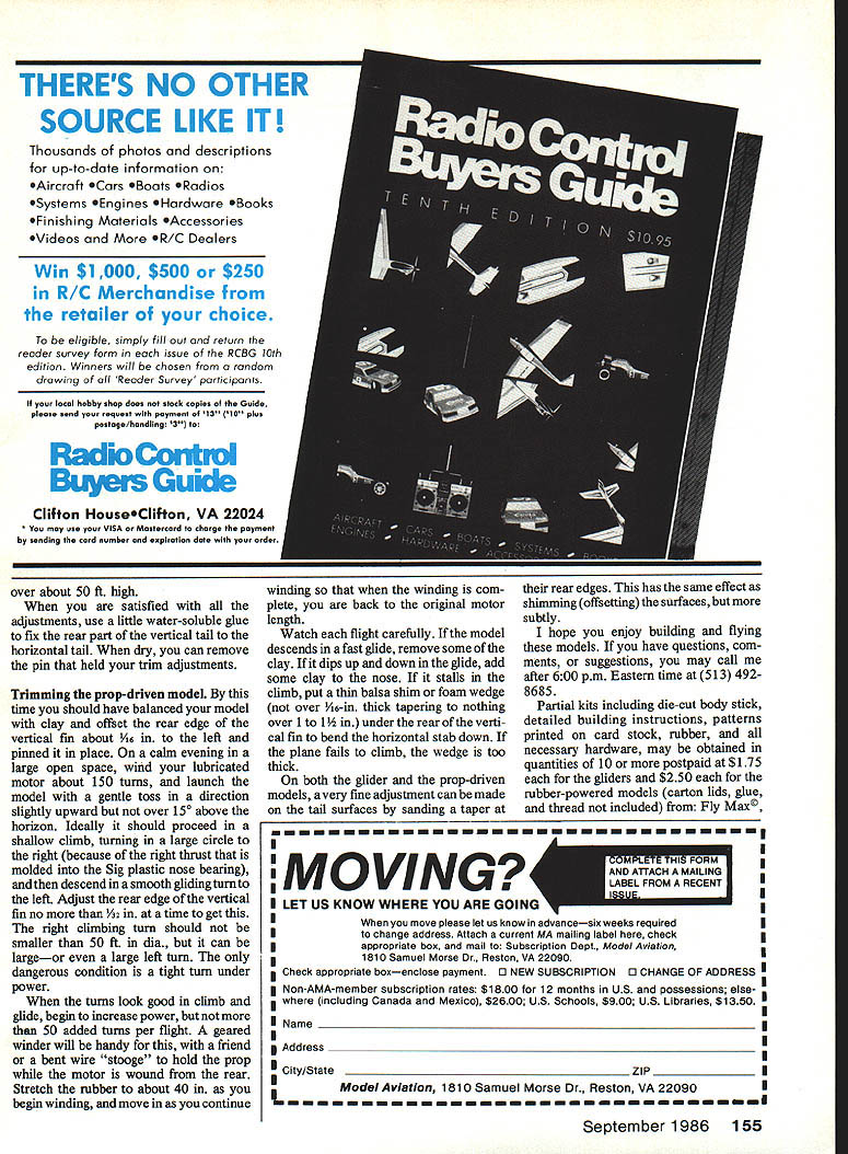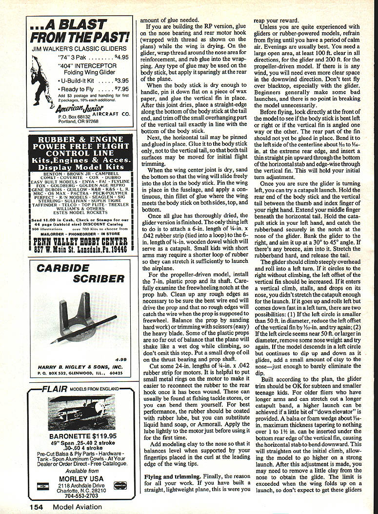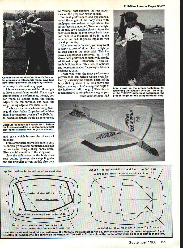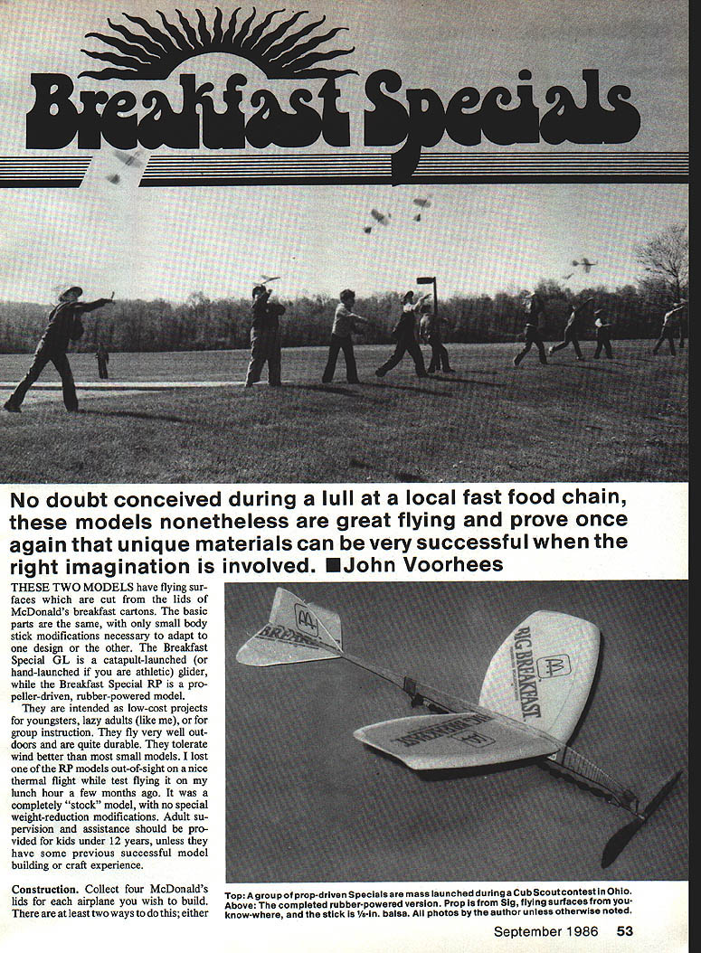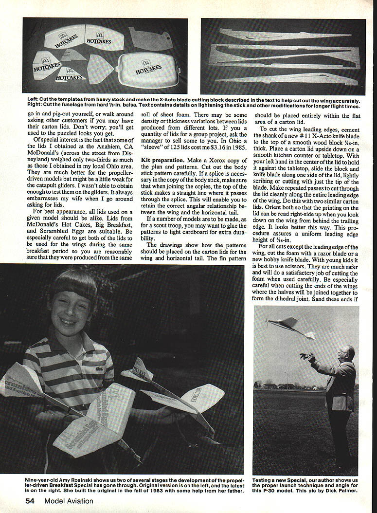 No doubt conceived during lull local fast food chain models nonetheless great flying prove once again unique materials can very successful right imagination involved EJohn Voorhees THESE TWO MODELS have flying sur faces cut lids McDonalds breakfast cartons basic parts same small body stick modifications necessary adapt design other Breakfast Special GL catapult-launched hand-launched athletic glider Breakfast Special RP pro peller-driven rubber-powered model intended low-cost projects youngsters lazy adults like group instruction fly very well out doors quite durable tolerate wind better small models lost RP models out-of-sight nice thermal flight test flying lunch hour few months ago completely stock model no special weight-reduction modifications Adult su pervision assistance should pro vided kids under 12 years unless have some previous successful model building craft experience Construction Collect four McDonalds lids airplane wish build Top Agroupof prop-driven Specialsare mass launched during aCub Scoutcontestlfl Ohio Above completed rubber-powered version Prop Sig flying surfaces youThere least two ways dothis either know-where stick 1/s-ln balsa photos author unless otherwise noted September 1986 53 Left Cutthe templates heavy stock make XActo blade cutting block described text help cut out wing accurately Right Cut fuselage hard Is-In balsa Text contains details lightening stick other modificatIons longer flight times go pig-out yourself walk around asking other customers may have carton lids Dont worry youll get used puzzled looks get special interest fact some lids obtained Anahiem CA McDonalds across street Dis neyland weighed two-thirds much obtained local Ohio area much better propellerdriven models might little weak catapult gliders wasnt able obtain enough test gliders always embarrasses wife go around asking lids best appearance lids used given model should alike Lids McDonalds Hot Cakes Big Breakfast Scrambled Eggs suitable especially careful get both lids used wings during same breakfast period reasonably sure produced same roll sheet foam may some density thickness variations between lids produced different lots quantity lids group project ask manager sell some Ohio sleeve 125 lids costme $316 1985 Kit preparation Make Xerox copy plan patterns Cut out body stick pattern carefully splice neces sary copy body stick make sure joining copies top stick makes straight line passes through splice will enable retain correct angular relationship tween wing horizontal tail number models made scout troop may want glue patterns light cardboard extra dura bility drawings show patterns should placed carton lids wing horizontal tail fin pattern should placed entirely within flat area carton lid cut wing leading edges cement shank new #11 X-Acto knife blade top smooth wood block /16-in thick Place carton lid upside down smooth kitchen counter tabletop left hand center lid hold against tabletop slide block knife blade along side lid lightly scribing cutting just tip blade Make repeated passes cut through lid cleanly along entire leading edge wing two similar carton lids Orient both printing lid can read right-side up look down wing behind trailing edge looks better way pro cedure assures uniform leading edge height /i6-in cuts except leading edge wing cut foam razor blade new hobby knife blade young kids best use scissors much safer will satisfactory job cutting foam used carefully especially careful cutting ends wings halves will joined together form dihedral joint Sand ends 54 Model Aviation Nine-year-old Amy Rosinaki shows us two several stages development propel br-driven Breakfast Special has gone through Original version left latest right built original fail 1983 wIth some help father Testing new Special author shows us proper launch technique angle P30 model plc Dick Palmer Concentration Cub Scouts face prepares reiease modei says just far piane can take young modeier necessary eliminate gaps necessary sand other edges have good-flying model slight improvement performance though can round leading edges trailing edges tail surfaces bevel wing trailing edge less 1A2-in body stick made strong -in A-grain sheet balsa Experienced builders should use medium density 7 10 lb/cu ft wood Beginners would better use Catapuit isunches can reach 50 ft before forces exceed wing strength Model also hand isunches weii youre athietic hard balsa lessens chance breakage Trace around body stick pattern onto sheeting ball-point pen cut out care using sharp hobby knife Give special attention wing slot Note differences body stick nose outline between catapult glider propeller-driven model also note bump supports rear motor hook propeller-driven model best performance appearance round edges body stick sandpaper everywhere except tail surfaces mounted reduce weight tail use sanding block taper body stick rear motor hook loca tion back thickness /i6in extreme tail end youre impatient can skip step After sanding finished may want apply coat either clear lightlycolored dope body stick im proves appearance somewhat will also reduce performance slightly due additional weight Obviously also ex tends building time too optional recommended young builders beginner groups want performance performance can reduce weight fur ther lessening vertical height body stick about above below wing Dont change angle horizontal tail though step recommended group leaders give Continued page 153 September 1986 55 Full-Size Plan Pages 86-87 Amy shows us proper technique iaunching catapuit version iength piiots arms best determines proper length catapuit rubber strip Test Pilot MACA Engineer Combat power systems analyst listing Help Wanted section latest MACA Newsletter What deal get play very latest equipment manufacturers get findings published MACA Newsletter MA too Send resume Doc Passen PO Box 111 Jasonville IN 47438 serious position dont waste Docs time some crank letter better call him instead Issues MACA Newsletter have com