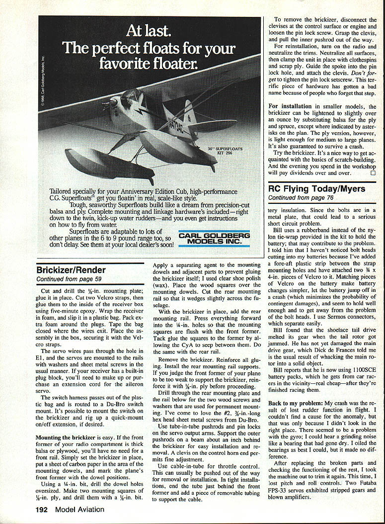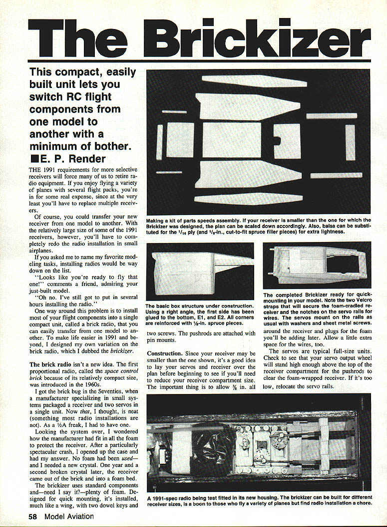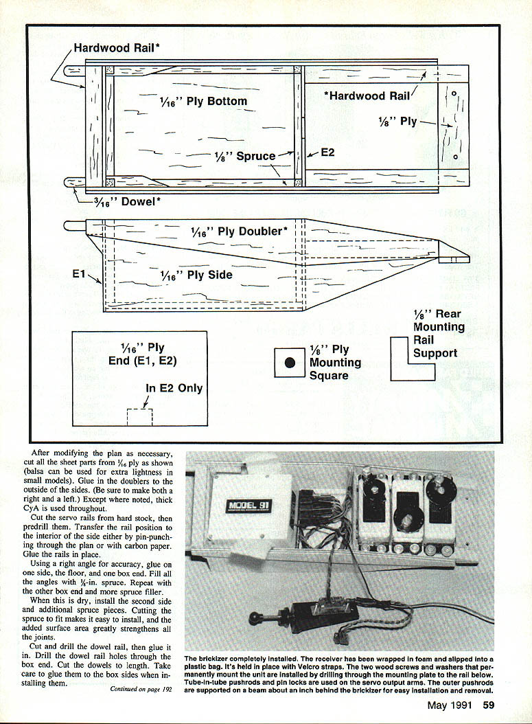 The compact easily built unit lets switch RC flight components model another minimum bother HE P Render THE 1991 requirements selective receivers will force us retire ra dio equipment enjoy flying variety planes several flight packs youre some real expense since very least youll have replace multiple receiv ers course could transfer new receiver model another relatively large size some 1991 receivers however youll have com pletely redo radio installation small airplanes asked name favorite mod eling tasks installing radios would way down list Looks like youre ready fly comments friend admiring just-built model Oh no Ive still got put several hours installing radio way around problem install flight components single compact unit called brick radio can easily transfer model other make life easier 1991 yond designed own variation brick radio dubbed brickizer brick radio isnt new idea first proportional radio called space control brick because its relatively compact size introduced 1960s got brick bug Seventies manufacturer specializing small sys tems packaged receiver two servos single unit Now thought neat something radio installations As freak have Looking system over wondered manufacturer fit foam protect receiver After particularly spectacular crash opened up case answer No foam used needed new crystal year second broken crystal later receiver came out brick foam bed brickizer uses standard components andneed say itplenty foam De signed quick mounting its installed much like wing two dowel keys compieted Brickizer ready quickmounting modei Note two Velcro basic box structure under construction straps wiii secure foam-cradled re using right angie first side has ceiver notches servo raiis giued bottom El E2 Au corners wires servos mount ralis reinforced -in spruce pieces usual washers sheet metai screws around receiver plugs foam youll adding later Allow little extra space wires too servos typical full-size units Check see servo output wheel will stand high enough above top receiver compartment pushrods clear foam-wrapped receiver its too two screws pushrods attached pin mounts Construction Since receiver may smaller shown its good idea lay servos receiver over plan before beginning see youll need reduce receiver compartment size important thing allow % low relocate servo rails 58 Model Aviation Making kit parts speeds assembly receiver smalier Brickizer designed pian can scaled down accordingiy Aiso balsa can substi tuted 11-in cut-to-lit spruce filier pieces extra lightness 1991-spec radio being test fitted its new housing brickizer can buiit different receiver sizes boon fly variety planes find radio installation chore Hardwood RaiI* /1A6PlyBttom* Hardwood Rail7 I------ 8Spruce I.I 3Ae Dowel* 1/s Rear Mounting Rail Support m / Ply SI Mounting LJ Square After modifing plan necessary cut sheet parts 1/16 ply shown balsa can used extra lightness small models Glue doublers outside sides sure make both right left Except noted thick CyA used throughout Cut servo rails hard stock predrill Transfer rail position interior side either pin-punch ing through plan carbon paper Glue rails place Using right angle accuracy glue side floor box end Fill angles 1A-in spruce Repeat other box end spruce filler dry install second side additional spruce pieces Cutting spruce fit makes easy install added surface area greatly strengthens joints Cut drill dowel rail glue Drill dowel rail holes through box end Cut dowels length Take care glue box sides stalling Continued page 192 brickizer completely installed receiver has wrapped foam alipped plastic bag its held place Velcro straps two wood screws washers per manently mount unit Installed drilling through mounting plate rail below Tube-In-tube pushrods pin locks used servo output arma outer pushrods supported beam about inch behind brickizer easy installation removal May 1991 59 Vie Ply End El E2 E2 Only F / II Brickizer/Render Continued page 59 Cut drill 4-in mounting plate glue place Cut two Velcro straps glue inside receiver box using five-minute epoxy Wrap receiver foam slip plastic bag Pack ex tra foam around plugs Tape bag closed wires exit Place sembly box securing Vel cro straps servo wires pass through hole El servos mounted rails washers sheet metal screws usual manner receiver has built-in plug block youll need make up pur chase extension cord aileron servo switch harness passes out plas tic bag routed Du-Bro switch mount Its possible mount switch brickizer rig up quick-mount on/off extension desired Mounting brickizer easy front former radio compartment thick balsa plywood youll have no need front rail Simply set brickizer place put sheet carbon paper area mounting dowels mark planes front former dowel positions Using A-in bit drill dowel holes oversized Make two mounting squares A-in ply drill A-in bit Apply separating agent mounting dowels adjacent parts prevent gluing brickizer itself used clear shoe polish wax Place wood squares over mounting dowels Cut rear mounting rail wedges slightly across fu selage brickizer place add rear mounting rail Press everything forward A-in holes mounting squares flush front former Tack glue squares former al lowing CyA seep between same rear rail Remove brickizer Reinforce glu ing Install rear mounting rail supports judge front former plane too weak support brickizer rein force A-in ply before proceeding Drill through rear mounting plate rail below two wood screws washers used permanent mount ing Ive come love #2 3A-in-long hex head sheet metal screws Du-Bro Use tube-in-tube pushrods pin locks servo output arms Support outer pushrods beam about inch behind brickizer easy installation re moval clevis control horn end per mits fine adjustment Use cable-in-tube throttle control can usually pushed out way removal installation tight installa tions end tube just behind front former add piece removable tubing support cable remove brickizer disconnect devises control surface engine loosen pin lock screw Grasp clevis pul
