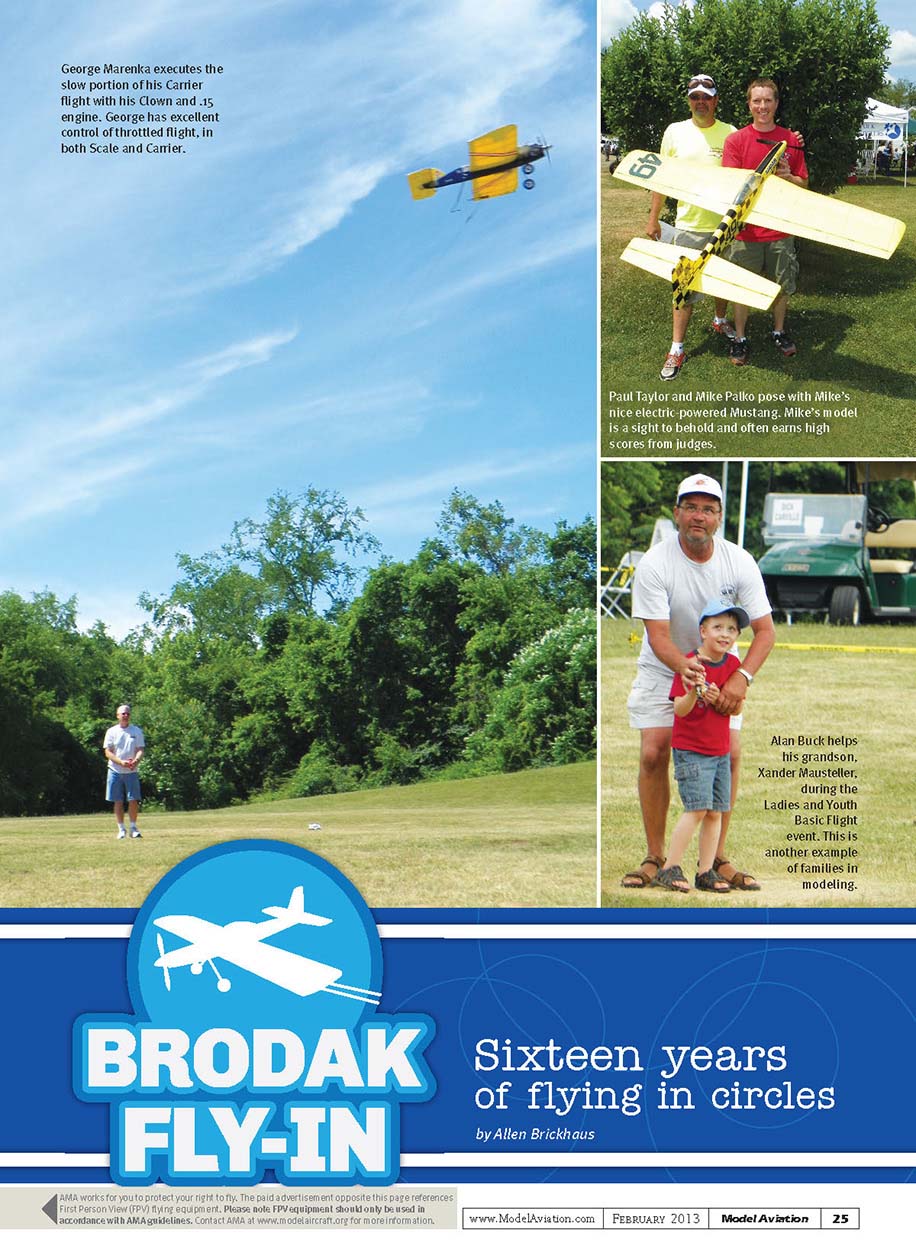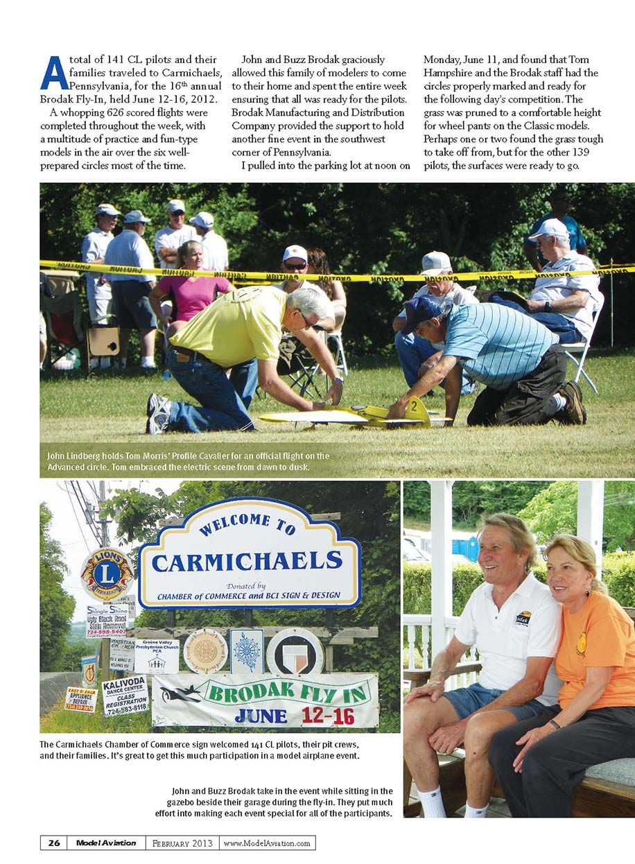 A total of 141 CL pilots and their families traveled to Carmichaels, Pennsylvania, for the 16th annual Brodak Fly-In, held June 12-16, 2012. A whopping 626 scored fl ights were completed throughout the week, with a multitude of practice and fun-type models in the air over the six well-prepared circles most of the time. John and Buzz Brodak graciously allowed this family of modelers to come to their home and spent the entire week ensuring that all was ready for the pilots. Brodak Manufacturing and Distribution Company provided the support to hold another fi ne event in the southwest corner of Pennsylvania. I pulled into the parking lot at noon on Monday, June 11, and found that Tom Hampshire and the Brodak staff had the circles properly marked and ready for the following day’s competition. The grass was pruned to a comfortable height for wheel pants on the Classic models. Perhaps one or two found the grass tough to take off from, but for the other 139 pilots, the surfaces were ready to go. The Carmichaels Chamber of Commerce sign welcomed 141 CL pilots, their pit crews, and their families. It’s great to get this much participation in a model airplane event.John Lindberg holds Tom Morris’ Pro le Cavalier for an o cial flight on the Advanced circle. Tom embraced the electric scene from dawn to dusk.John and Buzz Brodak take in the event while sitting in the gazebo beside their garage during the fly-in. They put much e ort into making each event special for all of the participants.26Model Aviation FEBRUARY 2013www.ModelAviation.com025