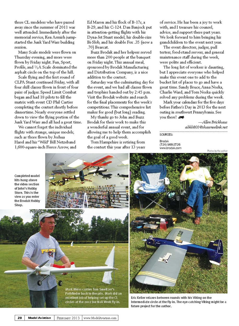 those CL modelers who have passed away since the summer of 2011 was well attended. Immediately after the memorial service, Ken Armish jump-started the Junk Yard Wars building session. Many Scale models were fl own on Thursday evening, and more were fl own by Friday night. Fun, Sport, Profi le, and 1/2A Scale dominated the asphalt circle on the top of the hill. Scale fl ying and the fi rst round of CLPA Stunt continued Friday, with all four skill classes fl own in front of four pairs of judges. Speed Limit Combat began and had 18 pilots to fi ll the matrix with event CD Phil Cartier completing the contest shortly before dinnertime. Nearly everyone settled down to view the fl ying portion of the Junk Yard Wars and all had a great time. We cannot forget the individual fl ights with strange, unique models, such as those fl own by Joshua Harel and his “Wild” Bill Netzeband 1,600-square-inch Fierce Arrow, and Ed Mason and his fl ock of B-17s, a B-29, and his C-124. Dan Banjock put in attention-getting fl ights with his Dyna-Jet Stunt model, his double-size Bi-Slob, and his double Fox .35 (now a .70) Bearcat. Buzz Brodak and her helpers served more than 200 people at the banquet on Friday night. This annual meal, sponsored by Brodak Manufacturing and Distribution Company, is a nice addition to the contest. Saturday was the culminating day for the event, and we had all classes fl own and trophies handed out by 2:45 p.m. Visit the Brodak website and search for the fi nal placements for the week’s competitions. This comprehensive list makes for good (but long) reading. My thanks go to John and Buzz Brodak for their work to make this a wonderful annual event, and for allowing me to help them accomplish the goal of a good week. Tom Hampshire is retiring from the contest this year after 13 years of service. He has been a joy to work with, and I treasure his counsel, advice, and support these past years. We look forward to him bringing his grandchildren to the event next year. The event directors, judges, pull testers, food-stand servers, and general maintenance staff during the week, were polite and effi cient. The long list of workers is daunting, but I appreciate everyone who helped make this event one to add to the bucket list of places to go and have a great time. Sandy Bruce, Anna Noska, Charlie Ward, and Tom Noska quickly solved any problems during the week. Mark your calendars for the fi ve days before Father’s Day in 2013 for the next outing in southwest Pennsylvania. See you there! —Allen Brickhausabkb801@shawneelink.netSOURCES:Brodak(724) 966-2726www.brodak.comCompleted model kits hang above the video section of John’s Hobby Store. This is the view as you enter the Brodak Hobby Shop.Eric Keller relaxes between rounds with his Viking on the Intermediate circle at the fly-in. The eye-catching Viking might be a future project for the author.Mark Weiss carries Tom Smeltzer’s Path nder back to the pits. Mark did an excellent job of helping set up the CL circles at the 2012 Joe Nall Week fly-in.Photos by the author28Model Aviation FEBRUARY 2013www.ModelAviation.com025