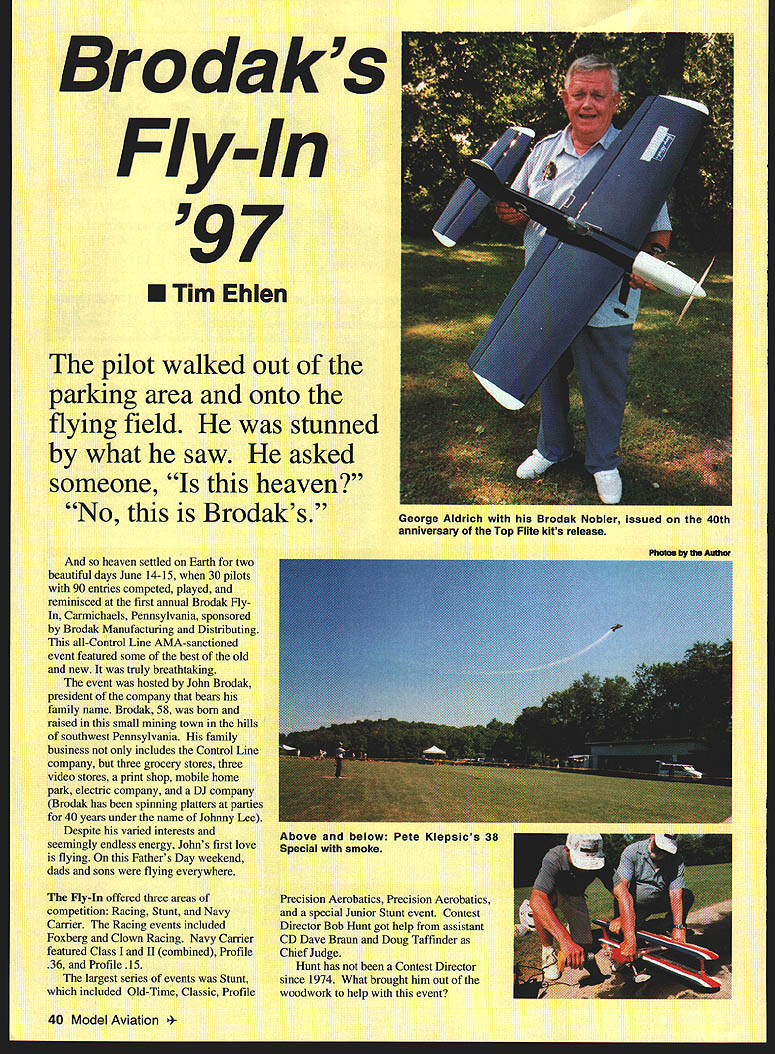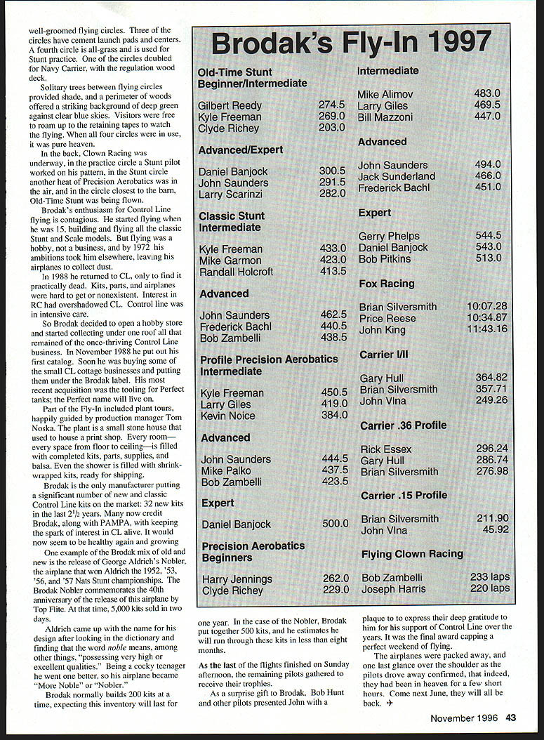 Bro daks Fly-In 97 U Tim Ehien pilot walked out parking area onto flying field stunned what saw asked someone heaven No Brodaks heaven settled Earth two beautiful days June 14-15 30 pilots 90 entries competed played reminisced first annual Brodak Fly Carmichaels Pennsylvania sponsored Brodak Manufacturing Distributing all-Control Line AMA-sanctioned event featured some best old new truly breathtaking event hosted John Brodak president company bears family name Brodak 58 born raised small mining town hills southwest Pennsylvania family business includes Control Line company three grocery stores three video stores print shop mobile home park electric company DJ company Brodak has spinning platters parties 40 years under name Johnny Lee Despite varied interests seemingly endless energy Johns first love flying Fathers Day weekend dads sons flying everywhere Fly-In offered three areas ofPrecision Aerobatics Precision Aerobatics competition Racing Stunt Navyand special Junior Stunt event Contest Carrier Racing events includedDirector Bob Hunt got help assistant Foxberg Clown Racing Navy CarrierCD Dave Braun Doug Taffinder featured Class II combined ProfileChief Judge 36 Profile 15 has Contest Director largest series events Stuntsince 1974 What brought him out included Old-Time Classic Profilewoodwork help event 40 Model Aviation ge Aldrich Brodak Nobler issued 40th anniversary Top Flite kits release Above below Pete Klepsics 38 Special smoke wanted help John efforts support Control Line flying Hunt said has done much bring back hobby Just looking number Stunt pilots reactions weekend event may become Vintage Stunt Championship East Taffinder echoed Hunts thoughts great site beautiful support good pilots having good weekend flying great flying enough Stunt legend George Aldrich also present meet talk pilots Aldrich Nats stunt champion times over honored Brodak bringing out new kit famous Nobler George spent time reminiscing pilots has known over years new pilots wanted meet him gracious everyone offering advice talking engines looking old pictures airplanes pilots Nats past did chalk-talk seminar engines rapt group 15 have number contests will never forget weekend Aldrich said Fly-In literally held Brodaks backyard site ten acres four November 1997 41 Kyle Freeman 05 FP 40-powered Semetar Dan Banjock ST A6powered Stiletto Dragon Fox 35 power Contest DIrector Bob Hunt helps start stubborn Pattern Master designed Jim Greenway flown Gary Lutz Bill Harris holds Flying Clown classic Enya 19 took second place Clown Racing 220 laps Randy Hoicroft launches Miss Joanne Bob Zambelli Clown Racing event Bob first 233 laps well-groomed flying circles Three circles have cement launch pads centers fourth circle all-grass used Stunt practice circles doubled Navy Cagier regulation wood deck Solitary trees between flying circles provided shade perimeter woods offered striking background deep green against clear blue skies Visitors free roam up retaining tapes watch flying four circles use pure heaven back Clown Racing underway practice circle Stunt pilot worked pattern Stunt circle another heat Precision Aerobatics air circle closest barn Old-Time Stunt being flown Brodaks enthusiasm Control Line flying contagious started flying 15 building flying classic Stunt Scale models flying hobby business 1972 ambitions took him elsewhere leaving airplanes collect dust 1988 returned CL find practically dead Kits pans airplanes hard get nonexistent Interest RC overshadowed CL Control line intensive care So Brodak decided open hobby store started collecting under roof remained once-thriving Control Line business November 1988 put out first catalog Soon buying some small CL cottage businesses putting under Brodak label recent acquisition tooling Perfect tanks Perfect name will live Pan Fly-In included plant tours happily guided production manager Tom Noska plant small stone house used house print shop room space floor ceilingis filled completed kits parts supplies balsa shower filled shrinkwrapped kits ready shipping Brodak manufacturer putting significant number new classic Control Line kits market 32 new kits last 21/2 years now credit Brodak along PAMPA keeping spark interest CL alive would now seem healthy again growing example Brodak mix old new release George Aldrichs Nobler airplane won Aldrich 1952 53 56 57 Nats Stunt championships Brodak Nobler commemorates 40th anniversary release airplane Top Flite time 5000 kits sold two days Aldrich came up name design after looking dictionary finding word noble means among other things possessing very high excellent qualities Being cocky teenager went better airplane became Noble Nobler Brodak normally builds 200 kits time expecting inventory will last year case Nobler Brodak put together 500 kits estimates will run through kits less eight months As last flights finished Sunday afternoon remaining pilots gathered receive trophies As surprise gift Brodak Bob Hunt other pilots presented John plaque to express deep gratitude him support Control Line over years final award capping perfect weekend flying airplanes packed away last glance over shoulder pilots drove away confirmed indeed heaven few short hours Come next June will back mber 1996 43