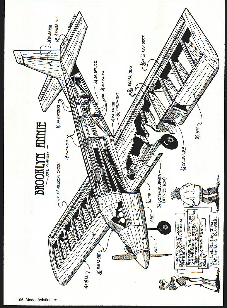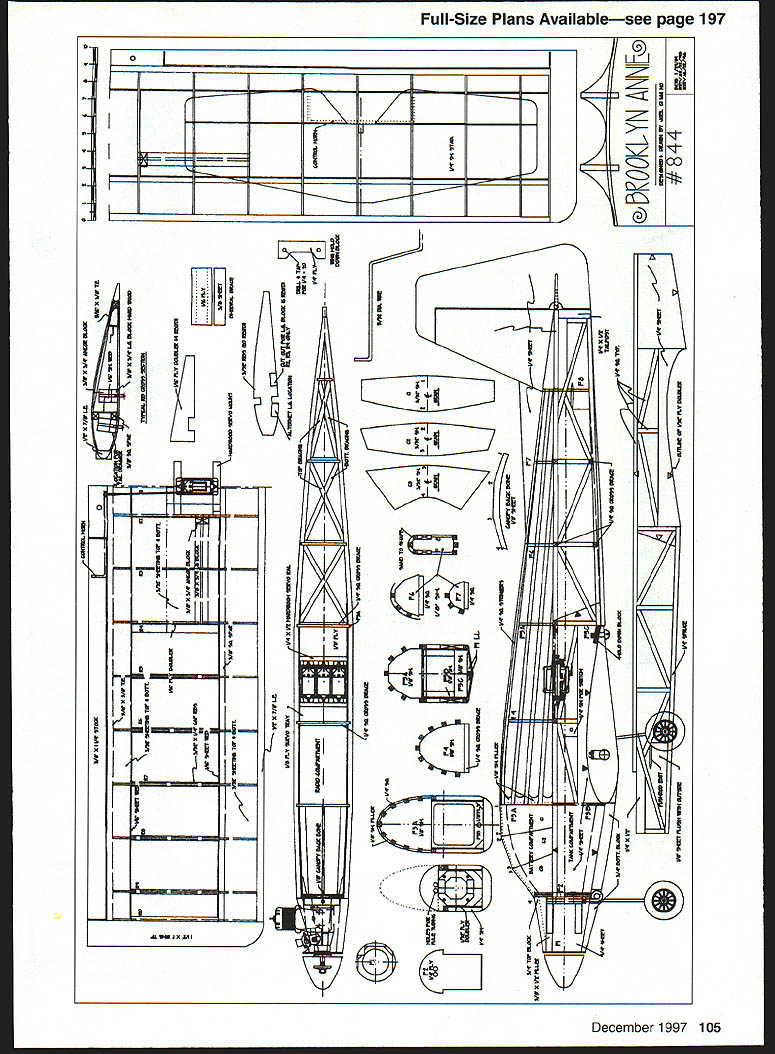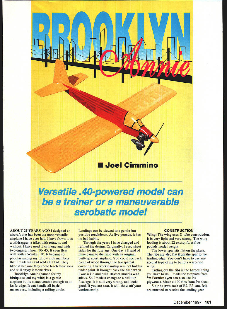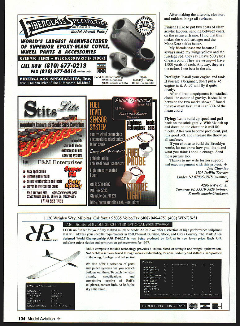 be trainer maneuverable aeroba tic model ABOUT 25 YEARS AGO designed aircraft has versatile airplane have ever have flown taildragger trike retracts have used with two engines 30-45 flew well Wankel 30 became popular among fellow club members made kits sold liked because could teach sons still enjoy themselves Brooklyn Annie named birthplace wife gentle airplane maneuverable enough knife-edge can handle basic maneuvers including rolling circle Landings can slowed gentle-butpositive touchdown five pounds has no bad habits Through years have changed refined design Originally used sheet sides fuselage day friend came field original built-up sport airplane could see piece wood through transparent covering workmanship hidden under paint brought back time kid built 10-cent models sticks So made change built-up fuselage still very strong looks good neat will show off workmanship CONSTRUCTION Wing The wing uses D-tube construction very light very strong wing loading about 22 ozIsq ft five pounds model weight lower spar sits flat plans ribs also flat spar trailing edge dont have use special type jig build warp-free wing Cutting out ribs hardest thing have made template 1A2 Formica can also use 46 plywood Make 20 ribs /32 sheet Six ribs two R2 R3 R4 notched receive landing gear December 1997 101 U Joel Cimmino Versatile E40 powered model can block make photocopy rib use glue stick buy stationery stores attach rib pattern template Lay down /8 square spars shown Glue ribs place trailing edge flat plans used Titebond II entire wing except noted Put top /s square spar place glue Glue /16 3/s x 3/ trailing edge rear ribs Sand shape Make trailing edge sheeting 3A2 sheet cut 26 1/2 inches long Cut sheet half 11/2 inches wide top bottom Save leftover 11 /2-inch piece center section sheeting Use cyanoacrylate CyA glue 1/2 X 7/ leading edge front edge ribs Center above below rib Cut leading edge sheeting 3A2 x 3 sheets Cut 26/2 inches long save leftover cut 7/ off edge sheet Bevel edge match angle formed top rib leading edge Glue place Cut glue A6 vertical webbing between rib Upon completion will form D-tube Finish top adding 2 cap ribs Sheet center section let dry Flip wing over add /16 rib doubler ribs #2 #4 Glue hardwood landing gear anchor block Follow same steps above complete bottom wing Make center spar brace adding /6 plywood side /8 sheet fit between top bottom spar See plan size shape inch dihedral under wingtip Glue wing halves together add wingtip blocks Fit aileron torque rods 6h TE stock glue place Make right left Shape sand wing set aside Fuselage Make sides re t Use very hard balsa basswood bottom longeron others can medium balsa neat can because will show up later Make formers Fl-F8 Following small triangle shown plan cut A2 plywood doubler glue side Make left right side Carefully mark location formers both sides Attach engine mount former F2 Glue F2 F3 F5 careful keep formers square sides can done fuselage upside down plan F2 hanging off building board good time install servo tray will help keep sides square Taper upper lower longerons tail post /8 inch Pull sides together glue formers F4 F6 F7 F8 tail post Cut fit t elevator saddle Glue re stringer F3a F8 Add tapered square fit between lower longerons tail post F5c Note forms V bottom Add re cross bracing bay Add t pushrod exits glue flush outside fuselage Add scrap t switch mount Add h top bottom nose blocks Glue filler block triangle block engine tank compartments Shape sand nose area Canopy In past made canopy blocks took too much carving sanding build plans dont want hunt down canopy fit project want now Buying can also expensive shown mold clear vinyl canopy Romano Garibaldi inventor Romair retracts club member great craftsman OK broke mold find better way Using method learned drafting course college developed sheet balsa canopy Its light strong easy build looks good No canopy buy Cut glue canopy backbone along centerline fuselage Cut canopy segments noting grain Dampen outside use CyA glue centerline segment C3 centerline backbone Bend segment around F2 trim meets top edge fuselage Glue place repeat C2 Cl CyA seams segments wish can build canopy first reinforce seams inside install fuselage trimming needed Fill behind F3a /s scraps Rudder Stab Cut sta b /4 sheet Glue stab top fuselage Keep square sides surfaces set 00 incidence Cut fit rudder /4 sheet Glue top stab fuselage Make strong joint Install fairing blocks sand shape Left Three versions Brooklyn Annie Variations have tried wingtip rudder elevator sizes 102 Model Aviation e Front end detail K&B 40 installed Author recommends less experienced fliers use 35 first ORATED Model Aircraft Parts WORLDS LARGEST MANUFACTURER OF SUPERIOR EPOXY-GLASS COWLS WNEEL PANTS B ACCESSORIES CALL NOW 810 677-0213 I FAX 810 6770414 ordars onlyI Sand $200 CanadaMonday Friday CalOpen Visit web Site liii //wksIIIs wi 22522 Auhuti Dais El Tore Co 92530-5N5 1145031455 After making ailerons elevator rudders hinge surfaces Finish I like put two coats clear acrylic lacquer sanding between coats entire airframe find makes wood stronger MonoKote sticks better friends tease because always make wings yellow fuselage red say have 500 yards color wrongI have 1000 yards Anyway colors see best air Preflight Install engine tank beginner dont put 45 engine 35 will fly quite nicely After radio equipment installed check center gravity should between two marks shown found rear mark best 30% mean chord Flying Let build up speed pull back stick gently 3/ inch up down elevator will lift nicely After become proficient put good 40 increase throw surfaces choose build Brooklyn Annie let know like what think should change Send picture too Thanks wife support encouragement project Cimmino 1701 DeWitt Terrace Linden NJ 07036-3818 summer 4206 NW 47th St Tamarac FL 33319-5820 winter E-mail anncim@aolcom 1120 Wrigley Way Milpitas California 95035 Voice/Fax 408 946-4751 408 WINGS-S 1 LOOK no further fully molded sailplane needs Rn