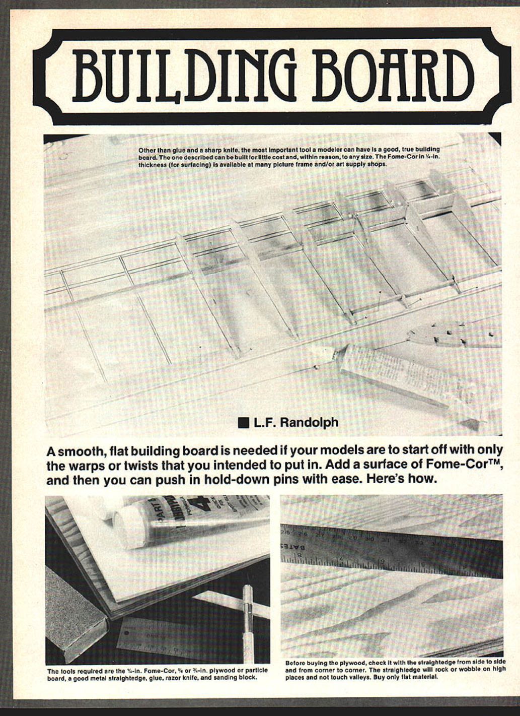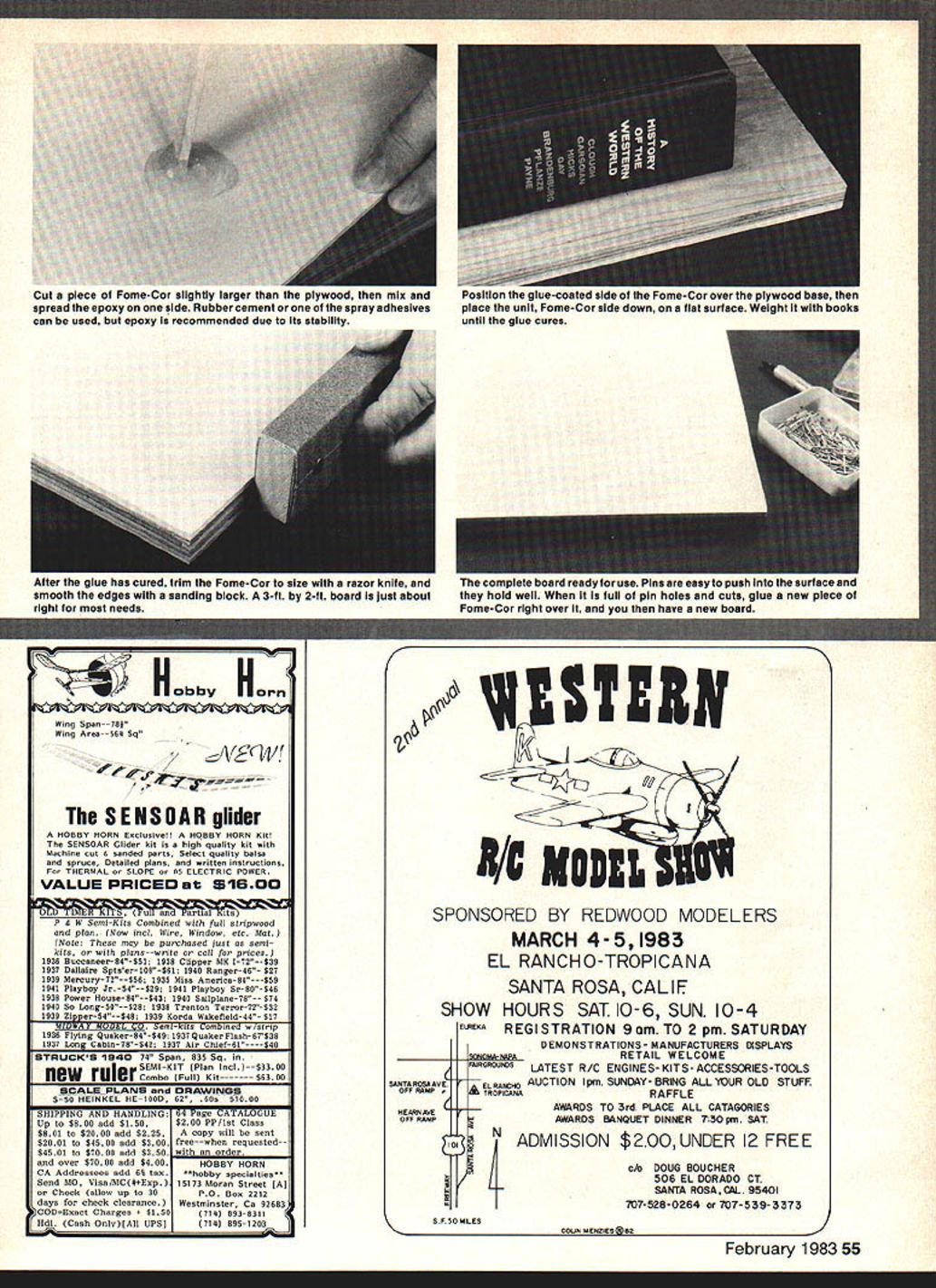 BUILDIHO BOFUID Ii ulit little c able ooth flat building board needed models start off warps twists intended put Add surface FomeCorTM can push hold-down pins ease Heres tools requlrea inc v-In ome-or S/s 3/-ln plywood particle board good metal straIghtedge glue razor knIfe sandIng block U ylng plywood check straIghtedge side sioc corner corner straIghtedge will rock wobble hIgh places touch valleys Buy flat material H0~ Horn Wing Span--718 Wing Area--tAg Sq JVW SOAR glider HOBBY HORN Eaclusive HOBBY HORN Kit SENSOAR Clider kit high quality kit Machine cutsanded parts Select qual ty balsa spruce Detailed plans Cr tten nstructons THERMAL SLOPE nr 05 ELECTRIC POWER VALUE PRICED 51600 P & W Semi-Kito Combined full stripwood plan Now md Wire Window etc Mat Note Theoe may purchased juoI oemi kita pIano--write call pricea 1936 Buceaneer84-$51 1938 Clipper MK l72-$39 1937 Dallaire Sptaer-lt8$6l 1940 Ranger-46 $27 1939 Mercury72$56 1935 Miss Aiaerica94-S19 1941 Playboy Jr -54929 t941 Playboy Sr00$40 1939 Power House94-943 1940 Sailplane-78-- $74 t940 So Long50929 1938 Trenton Terror-73-533 1939 Zipper54948 1939 Korda tilakefield-44 917 MIDWAY MuiJcL CO Semi-kits Coisbined w/olrip 1936 FlyIng Quaker94$49 1937 Quaker Flask-07138 1937 Long Cabin7S542 1937 Air Cbief61--$40 STRUCKS 1940 711 Span 831 Sq meal SEMI-KIT Plan lnclI--S3300 NUW ruler Combo Pull Kit $6309 9CALRPLANS OHAWINGS 550 HEINKEL HEbOO 62 60s $1000 SHIPPING AND HANDLING 04 Page CATALOGUE Up $800 add $150$200 PP/lot Class $801 $2000 odd $321A Copy will sent $2001 $4500 odd $300 freewhen requested-$4501 $7000 odd $350 order end over $7000 add $400 HOBBY HORN CA Addressees add 6% tOX50hobby specialtieson Send 510 Viso/MC#Eap15t73 Moran Street [Al Check allow up 30 Boa 3212 days check ctearanceWestminster Ca 92603 jCODEaact Charges o $150 0930311 Hdl Cash Gntv[AlI UPSI 0911203 6 SPONSORED BY REDWOOD MODELERS MARCH 4-5 1983 EL RANCHO-TROPICANA SANTA ROSA9 CALIF SHOW HOURS SAT 10-6 SUN 10-4 ELCERA REGISTRATION 9am TO 2pm SATURDAY DEMONSTRATIONS- MANUFACTURERS DISPLAYS RETAIL WELCOME mlRaRooNaa LATEST R/C ENGINES-KITS ACCESSORIES -TOOLS SANTA ROSOAVE ELRANCIIO AUCTION pm SUNDAY- BRING ALLIUR OLD STUFF OFF RAMP - TROPICANARAFFLE IIEARNAVEAWARDS TO 3rd PLACE ALL CATAGORIES OPP RAMPAWARDS BANQUET DINNER 730 pm SAT 101ADMISSION $2OOUNDER 12 FREE x K cM DOUG BOUCHER 506 EL DORADO CT SANTA ROSACAL 95401 707-528-0264 or 707-539-3373 SP 50 MILES piece Fome-Cor slightly largm EEaEEEm pyuu spread epoxy side Rubber cement spray adhesives can used bui epoxy recommended due its stability UI Erie ruiuie-sur uver Erie PEYNYMUM Mace Eli down fiat surface WeIght wIth books Ailer glue has nile runruv-s.ur Eu ilil raw annie arm smooth ihe edges wlih sanding block 3-ft 2-ft board just about right needs C uunnipieie Muaru reauy Eu use rimh arm easy Eu U5O mu Erie sun nauc aniu hold well ills full pin holes cuts glue new piece Fome-Cor right over hsve new board February 1983 55