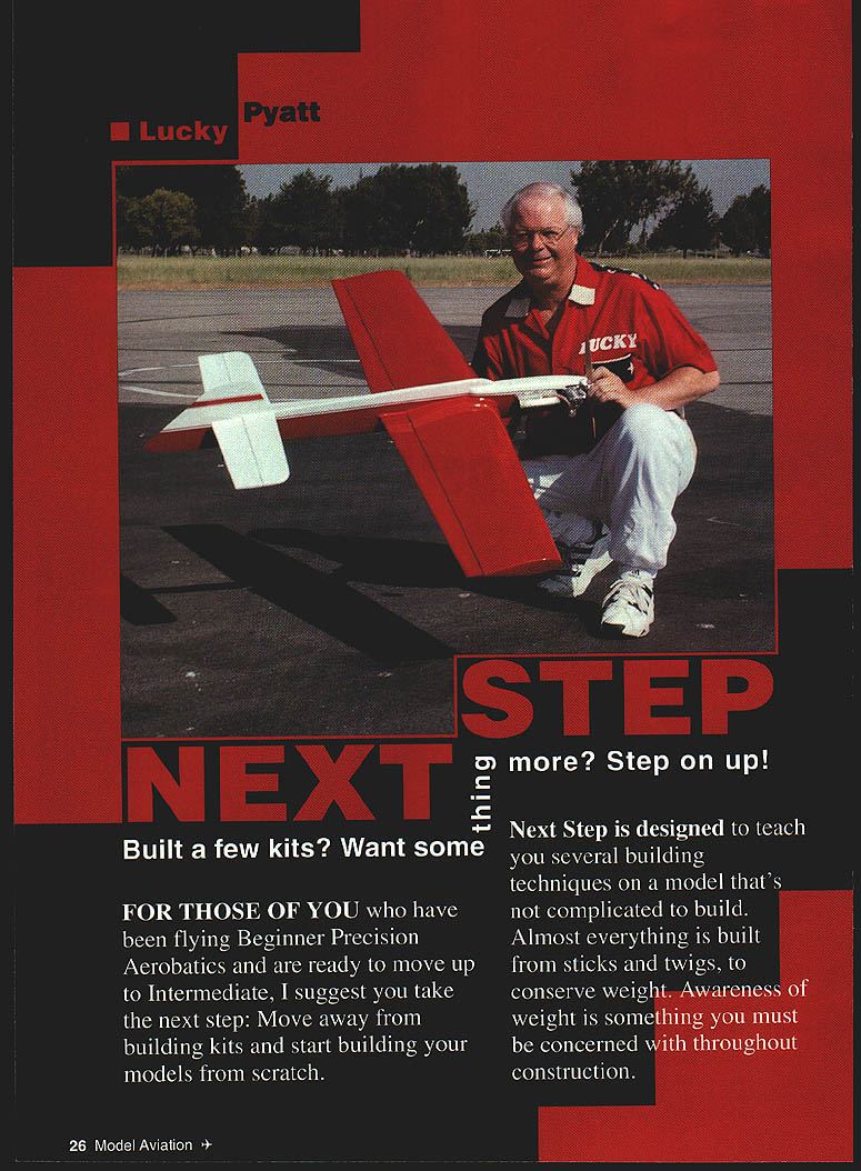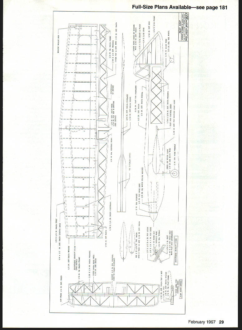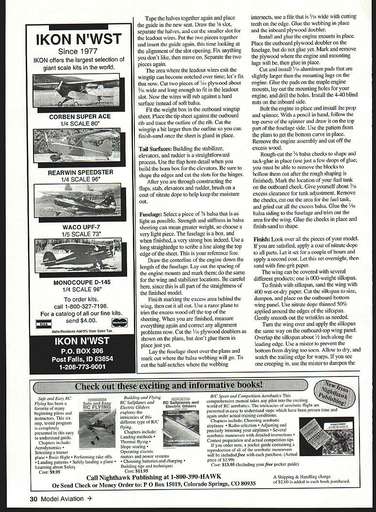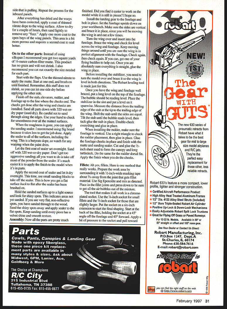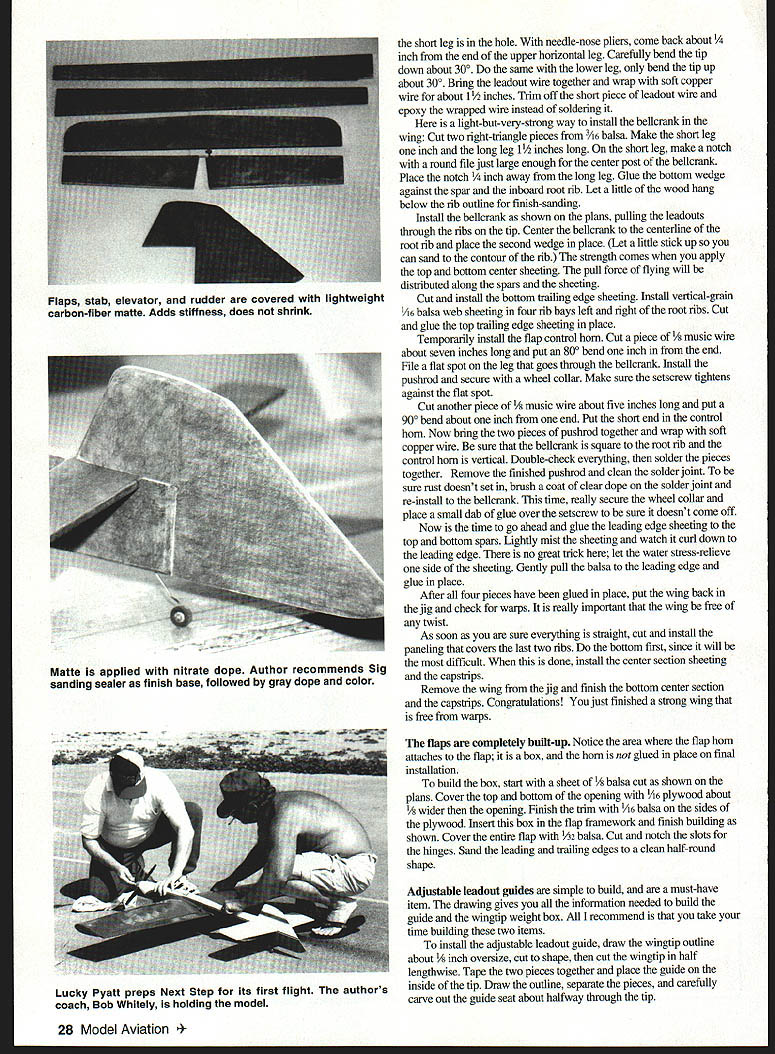 NO OCR TEXT Ill also introduce new method finishing saves weight Whats purpose get habit thinking terms weight reduction CONSTRUCTION Wing suggest start wing since timeconsuming build make straight wing need have straight flat building surface Lay out wing plan tape down Build 10 support jigs a easiest way make cut sheet two inches wide lengthwise Mark off 2-inch widths cut 20 pieces Zona saw miter box Make braces same manner cut 1-inch squares Slice 1-inch squares diagonal fmished should have 20 triangles Assemble jigs gluing two triangular braces horizontal leg brace Take care edge brace lines up edge leg square set vertical plate jig against braces align end horizontal leg glue end product L-shaped bracket becomes support jig wing frame Place two jigs end wing plan lining up last rib suggest place right triangle directly over outer rib line burt jig up vertical edge Tape jig place repeat other three jigs jig nearest make mark two inches off work surface same jig other wingtip Stick pin marks run thread over other mark Carefully measure along thread see work surface really flat Lets assume center wing surface lower tips mark center jigs 2 inches See method works Wherever place jig measure against datum thread mark accordingly Place two jigs centerline wingone leading edge trailing edge Go out about halfway wing place jigs along leading trading edges Carefully set leading edge trailing edge balsa place pin centerline jigs Lets cut some ribs two ways to cut root tip template A2 plywood stack bunch balsa blanks between templates bolt together sand away Use Zona saw cut leading edge spar notches unbolt number ribs match drawing Another way use computer program correctly size rib root rib NACA 0015 tip NACA 0018 Print ribs cut paper Use rubber cement glue paper template balsa Place another 1/16 sheet under first carefully cut out rib now have two ribs cut template simple Peel paper off clean off excess rubber cement No matter method use carefully remove excess center ribs leaving about around edges Type CL Precision Aerobatics Wingspan 51 inches Engine 40 -46 glow Flying Weight 35 40 ounces Construction Built-up Covering/finish Silkspan dope Slide tip ribs place tack-glue trailing edge Set next rib place using right triangle line up rib over drawing assure rib vertical Continue until ribs place Glue leading trailing edges ribs Measure cut lay top bottom spars glue place plans call four-inch bellcrank installed want use three-inch thats OK highly recommend using four-inch bellcrank made carbon fiber because its superior strength light weight Cut 1/i6 brass copper tubing two-inch lengths Insert leadout wire through tubing letting about six inches hang out end Grip tubing center needle-nose pliers slowly bend tubing 900 both ends pointing same direction Insert U-shaped tubing through leadout hole bellcrani February 1997 27 Computer-generated rib patterns glued 1/16 balsa trimmed shape Alternate method stack rib blanks sand shape Wing jigs place small triangle used align ribs plans assure vertical Fuselage cheek blocks shaped hollowed prior final installation short leg hole needle-nose pliers come back about inch end upper horizontal leg Carefully bend tip down about 300 same lower leg bend tip up about 300 Bring leadout wire together wrap soft copper wire about 1 inches Trim off short piece leadout wire epoxy wrapped wire instead soldering light-but-very-strong way install bellcrank wing Cut two right-triangle pieces /6 balsa Make short leg inch long leg 1 inches long short leg make notch round file just large enough center post bellcrank Place notch away long leg Glue bottom wedge against spar inboard root rib Let little wood hang below rib outline finish-sanding Install belicrank shown plans pulling leadouts through ribs tip Center belicrank centerline root rib place second wedge place Let little stick up can sand contour rib strength comes apply top bottom center sheeting pull force flying will distributed along spars sheeting Cut install bottom trailing edge sheeting Install vertical-grain /16 balsa web sheeting four rib bays left right root ribs Cut glue top trailing edge sheeting place Temporarily install flap control horn Cut piece /8 music wire about seven inches long put 800 bend inch end File flat spot leg goes through bellcrank Install pushrod secure wheel collar Make sure setscrew tightens against flat spot Cut another piece 1/8 music wire about five inches long put 900 bend about inch end Put short end control horn Now bring two pieces pushrod together wrap soft copper wire sure bellcrank square root rib control horn vertical Double-check everything solder pieces together Remove finished pushrod clean solder joint sure rust doesnt set brush coat clear dope solder joint re-install bellcrank time really secure wheel collar place small dab glue over setscrew sure doesnt come off Now time go ahead glue leading edge sheeting top bottom spars Lightly mist sheeting watch curl down leading edge no great trick let water stress-relieve side sheeting Gently pull balsa leading edge glue place After four pieces have glued place put wing back jig check warps really important wing free twist As soon sure everything straight cut install paneling covers last two ribs bottom first since will difficult done install center section sheeting capstrips Remove wing jig finish bottom center section capstrips Congratulations just finished strong wing free warps flaps completely built-up Notice area flap horn attaches flap box horn glued place final installation build box start sheet balsa cut shown plans Cover top bottom opening A6 plywood about wider opening Finish trim A6 balsa sides plywood Insert box flap framework finish building shown Cover entire flap A2 balsa Cut notch slots hinges Sand leading trailing edges clean half-round shape Adjustable leadout guides simple build must-have item drawing gives information needed build guide wingtip weight box recommend take time building two items install adju