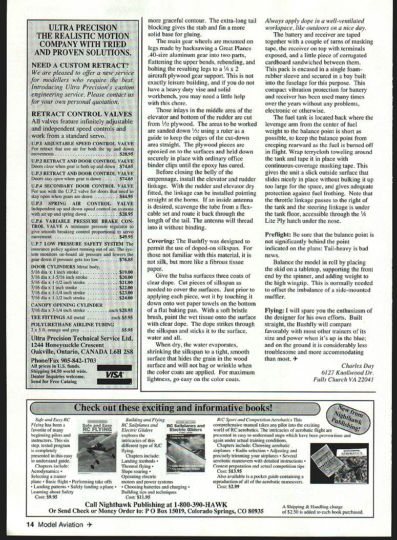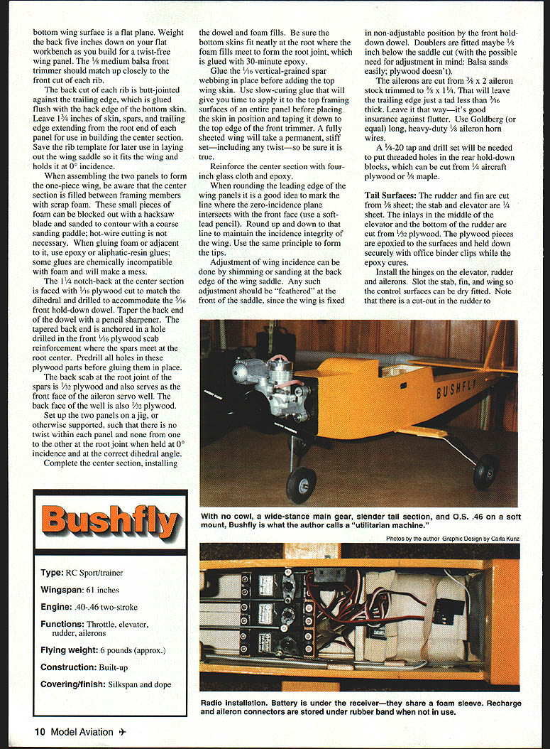 Functional 46powered model just fun FOR SOME FLIERS participation relatively basic level acrobatic skill enough work put something supposed fun Bushfly put together lust fun fraternity mind absence cowl semi ultralight configuration resulted effort keep model simple possible However structural details complicated necessary hold finished product up what consider reasonably decent standard quality based observation experiences field over years such detail 17-inch wheel-to wheel stance main gear Its purpose give high-wing trainer same ground-handling stability low-wing model main gear mounted wide apart normally found Pattern model example overshot landing Bushfly can circled up still speed rollout tipping up grounding prop Another feature involves little extra building effort 1/32 plywood inlay both sides middle area elevator bottom area rudder gives firm no-slop footing horns adds strength deflection needed leaves balsa core clear easy hinge-slotting prevents warpage/splitting adds insignificant amount weight Bushfly uses scrap foam fillers open spaces center section otherwise fully sheeted frame wing way borrowing simplicity fully bridged strength conventional foam-core wing root joint center section weight glue coated both sides conventionally constructed foam-core wing panel Bushfly weighs about six pounds dry give take including soft engine mount four standard servos arrow-shafttype linkage elevator rudder aircraft plywood landing gear spreader 46 engine tank 2-inch spinner prop CONSTRUCTION As project read way through construction text turn brain before studying plans use thin cyanoacrylate CyA glue fast assembly put waxed paper under work lest discover structure has glued itself down firmly workbench Some suppliers Lone Star instance sell 4-6-lb very light sheet Unless otherwise noted blocking sheet Bushfly thicker /s extra-light few pennies some suppliers will select dead straight pieces requested such um balsa stab elevator Wing Make right left panel Construct frames integral bottom skins gluing individual framing members down skin build Trim back edge skin sharp X-Acto knife metal straightedge least 30 inches long supplier sands wing skins down thin side use /32 otherwise use A6 Make rib template stiff card stock scrap 2 plywood sharp pair tin snips makes short work trimming thin plywood two ribs sides center section cut 3A6 light balsa others cut medium-weight 3A2 cut stack make sure match up Notches spars first five inboard ribs er accept /g x 3/ spar doublers main spars i/is x 3/ hard straight-grained balsa Place bottom spar its doubler position glue ribs place install top spars Notice back five inches 8 Model Aviation om wing surface flat plane Weight back five inches down flat workbench build twist-free wing panel 1/ medium balsa front trimmer should match up closely front cut rib back cut rib butt-jointed against trailing edge glued flush back edge bottom skin Leave 13h inches skin spars trailing edge extending root end panel use building center section Save rib template later use laying out wing saddle fits wing holds 00 incidence assembling two panels form one-piece wing aware center section filled between framing members scrap foam small pieces foam can blocked out hacksaw blade sanded contour coarse sanding paddle hot-wire cutting necessary gluing foam adjacent use epoxy aliphatic-resin glues some glues chemically incompatible foam will make mess 1 h-back center section faced A6 plywood cut match dihedral drilled accommodate /6 front hold-down dowel Taper back end dowel pencil sharpener tapered back end anchored hole drilled front A6 plywood scab reinforcement spars meet root center Predrill holes plywood parts before gluing place back scab root joint spars /32 plywood also serves front face aileron servo well back face well also 1/32 plywood Set up two panels jig otherwise supported such no twist within panel other root joint held 00 incidence correct dihedral angle Complete center section installing dowel foam fills sure bottom skins fit neatly root foam fills meet form root joint glued 30-minute epoxy Glue A6 vertical-grained spar webbing place before adding top wing skin Use slow-curing glue will give time apply top framing surfaces entire panel before placing skin position taping down top edge front trimmer fully sheeted wing will take permanent stiff setincluding twistso sure true Reinforce center section fourinch glass cloth epoxy rounding leading edge wing panels good idea mark line zero-incidence plane intersects front face use softlead pencil Round up down line maintain incidence integrity wing Use same principle form tips Adjustment wing incidence can done shimming sanding back edge wing saddle Any such adjustment should feathered front saddle since wing fixed non-adjustable position front holddown dowel Doublers fitted maybe 1/s inch below saddle cut possible need adjustment mind Balsa sands easily plywood doesnt ailerons cut 3/ x 2 aileron stock trimmed 3/ x 1 will leave trailing edge just tad less 3/ts thick Leave wayits good insurance against flutter Use Goldberg equal long heavy-duty /8 aileron horn wires -20 tap drill set will needed put threaded holes rear hold-down blocks can cut raft plywood 3/ maple Tail Surfaces rudder fin cut 3/ sheet stab elevator sheet inlays middle elevator bottom rudder cut 1A2 plywood plywood pieces epoxied surfaces held down securely office binder clips epoxy cures Install hinges elevator rudder ailerons Slot stab fin wing control surfaces can dry fitted Note cut-out rudder 10 Model Aviation owl wide-stance main gear slender tail section OS 46 soft mount Bushfly what author calls utilitarian machine Photos author Graphic Desion carla Kunz Functions Throttle elevator rudder ailerons Type RC Sportltrainer Wingspan 61 inches Engine 40-46 two-stroke Flying weight 6 pounds approx Construction Built-up Covering/finish Silkspan dope Radio installation Battery under receiverthey share foam sleeve Recharge aileron connectors stored u