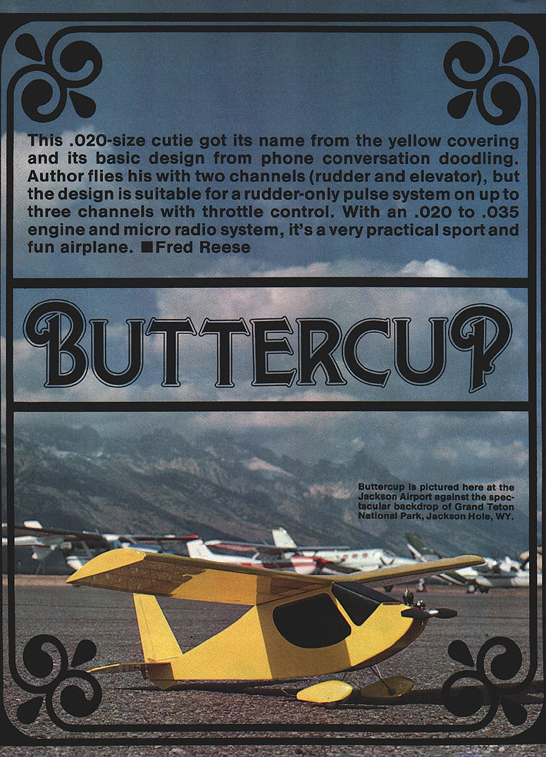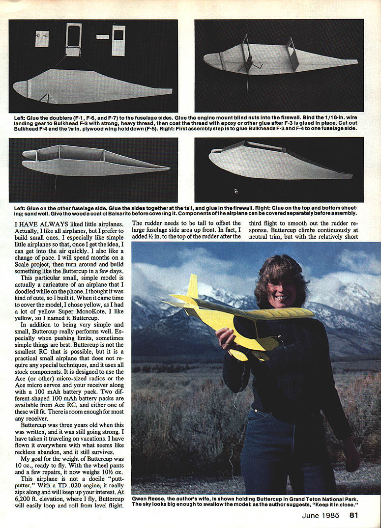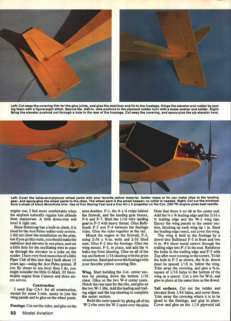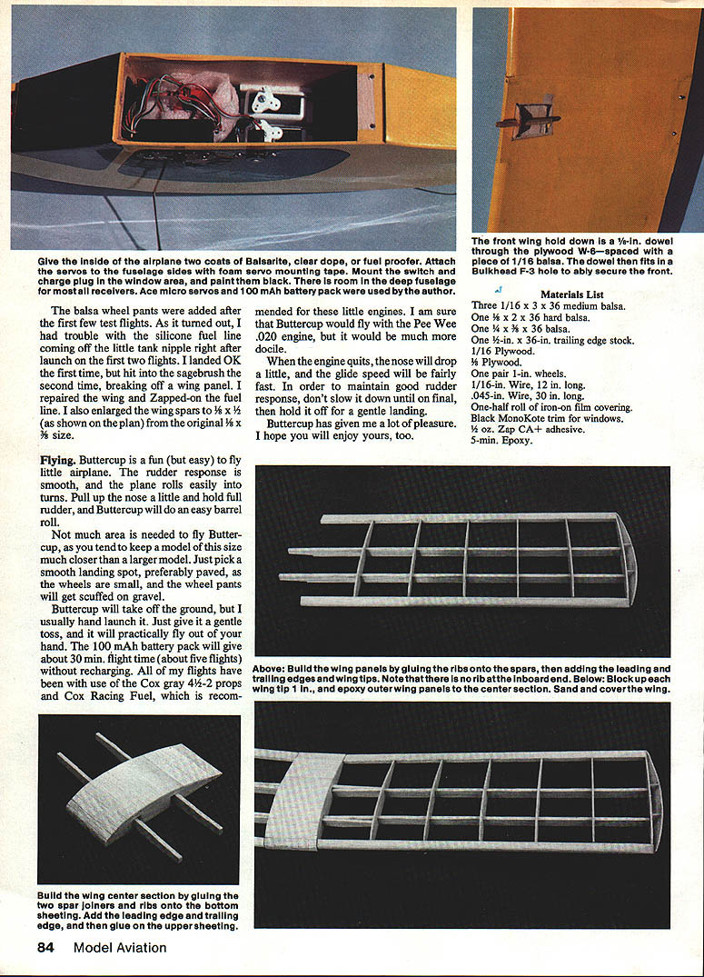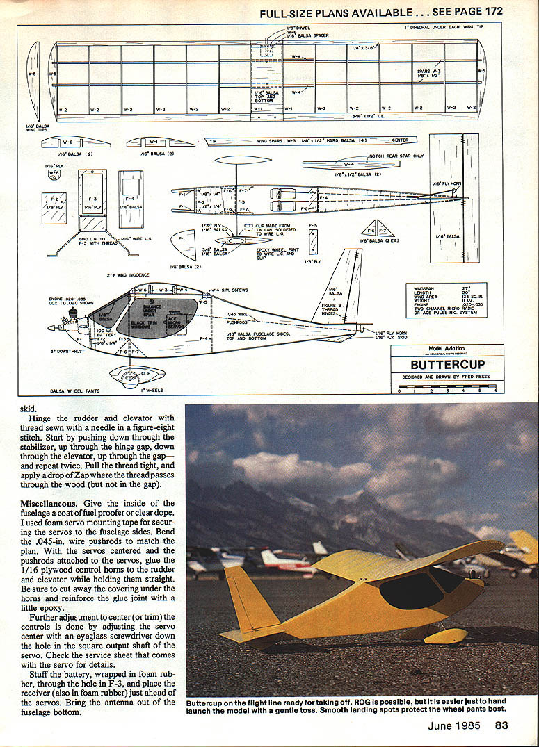 NO OCR TEXT Left Glue doublers F-i F-B F-7 fuselage sides Glue engine mount blind nuts firewall Bind ill 6-in wire landing gear Bulkhead F-3 strong heavy thread coat thread epoxy other glue after F-3 glued place Cut out Bulkhead F-4 Vs-In plywood wing hold down F-5 Right First assembly step glue Bulkheads F-3 F-4 fuselage side HAVE ALWAYS liked little airplanes Actually like airplanes prefer build small ones especially like simple little airplanes once get idea can get air quickly also like change pace will spend months Scale project turn around build something like Buttercup few days particular small simple model actually caricature airplane doodled phone Ithought kind cute built came time cover model chose yellow lot yellow Super MonoKote like yellow named Buttercup addition being very simple small Buttercup really performs well Es pecially pushing limits sometimes simple things best Buttercup smallest RC possible practical small airplane does re quire special techniques uses stock components designed use Ace other micro-sized radios Ace micro servos receiver along 100 niAh battery pack Two dif ferent-shaped 100 mAli battery packs available Ace RC either will fit room enough receiver Buttercup three years old written still going strong have taken traveling vacations have flown everywhere what seems like reckless abandon still survives goal weight Buttercup 10 oz ready fly wheel pants few repairs now weighs 10V2 oz airplane docile putt putter TD 020 engine really zips along will keep up interest 6200 ft elevation fly Buttercup will easily loop roll level flight third flight smooth out rudder re sponse Buttercup climbs continuously neutral trim relatively short Left Glue other fuselage side Glue sides together tall glue firewall Right Glue top bottom sheet ing sand well Give thewood coat Balsarite before covering Components airplane can covered separately before assembly rudder needs tall offset large fuselage side area up front fact added 1A top rudder after 2wuiI nuuuu IOU UUIflUFU wiiu u unuwn nuluing nuurcup urana i awn riationsi iarK sky looks big enough swallow model author suggests Keep close Left Cut away covering film gius joints glue stabilizer fin fuselage Hinge elevator rudder sew ing figure-eight stitch Secure 045-in wire pushrod plywood rudder horn brass washer solder Right Bring elevator pushrod out through hole rear fuselage Cut away covering epoxy-glue ply elevator horn Left Cover balsa-and-plywood wheel pants favorite yellow material Solder brass tin can metal clips landing gear epoxy-glue wheel pants clips wheel pant wheel keeper no collar needed Right Cut out windows sheet black MonoKote trim Use Cox Racing Fuel Cox 41/2 x 2 propeiler Cox 020 TD engine gives best results engine run feel comfortable airplane naturally regains lost altitude maneuvers little down-trim will level right out Since Buttercup has built-in climb ideal Ace Pulse rudder-only system did show installation plan go route should make stabilizer elevator piece cut little hole oscillating wire pass up through elevator yoke th rudder have very fond memories little Piper Cub size built about 15 years agousing Ace Pulse system fly closer sea level might consider little G-Mark 03 throt tleable engine Cannon three mi cro servos Construction used Zap CA construction except some 5-mm epoxy join wing panels glue wheel pants Fuselage Cutout sides glue nose doubler F-i trips behind firewall landing gear braces F-6 F-7 Bind 1/16 wire landing gear F-3 heavy thread Glue Bulk heads F-3 F-4 between fuselage sides Glue sides together tail Mount engine firewall F-2 using 2-56 x -in bolts 2-56 blind nuts Glue F-2 fuselage Glue wing mount F-5 place add balsa top front sheeting Glue top bottom 1/16 sheeting grain crosswise Sand cover fuselage favorite yellow covering film Wing Start building 2-in center sec tion pinning down bottom 1/16 sheet Glue two W-4 center spars Notch rear spar ribs glue two W- 1 ribs Add leading trail ing edges top sheeting complete center section Build outer panels gluing W-2 ribs onto W-3 spars over plan Note no rib center end Add eading edge 3/16 x trailing edge W-5 wing tips Epoxy wing panels center sec tion blocking up wing tip 1 Sand leading edge round cover wing wing held fuselage dowel Bulkhead F-3 front two -in *4 sheet metal screws through trailing edge F-S rear Reinforce holes trailing edge F-S Zap after once running-in screws hit hole F-3 shown -in dowel must spaced 1/16 below wing Trim away covering glue -in square 1/16 balsa bottom wing spacer Cut slot W-6 glue place same time dowel Tail surfaces Cut out rudder elevator 1/16 balsa cover Trim away covering glued fuselage glue place Cover glue 1/16 plywood tail 82 Model Aviation FULL-SIZE PLANS AVAILABLE . SEE PAGE 172 OBIADRAL WIDER EACH WRIG TIP II/A 3/5t JW-4 I1---SAITS W3 II/B I/2 Lizjiz.I - I/IA BALSA IW4 TOP ABS BOTTOM W-2W-2W-2W-2JWDw-olw-I - -2 -2 -2W-2W2 W2 3/16I/O T E I/IA BALSA ID I/IA PLY P3 VRPLIA PLI/1ABALSA Li BAlD S TOI/IA WIRE IS F3WITHWBG SPARS W-S 1/2 HARD BALSA 14 ER 1/16 BALSA ID REAR SPAR ONLY LW /6 Lzzz X I/BS 1/2 BALSA 121 F- F-7 I/Y2 PLYCUP MADE FROM I/RI BALSA TIN CAN SOLDERED FI 3/B BALSAEPOXY WiIEEL PANT I/IA BALSAIS WIRE LO ASIA CLIP I/B BALSA 121 2I WRIS INCIDENCE IS ii F-S 1/B PLY I/B BALSA ID EAI 1/A PLY BOWl I/IA BALSA WINOSPAN27 LENGTH20 WAdS AREA133 50 IN WEIGHTII 02 EBGBWi02003S TWO CHANNEL MICRO RADIO OR ACE PULSE 60 SYSTEM [MOdBI AviotlorI BUTTERCUP DESIGNED AND DRAWN BY FRED REESE BALSA WHEEL PARTS skid Hinge rudder elevator thread sewn needle figure-eight stitch Start pushing down through stabilizer up through hinge gap down through elevator up through gap repeat twice Pull thread tight apply adrop ofZapwherethethreadpasses through wood gap Miscellaneous Give inside fuselage coat fuel proofer clear dope used foam servo mounting tape secur ing servos fuselage sides Bend 045-in wire pushrods match plan servos centered pushrods attached servos glue 1/16 plywood control horns rudder elevator holding s