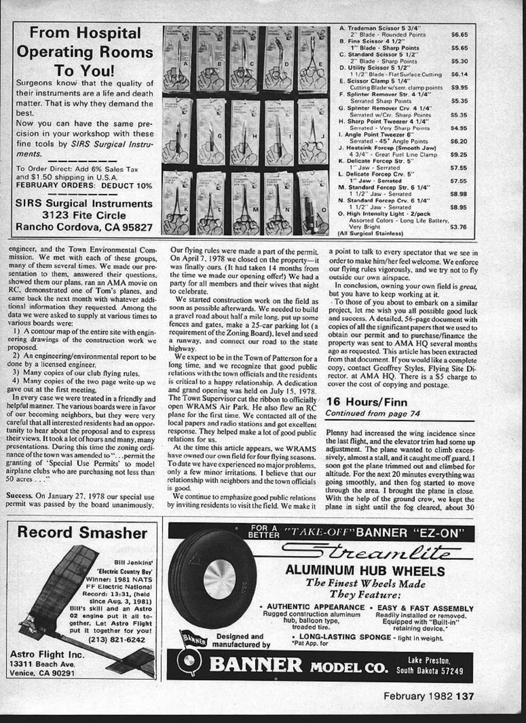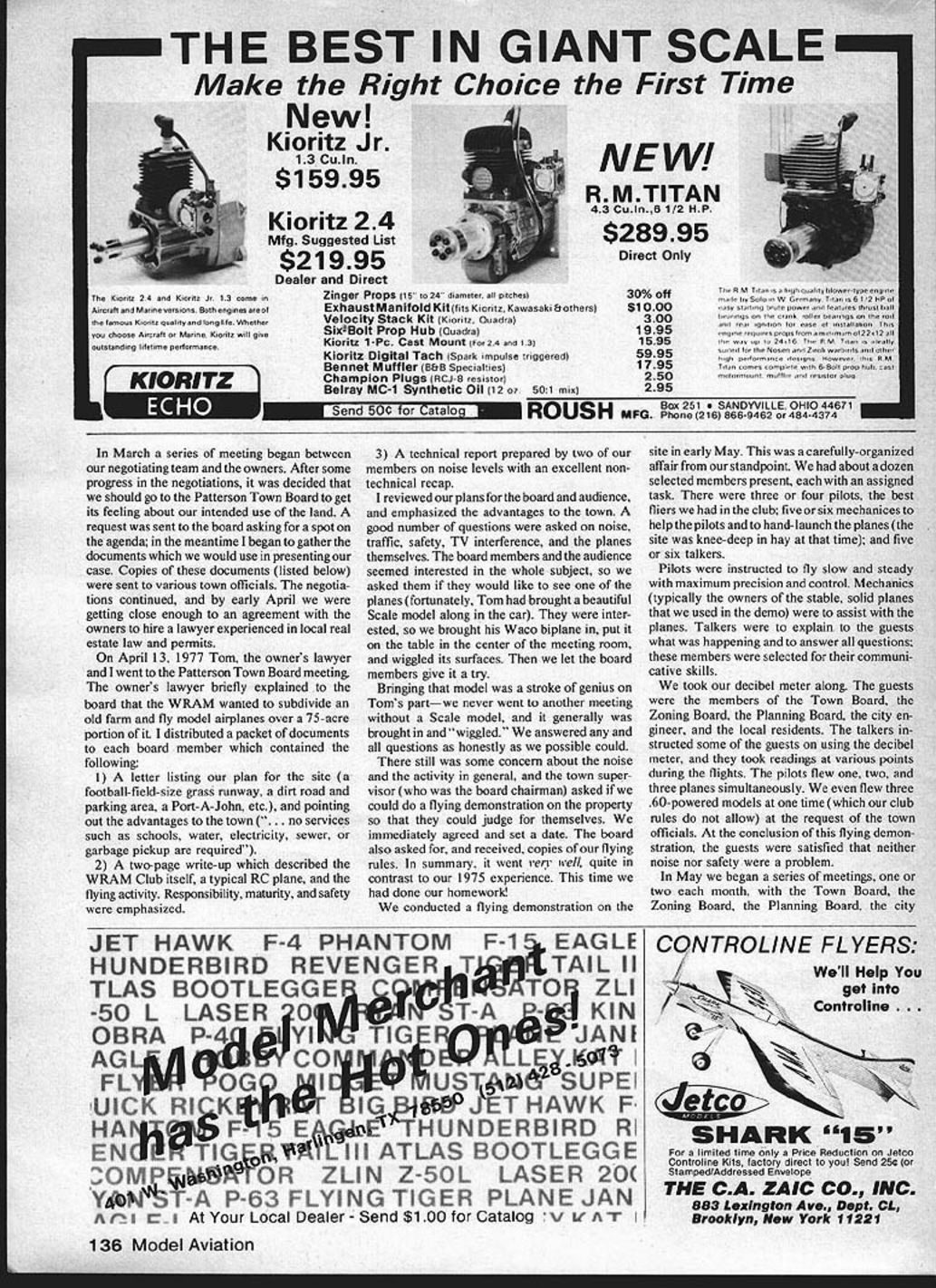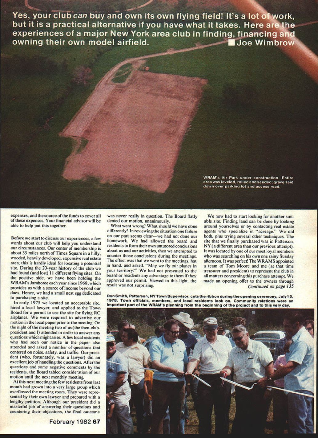 we amuunoi neevy equpnini wa iu~ay roao own Board required large parking lot approve plans GOOD FLYING SITES becoming increas ingly diflicult find problem certain get worse As result more clubs beginning wonder possible pur chase own field order solve problem permanently club starting think along lines perhaps can benefit some things learned experiences both good bad buying field may help avoid some mistakes made earlier attempts club WRAM Westchester Radio Aero Modelers New York 1978 successful purchasing excellent site obtaining special use permit purpose flying RC models techniques used should apply equally well other locations Control Line Free Flight fields Before success had time previous attempt purchase field learned great deal experience Although money first thing comes mind think purchasing afield several other factors should resolve before need consider method financing Among I You must incorporated general club cannot own land borrow money corpo ration can already incorporated check charter see permits 2 You need have clear idea what looking site before start look otherwise wont able recognize find includes instance much land need acres far away can some fixed point probably expressed terms travel time etc 3 The membership really must dedicated purchasing field 4 Professional financial advice needed can banker treasurer controller corporation institution can advise viability financial plan help arrange necessary loans 5 A lawyer should engaged know ledgeable local real estate law has experience obtaining local permits select individual until have picked site because local really means local Financing probably still concerned about money come lets look several options financing flying field several points general information consider preliminary evalua tion whether buy 1 In general banks like loan money unimproved land can get around having some members guarantee note effect become co-signers way did 2 Frequently seller will finance deal himself may want small amount down generally less 30% rest spread out over number years some cases brings him some tax advantages 3 Borrow money yourselves can probably best done selling bonds members bonds may retired paid oft future staggered dates Bonds may also held permanently active member until leaves club sold incoming member method becomes effect initiation fee 4 Perhaps several affluent members club could form separate corporation purchase site lease club amount equal taxes plus reasonable interest investment 5 A combination two methods financial advisor may think some others can recommend best thing will certainly need own information lender doesnt require financial statement clubs income expenses assets liabilities past several yearsand projection next several years should show estimates field purchasing carrying costs regular 1els displayed forthe grand opening Jnywere aemonstratea aurtng Inc festivities members always hand talk local citizens answer questions Don Smith Town Supervisor tries hand RC flying theassistance Butch Schroder WRAM made sure town officials clear understanding model aviation expenses source funds cover expenses financial advisor will able help put together Before start discuss experiences few words about club will help understand circumstances center membership about 35 miles north Times Square hilly wooded heavily developed expensive real estate area hardly ideal locating potential site During 20-year history club found lost 11 different flying sites positive side have holding WRAMs Jamboree year since 1968 provides us source income beyond dues Hence small nest egg dedicated purchasing site early 1975 located acceptable site hired local lawyer applied Town Board permit use site flying RC airplanes required advertise motion local paper prior meeting night meeting two us then-clubpresident attended order answer questions might arise few local residents seen notice paper also attended asked number questions centered noise safety traffic presi dent fortunately lawyer did excellent job handling questions After questions some negative comments residents Board tabled consideration motion until next monthly meeting next meeting few residents last month grown very large group overflowed meeting room repre sented own lawyer prepared lengthy petition Although president did masterful job answering questions countering objections final outcome February 1982 67 never really question Board flatly now start looking another suitdenied motion unanimously able site Finding land can done looking What went wrong What should have done around yourselves contacting real estate differently reviewing situation failure agents specialize acreage did part seems clearwe done both plus trying several other techniques homework allowed board site finally purchased Patterson residents form theirown untutored conclusions NY different area previous attempt about us activities attempted located loyal members counter conclusions during meetings searching own rainy Sunday effect went meetings hat afternoon Itwas perfect WRAMS appointed hand asked May fly planes team Tom Moore time territory presented treasurer president represent club board residents advantage matters concerning purchase attempt approved permit Viewed light made opening offer owners through result surprising Continued page 135 Don Smith Patterson NYTown Supervisor cuts ribbon during opening ceremony July15 1g78 Town officials members local residents look Community relations numbers ground single rope correspond matching order pair models placed pits mark few minutes before round starts helpers can easily determine lines proper length hintsomeone will always try bow outer rope get handle fit margin can check line diameter condition pull-test make sure different colored streamers tied right spot processing done before first match starts youll free judge contestants will know have certain amount time prepare between rounds Rope off proces sing area lines wont destroyed allow just 